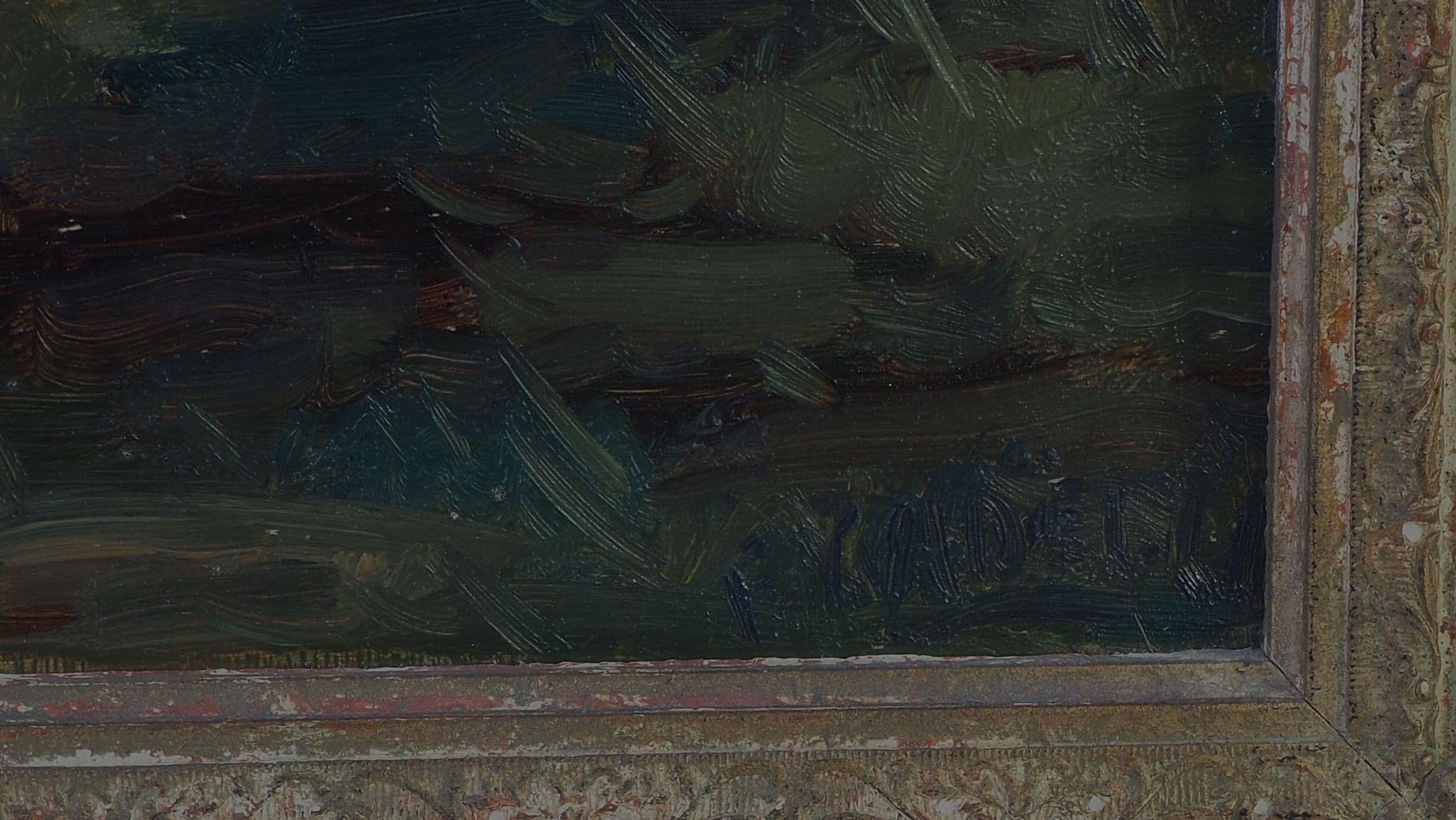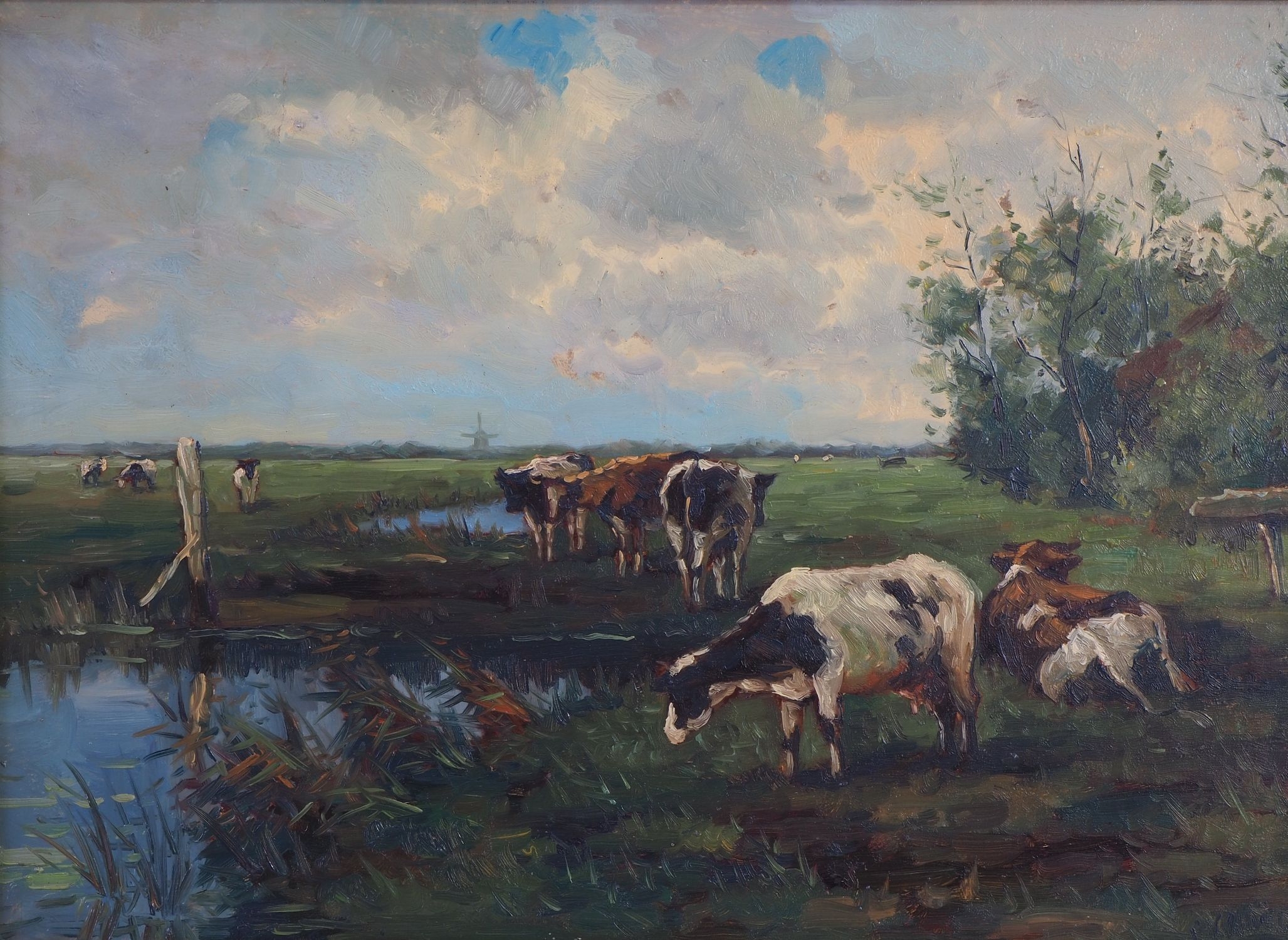 Öl auf Leinwand in einem stuckierten, mit Goldfarbe und Rot bemalten Holzrahmen gerahmt. Auf einer weiten Ebene hinter einem Deich mit einer Windmühle grast eine Herde Kühe. Im Vordergrund an einem Gewässer machen fünf davon eine Pause, rechts von ihnen ist ein Gebäude zwischen Bäumen zu erkennen. Über der weiten Landschaft spannt sich ein blauer Himmel mit vielen Wolken. Unten recht unleserlich signiert. Maße: Rahmenmaß ca. 87 x 68 cm, Bildmaß ca. 68 x 49 cm. Guter Erhaltungszustand mit Alters- und Gebrauchsspuren, wohl Originalrahmen, kleinere Reparaturstellen.