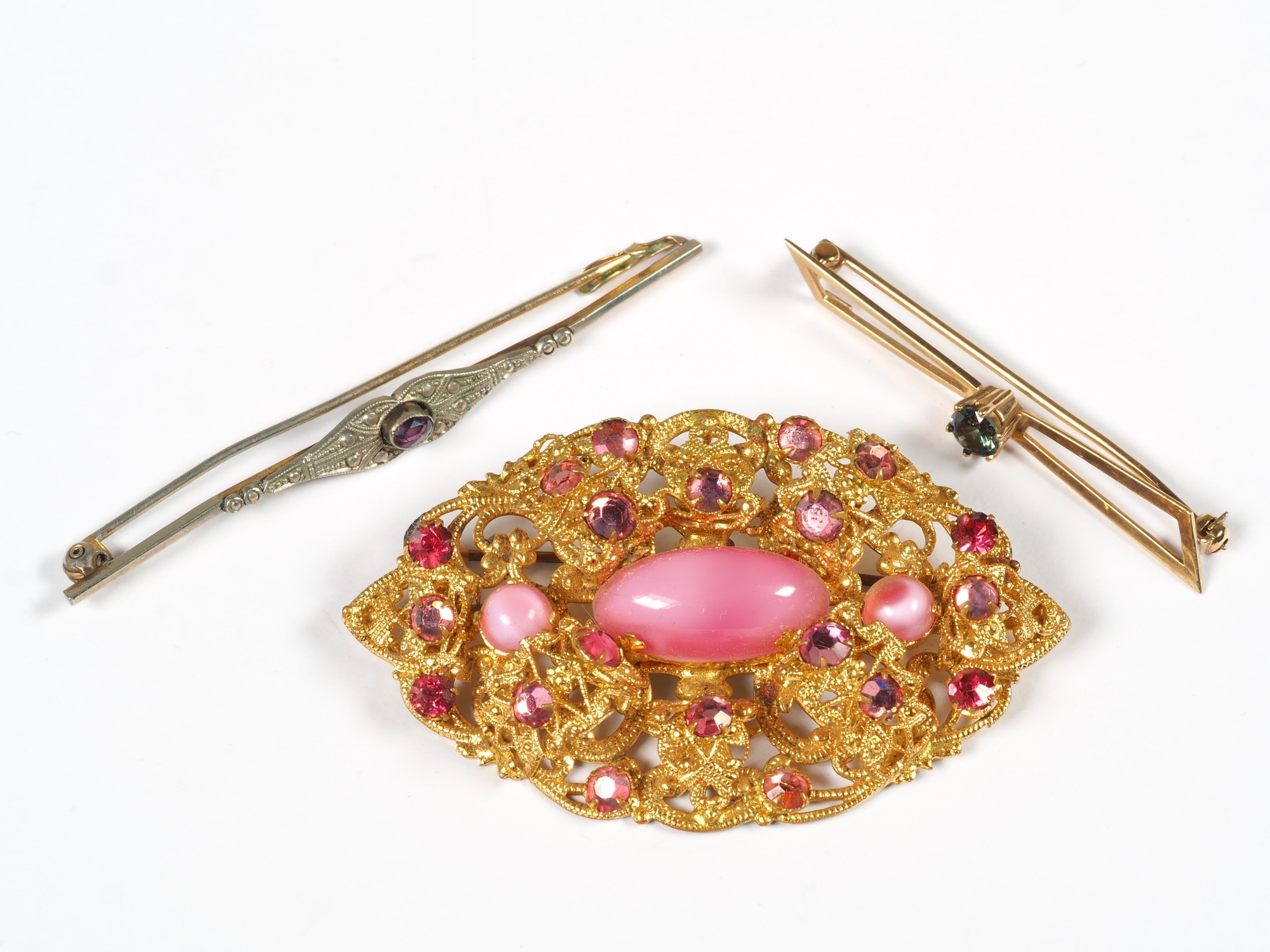 3 Broschen, eine davon 8K / 333 Gelbgold mit Spinell.