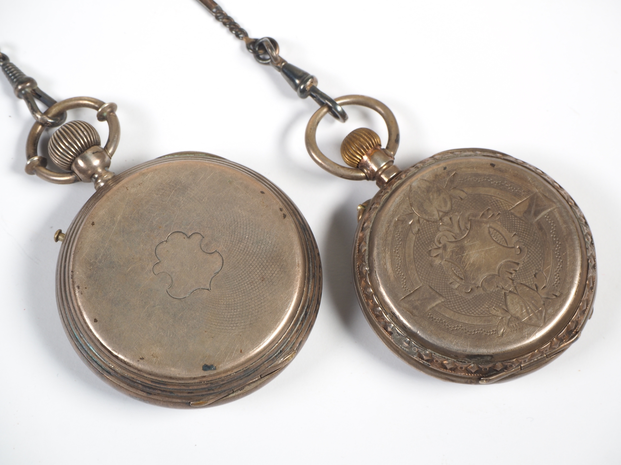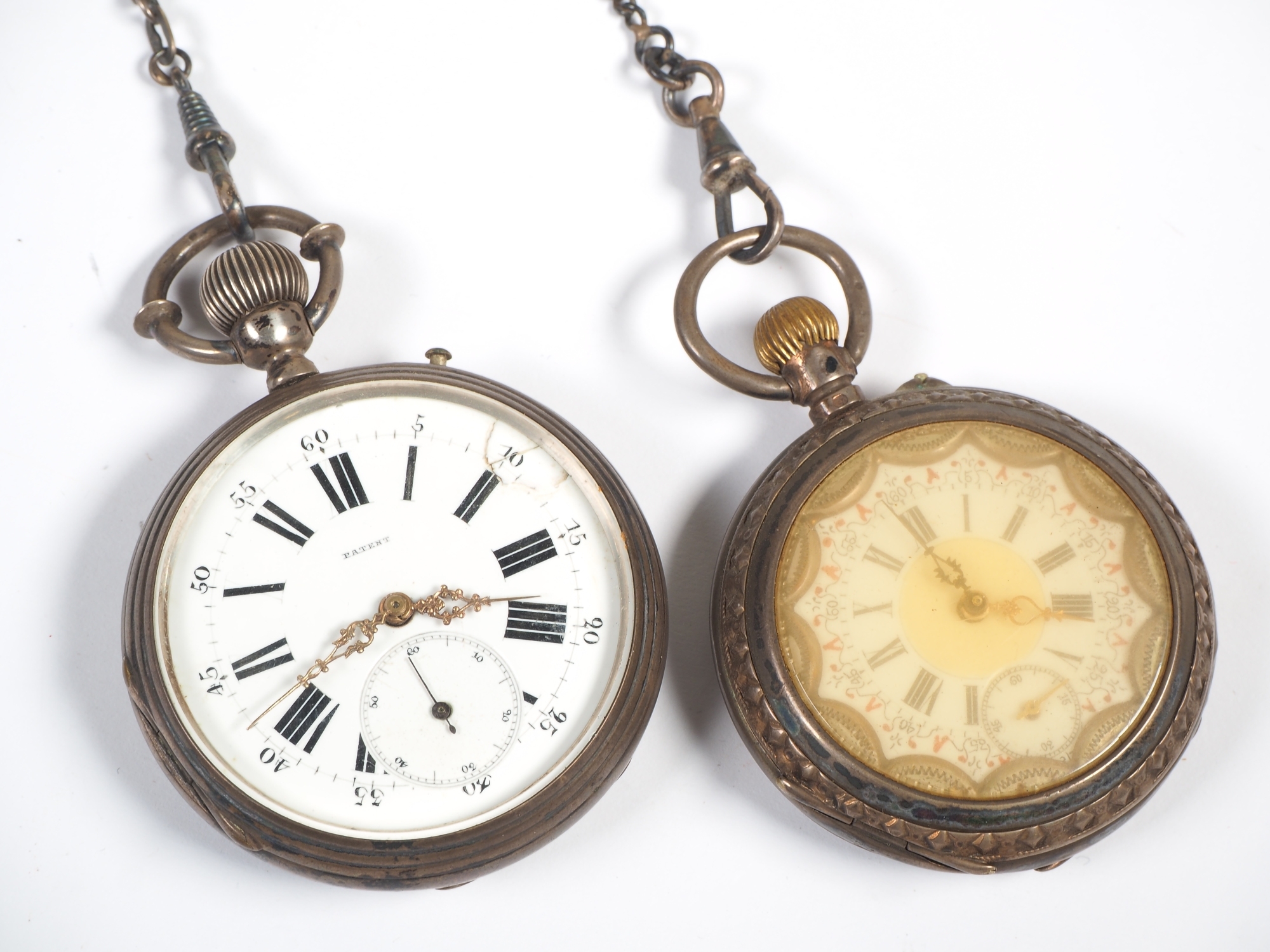 Ø 48mm / 51mm. Beide mit Silber Uhrenkette. Eine mit Emaille Schaden im Zifferblatt. Beide funktionsfähig.