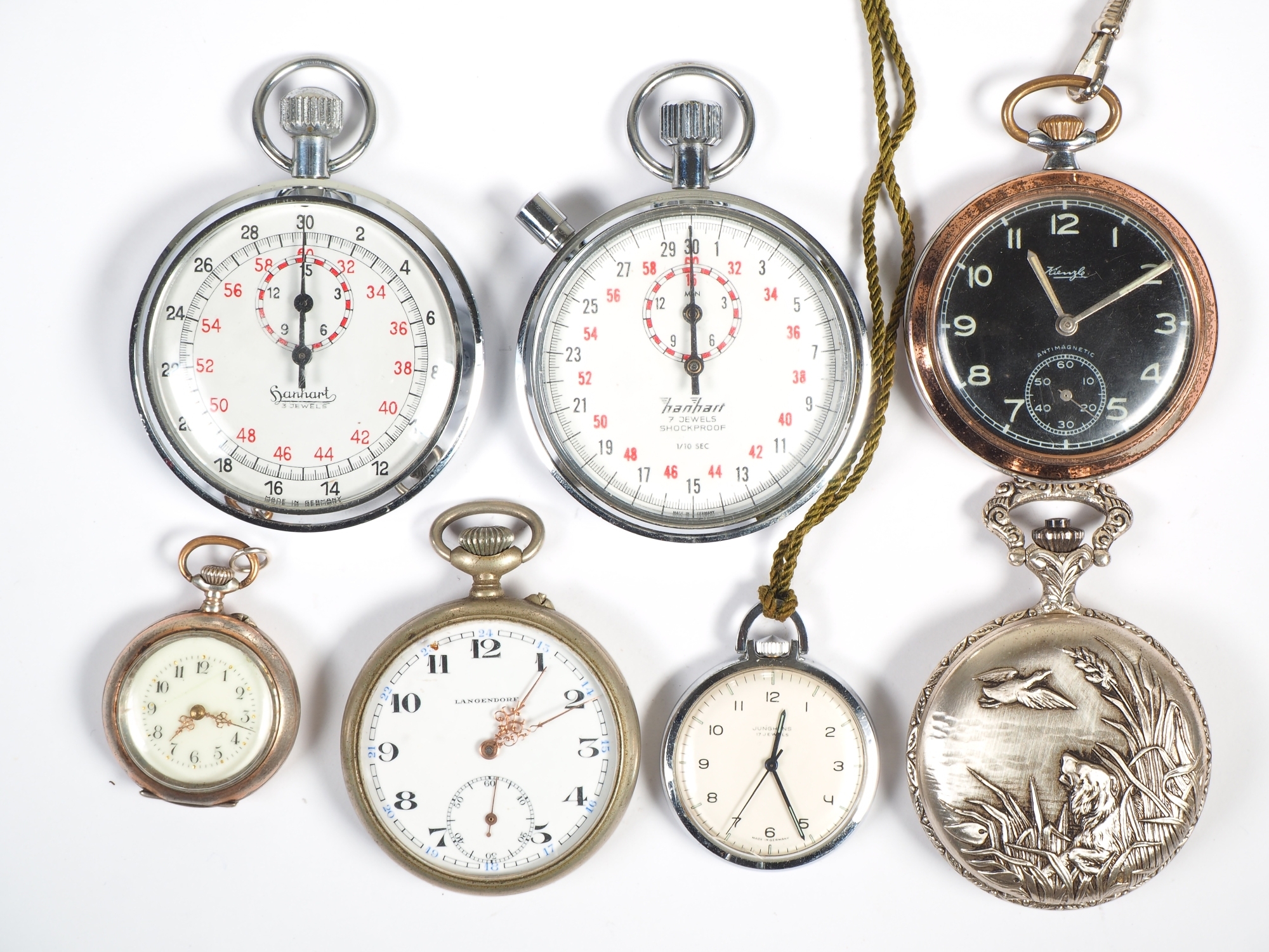 2x Hanhart Stoppuhren (nicht funktionsfähig). Taschenuhren von folgenden Herstellern: Langendorf (steht); Junghans (cal. 687, funktionsfähig); Kienzle (46/0d, funktionsfähig); Damentascheunhr um 1900 im Silbergehäuse; Neuzeitliche Taschenuhr „Spendid ESC“ Gehäuse mit Jagdszene als Relief (funktionsfähig).