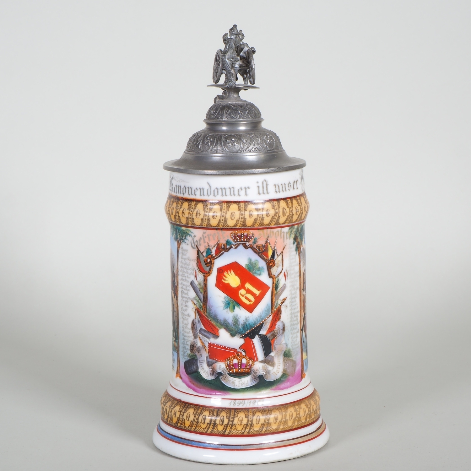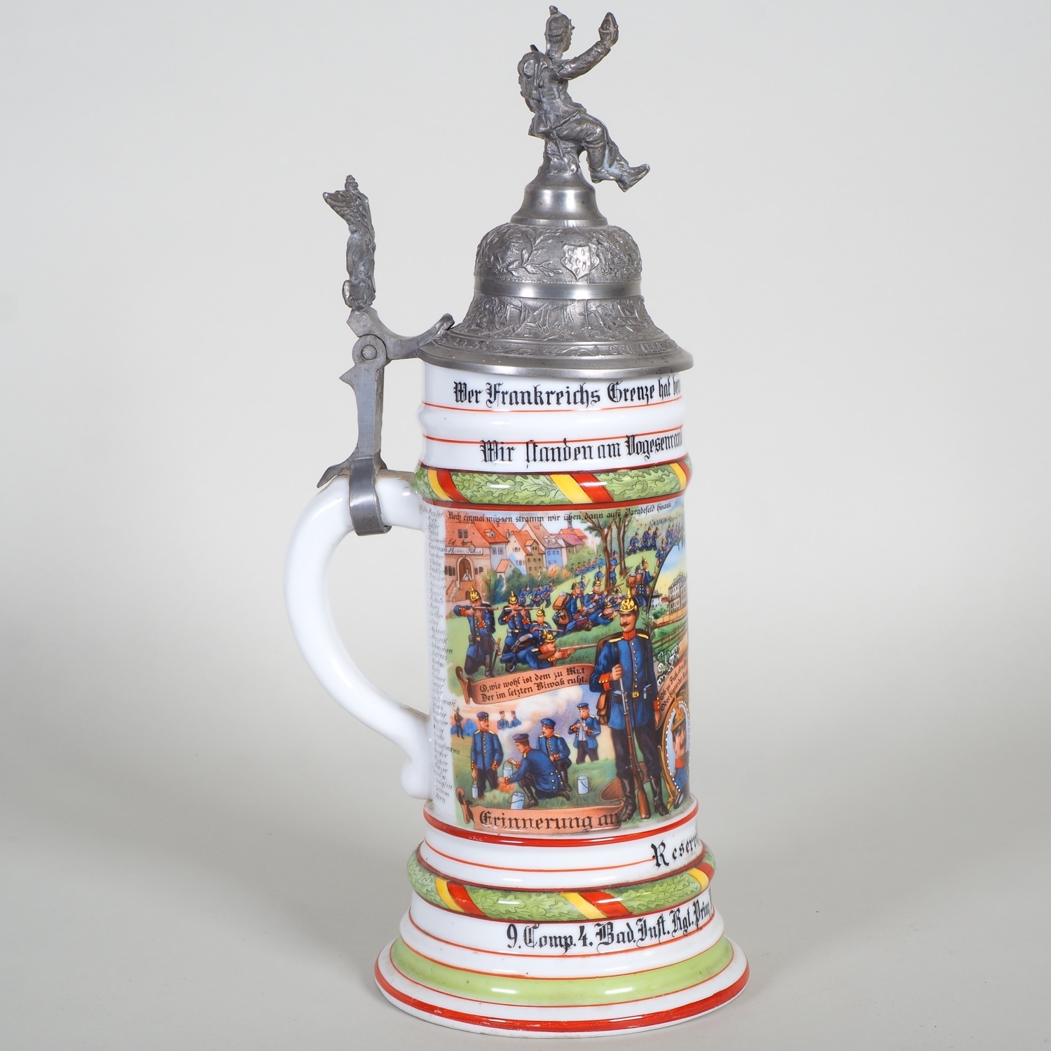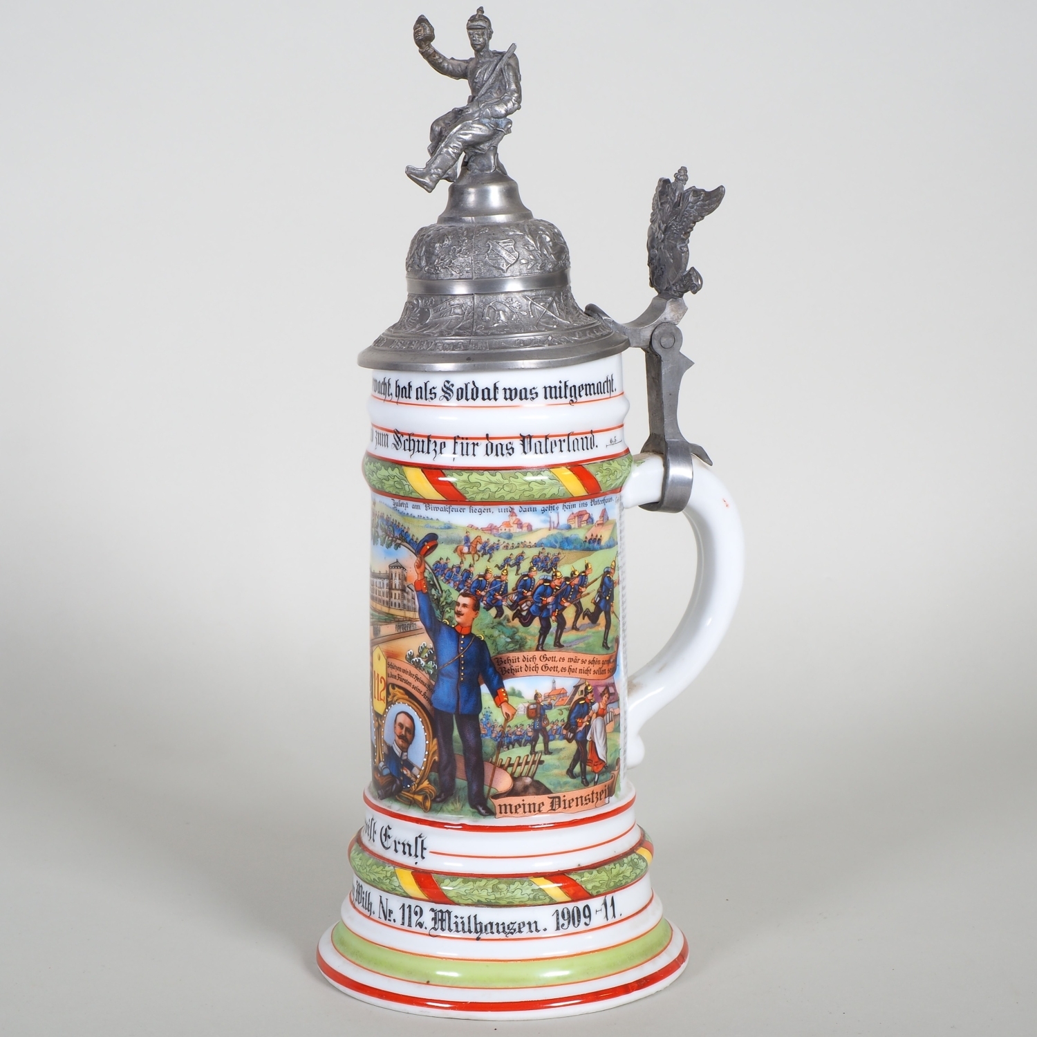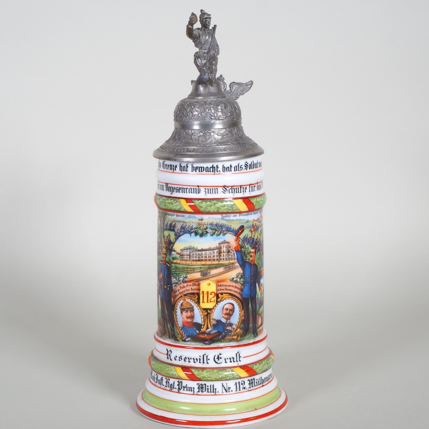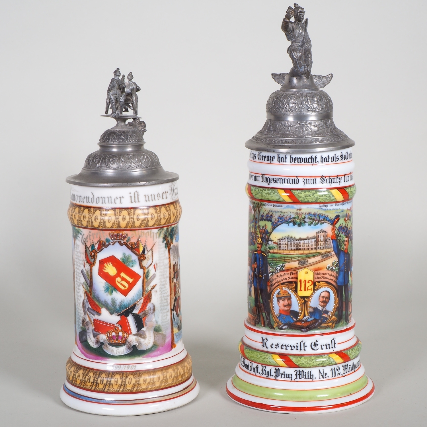 paar Porzellan Reservistenkrüge mit Bemalung. 1.) 9. Comp. 4. Badisches Infanterie-Regiment „Prinz Wilhelm“ Nr. 112. Mülhausen 1909-11 2.) 2. Großherzoglich Hessisches Feldartillerie-Regiment Nr. 61 Darmstadt 1899/1901. Je patriotisch verzierter Zinndeckel einer umlaufender Parole. Beide am Boden mit Lithophanie. Guter Zustand, Zinndeckel wackelt bei beiden etwas. H. 25 / 32cm