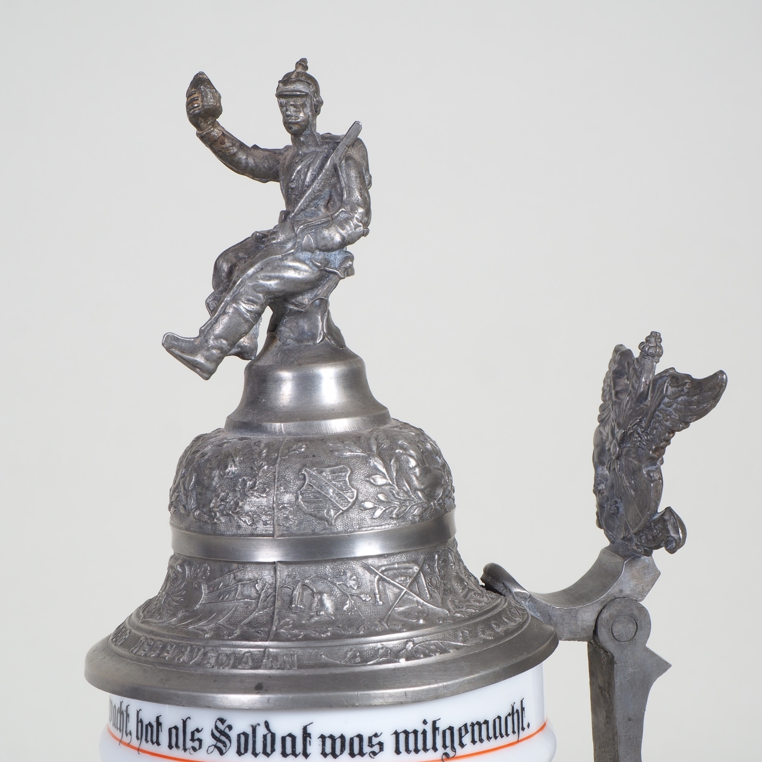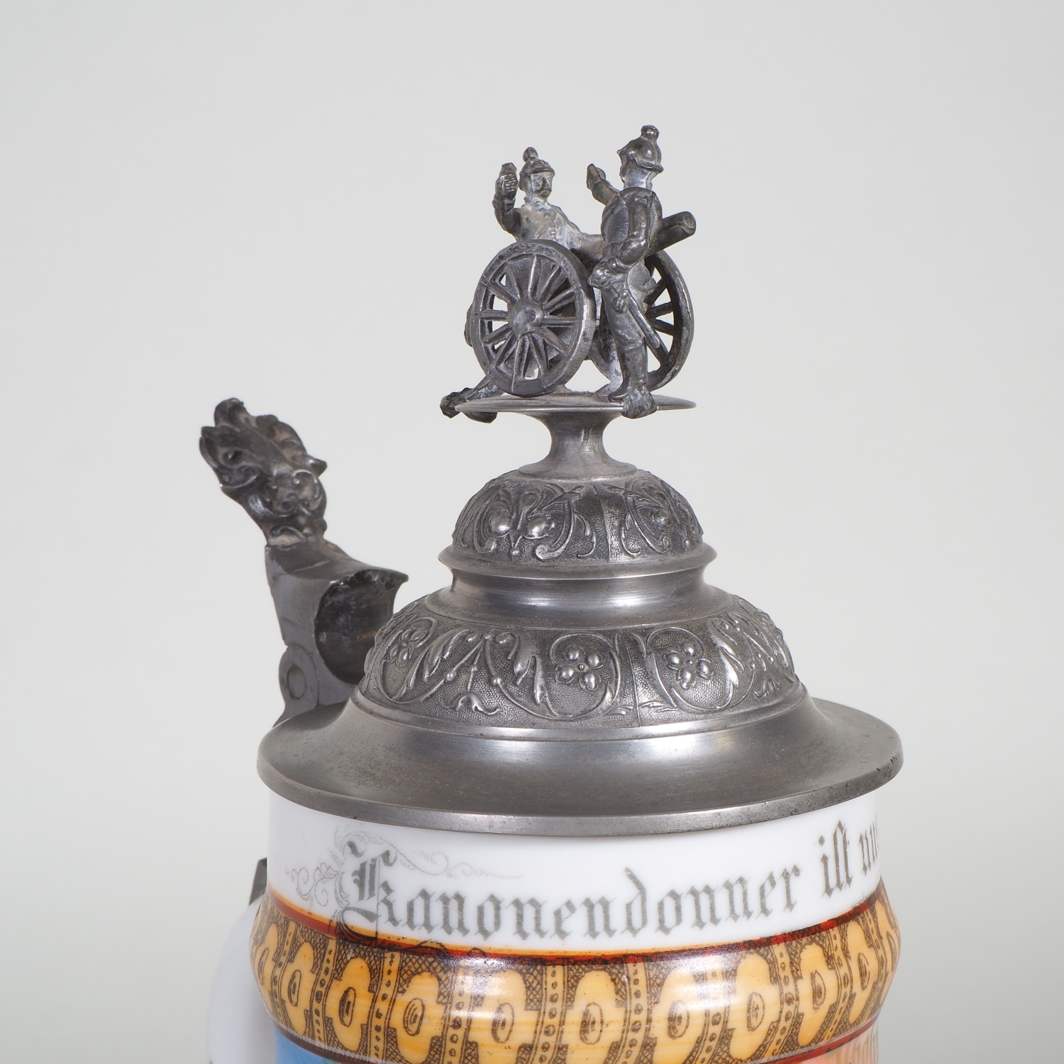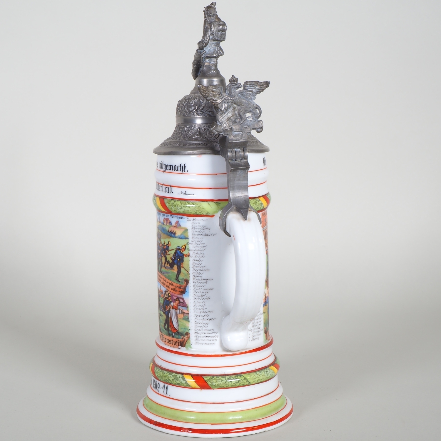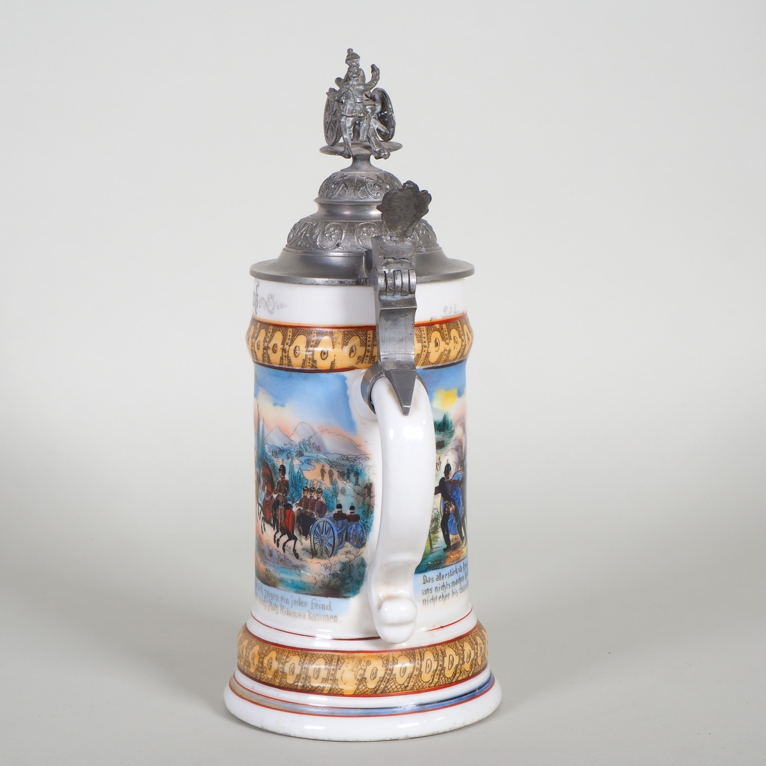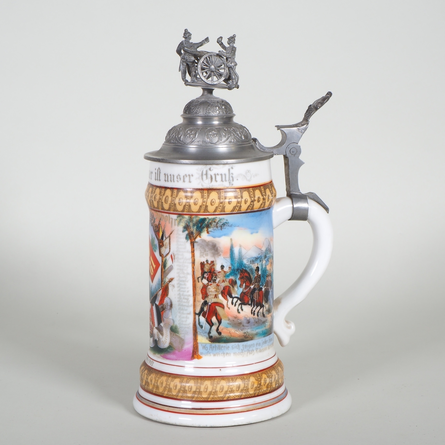 paar Porzellan Reservistenkrüge mit Bemalung. 1.) 9. Comp. 4. Badisches Infanterie-Regiment „Prinz Wilhelm“ Nr. 112. Mülhausen 1909-11 2.) 2. Großherzoglich Hessisches Feldartillerie-Regiment Nr. 61 Darmstadt 1899/1901. Je patriotisch verzierter Zinndeckel einer umlaufender Parole. Beide am Boden mit Lithophanie. Guter Zustand, Zinndeckel wackelt bei beiden etwas. H. 25 / 32cm
