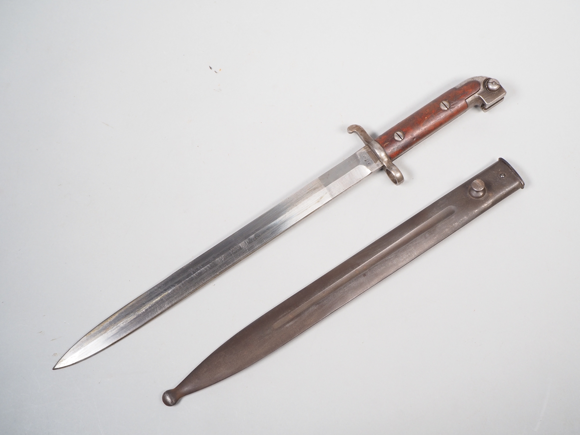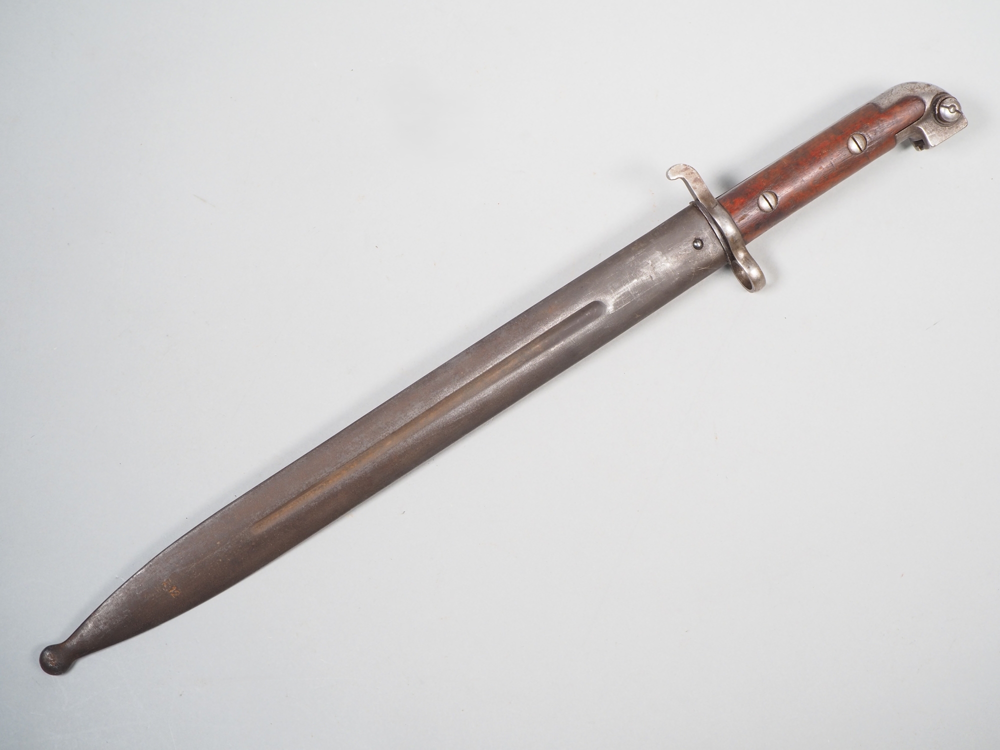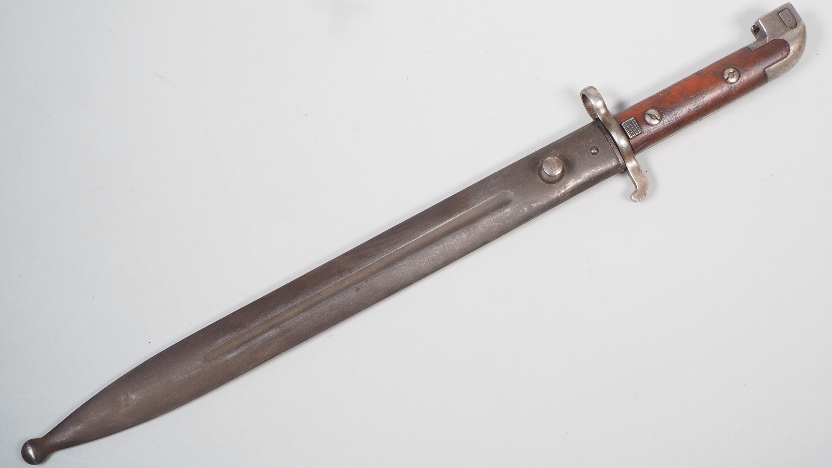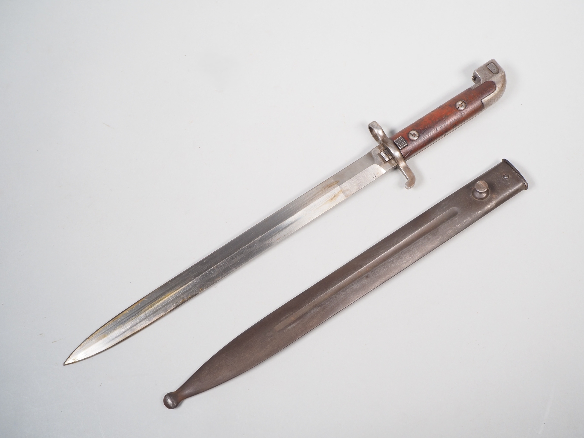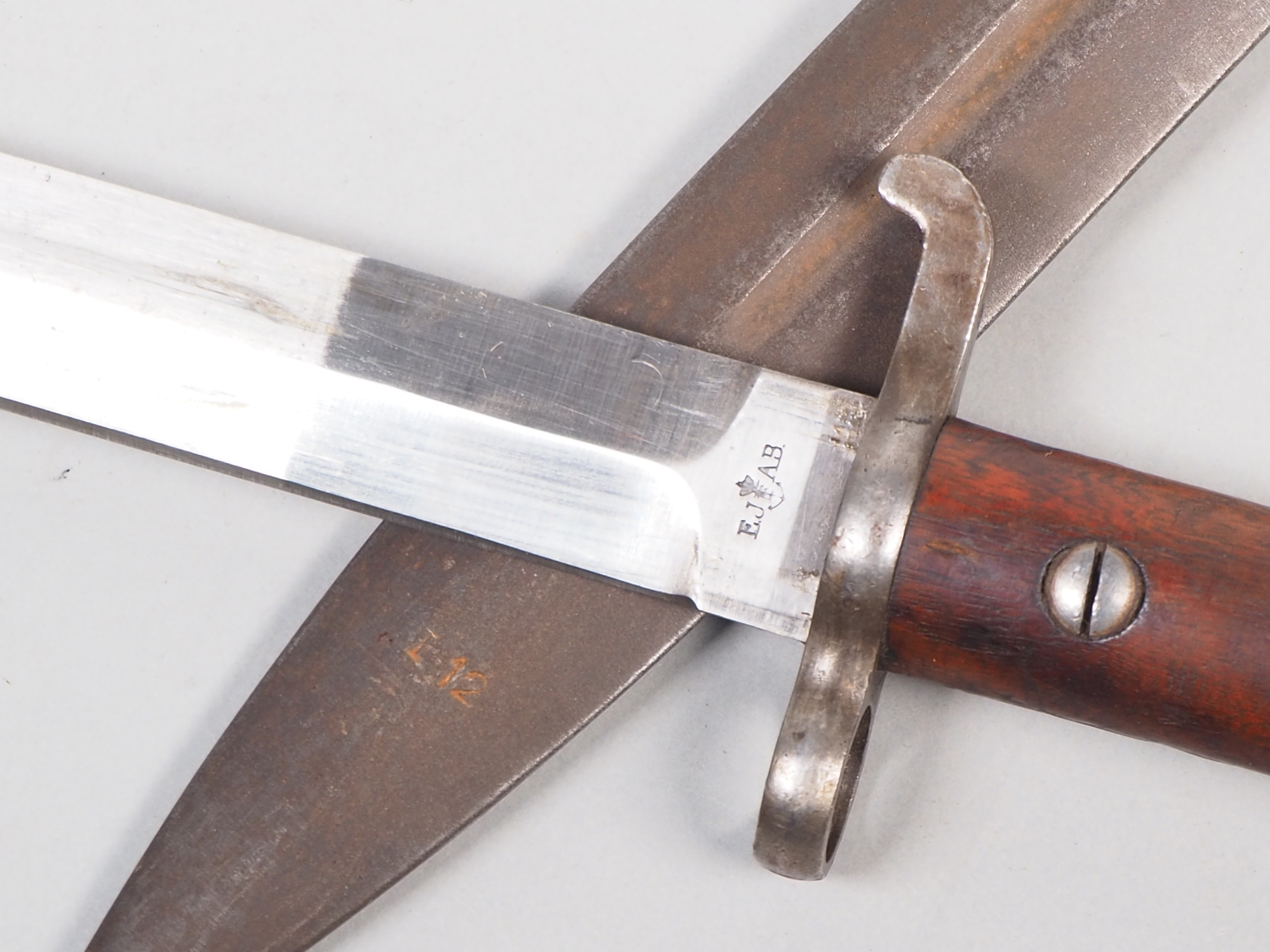 schwedisches Bajonett Modell 1914 für den Carl Gustaf Karabiner M/94, s.g. Schweden Mauser. Lange Dolchklinge, im vorderen Teil zweischneidig, auf Fehlschärfe Hersteller Stempelung und Abnahme, sowie bekröntem „E“ im Anker. Zweifach verschraubte Holzgriffschalen, beweglicher Drücker. Schwarze Stahlscheide (gestempelt I12) mit Tragehaken. Klinge 33cm. Gesamt L. mit Scheide 48,5cm. Guter Zustand mit Alters- und Gebrauchsspuren.