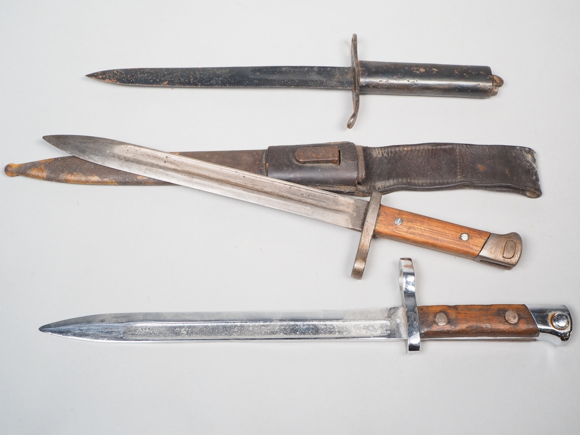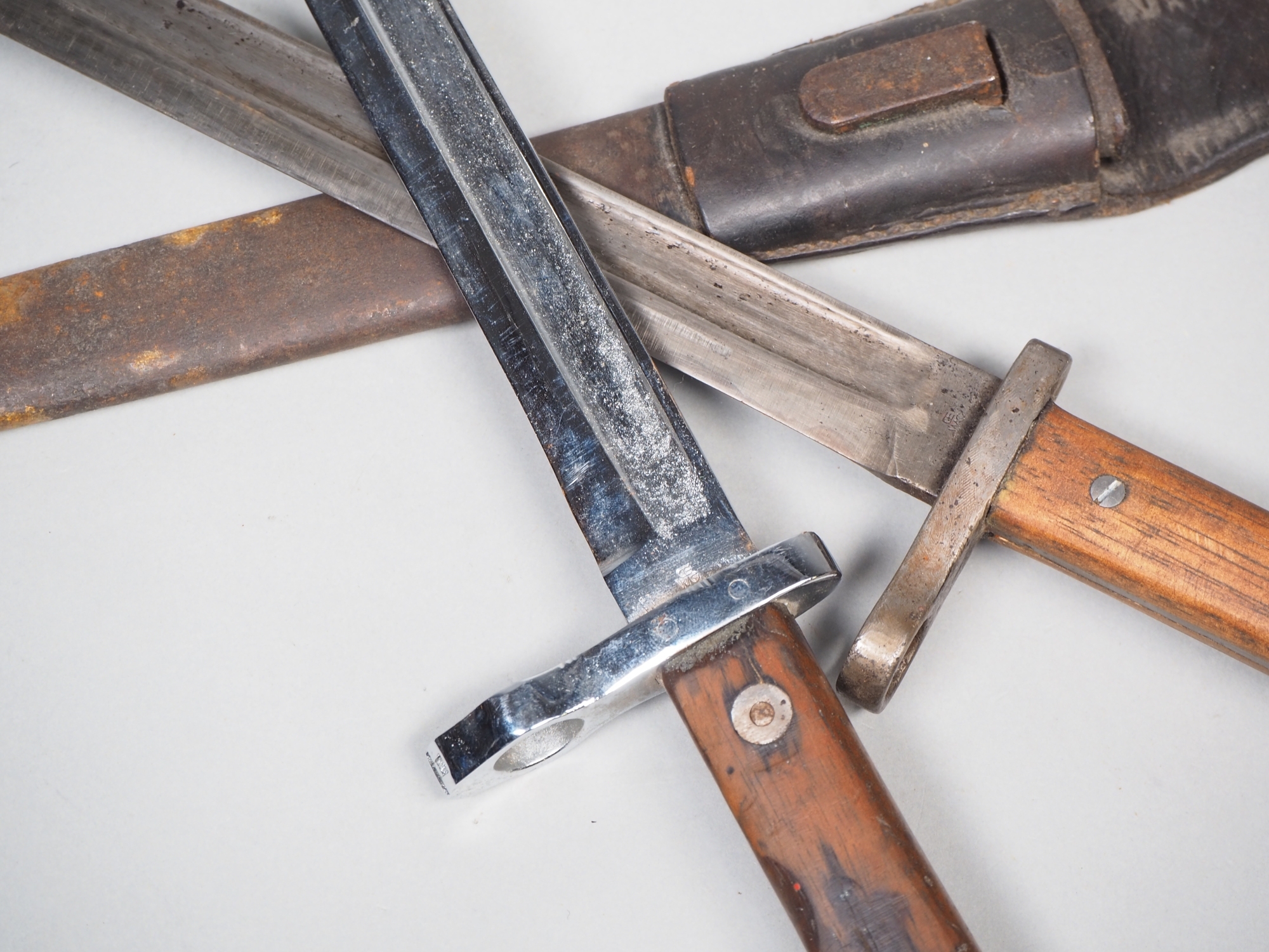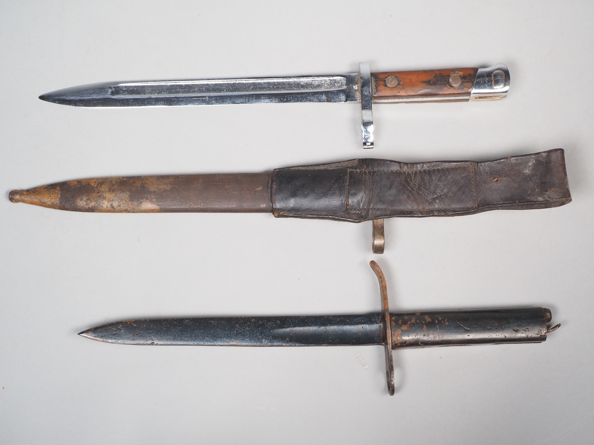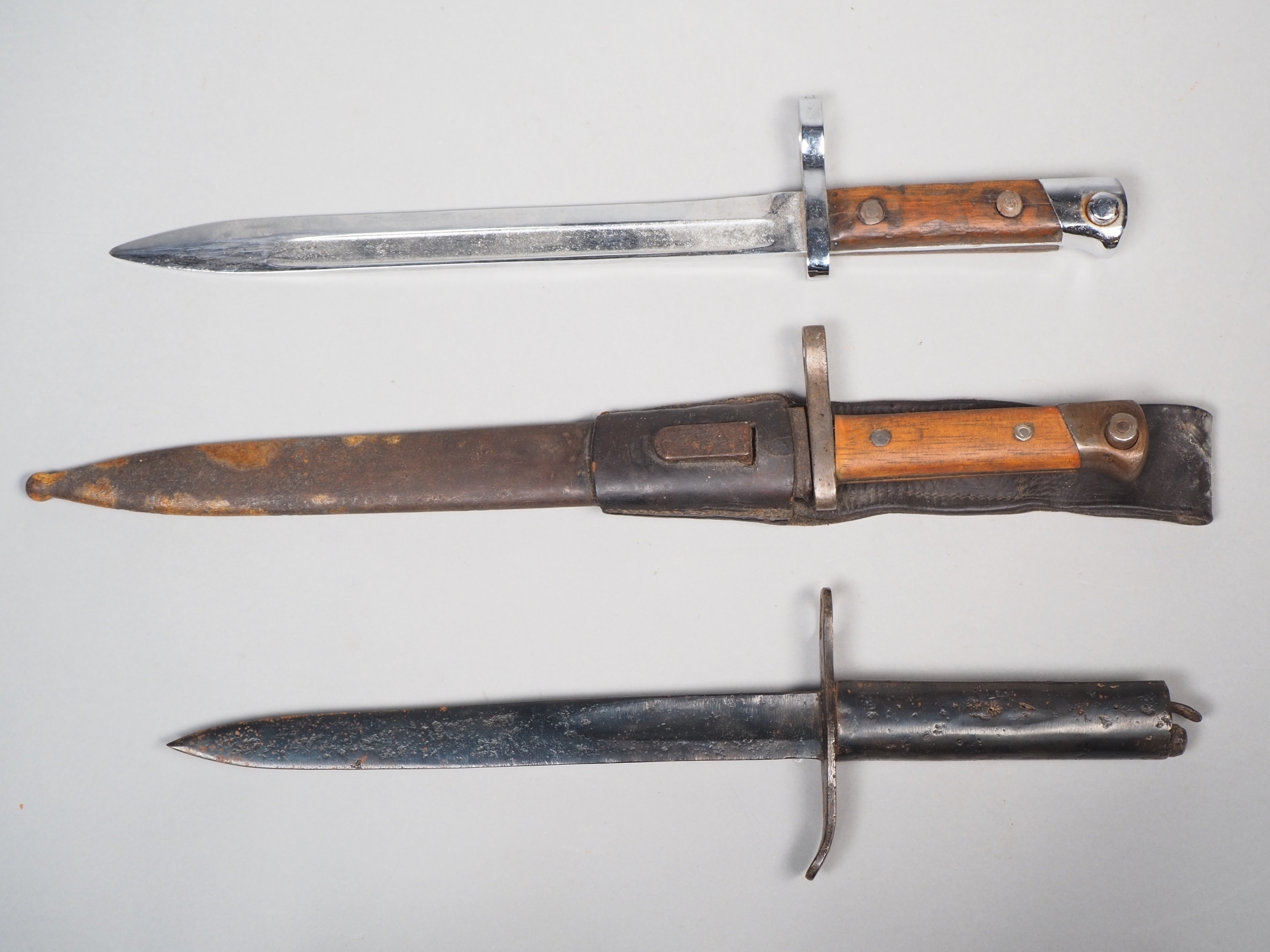 Konvolut mit 3 österreichischen Bajonetten, 2 davon wohl für Export, sowie eins davon als improvisiertes Notbajonett. 2 davon mit „OEWG“ Stempelung auf Fehlschärfe, ein Bajonett vernickelt. Drücker bei allen beweglich. Siehe Fotos.