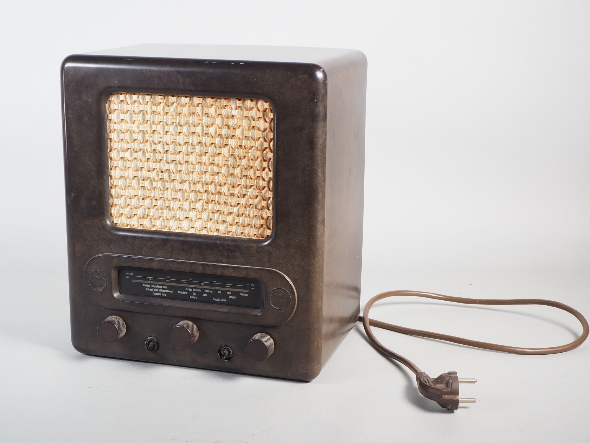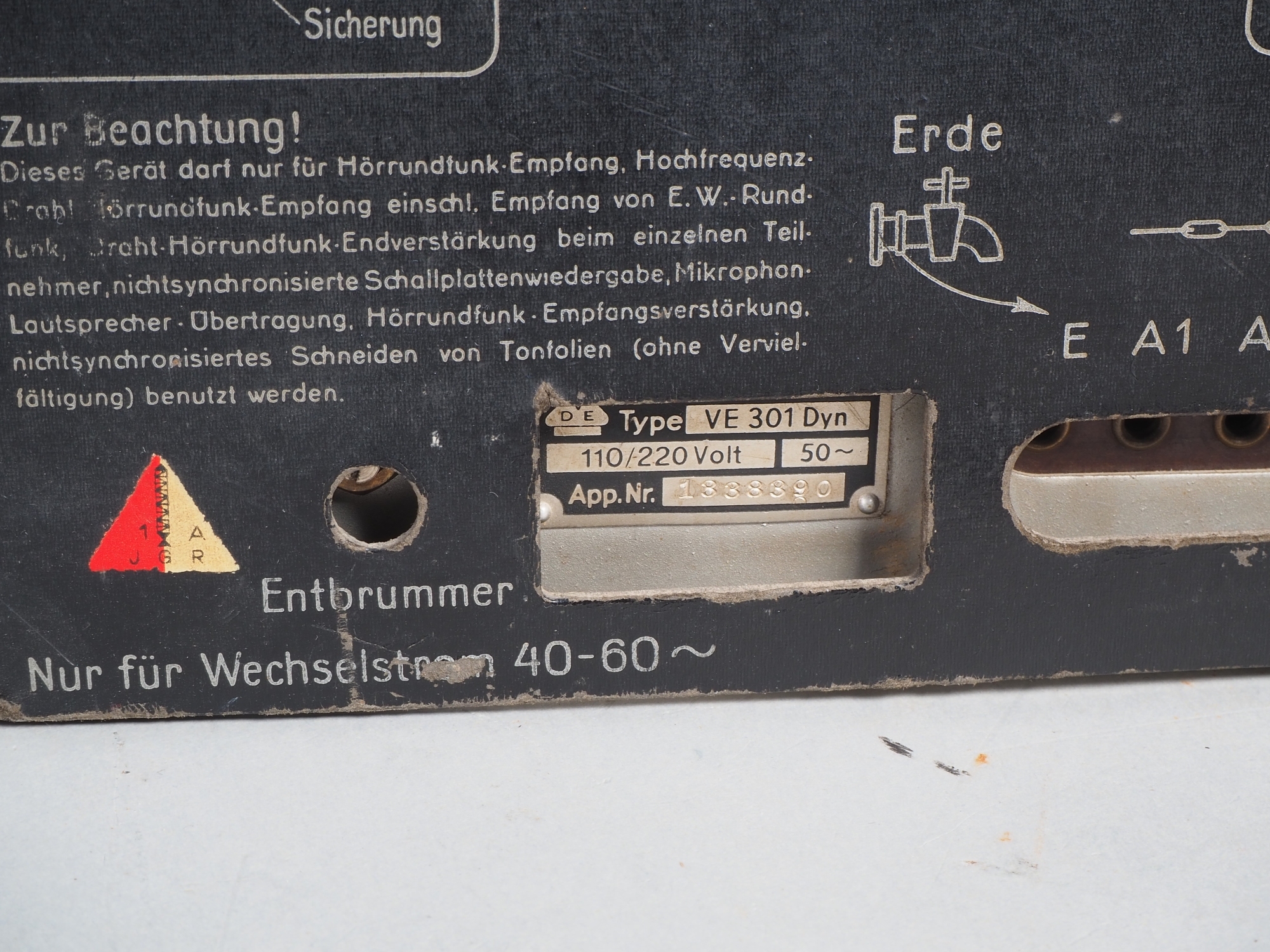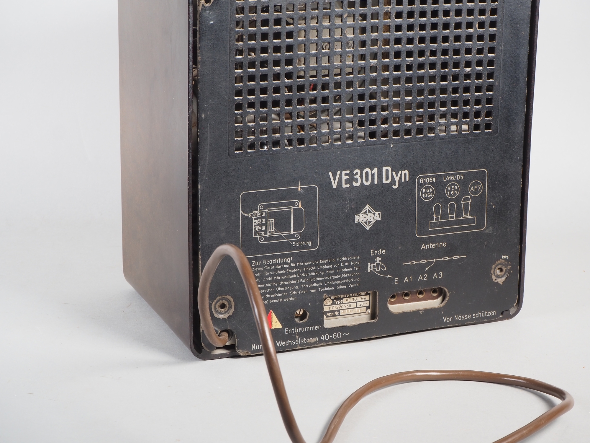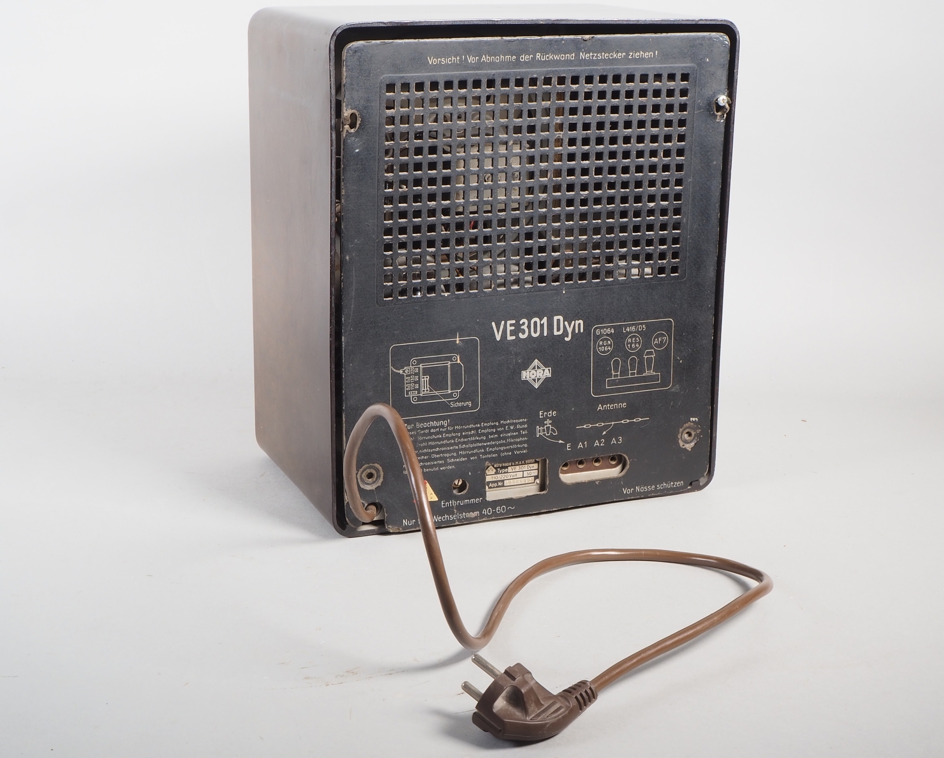Gehäuse und Knöpfe aus Bakelit, intakt, Reichsadler entnazifiziert. Originale Rückwand mit Herstellerangaben „NORA“, Modell „VE 301 Dyn“, sowie entsprechendes Metall Typenschild. Mit ersetztem Kabel. Röhren vorhanden und gesteckt. Nicht auf Funktionalität geprüft, ungereinigter Fundzustand aus Radiosammlung. H. 31cm, B. 27,5cm, T. 18,5cm.