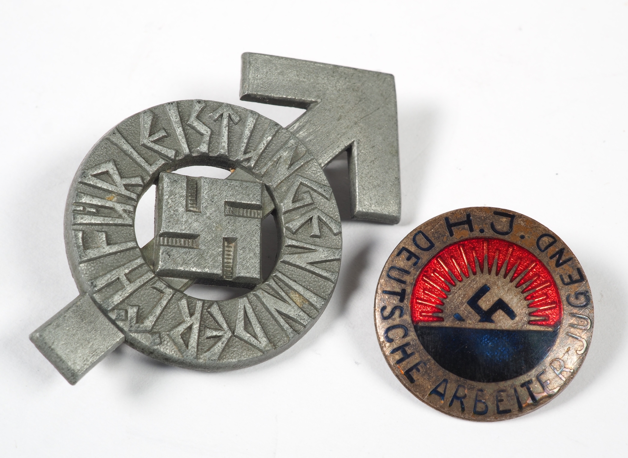HJ Leistungsabzeichen in Silber, Zinkausführung mit Herstellerprägung (erhaben) RZM M 1/63 für Steinhauer & Lück, Lüdenscheid. Rückseitig mit wellig durchgestrichener Verleihungsnummer „152017“. Nadelsystem aus Messing, intakt. Gewicht 15,7gr. Maße 30 x 51mm. HJ Deutsche Arbeiter Jugend Abzeichen mit Emaille, rückseitig RZM & Ges. Gesch., Ø 22mm.