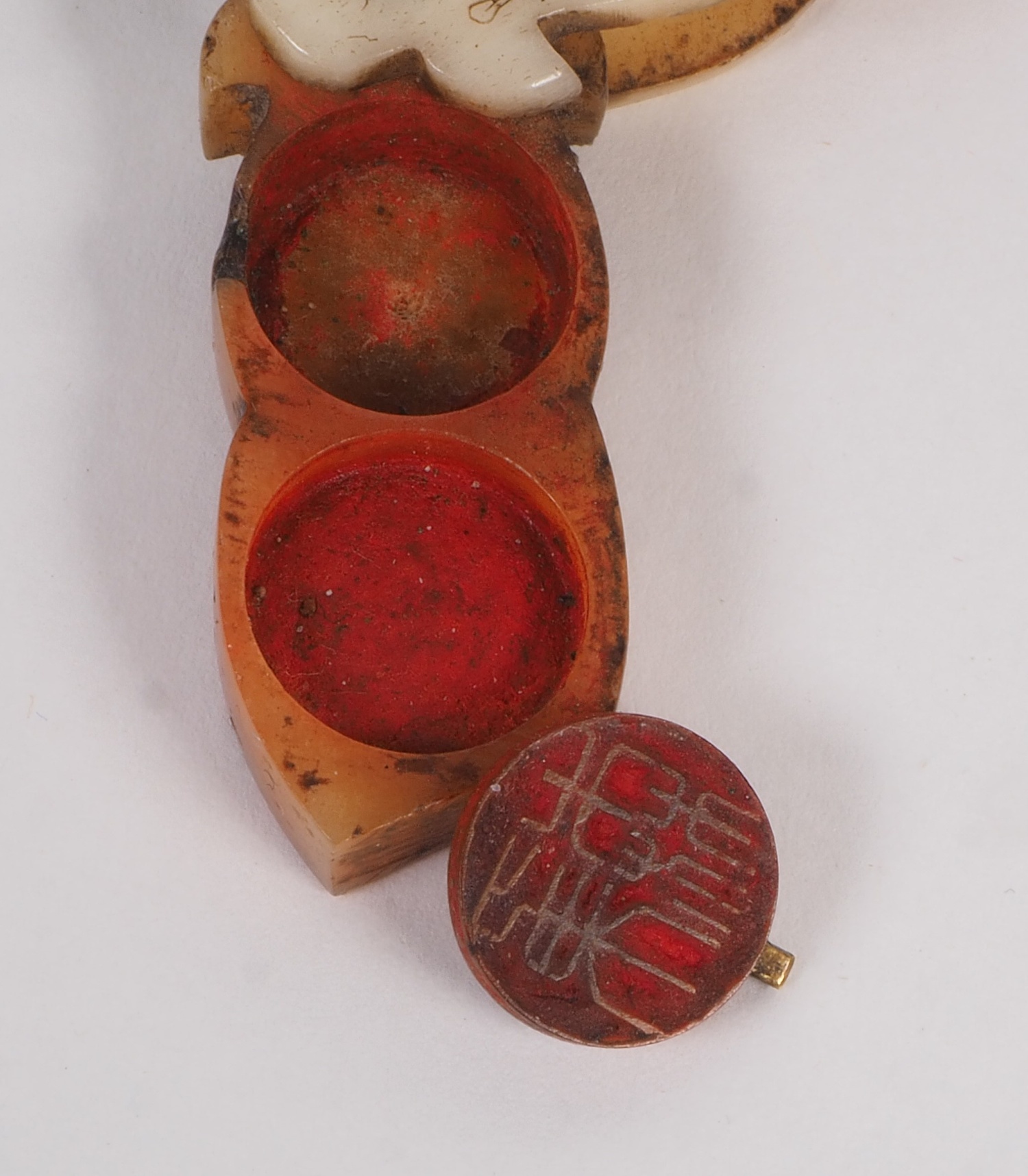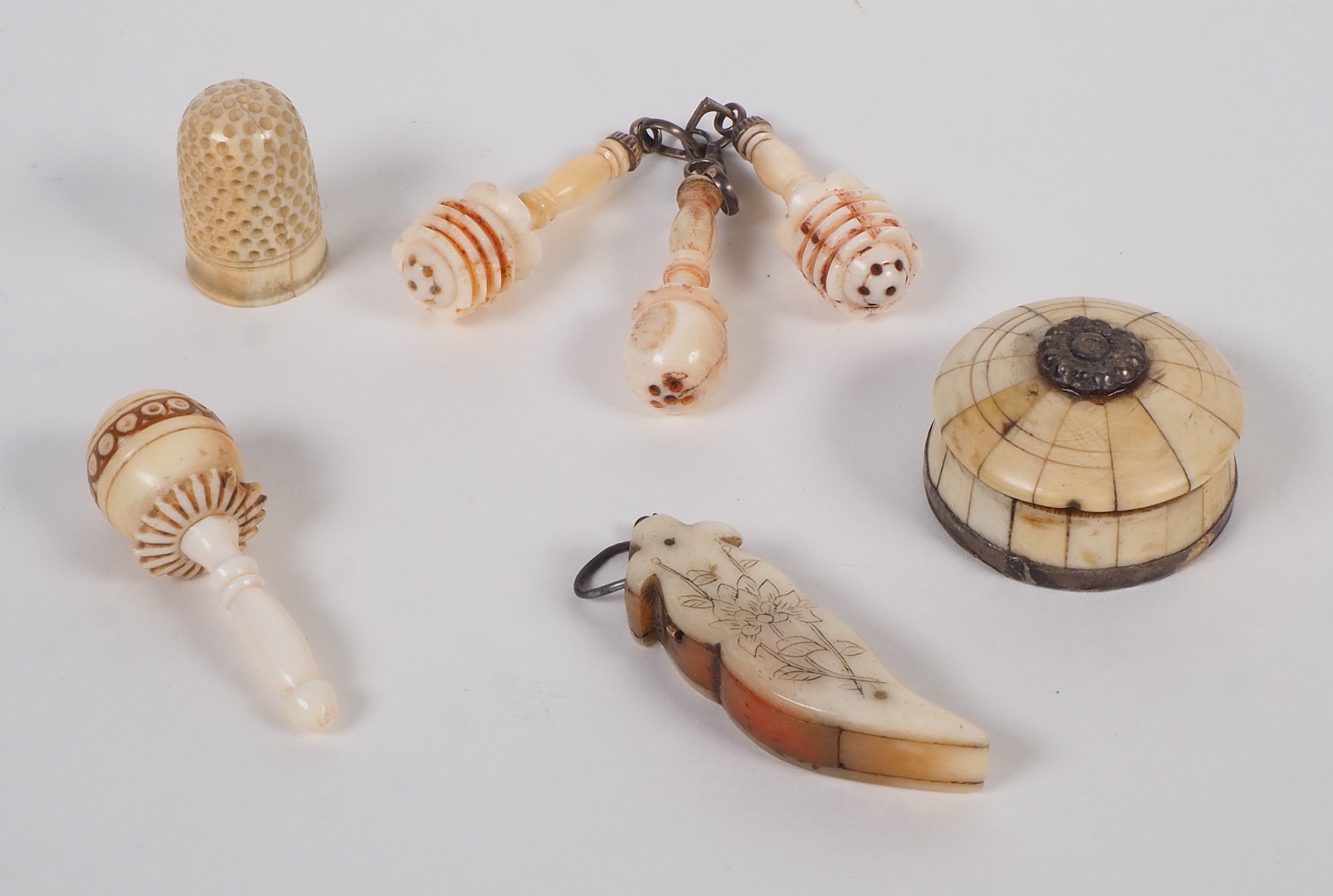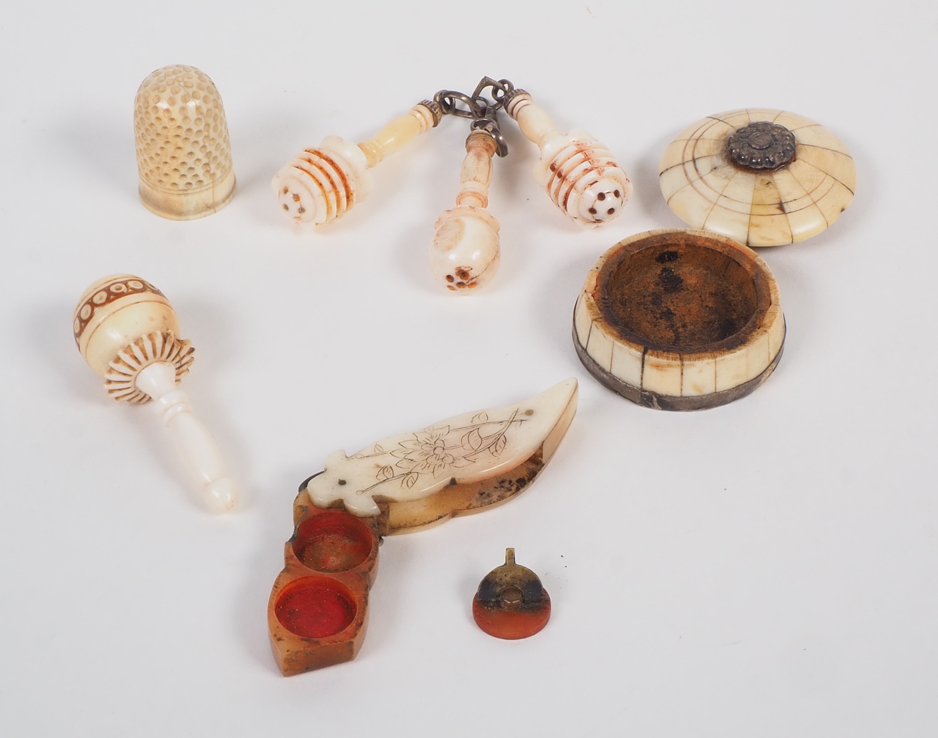 Sieben verschiedene Miniaturen der tibetischen Handwerkskunst um 1900 oder älter. Sehr filigrane Ausarbeitung, teilweise mit Metallösen und feiner Bemalung. Drei zusammenhängende Anhänger in Form von Gebetsmühlen, sowie eine weiterer in dieser Form, jedoch ohne Aufhängung. Ein Fingerhut und nochmal eine Anhänger mit spitz zulaufender Form, in Lagen gearbeitet, sehr schön bemalt. Dazu ein Deckelgefäß mit geprägter Silbermünze am Boden und Deckelknauf aus Metall. Maße ca. 3-4 cm, 6 Dose ca. 3,2 cm. Guter Erhaltungszustand mit Alters- und Gebrauchsspuren.