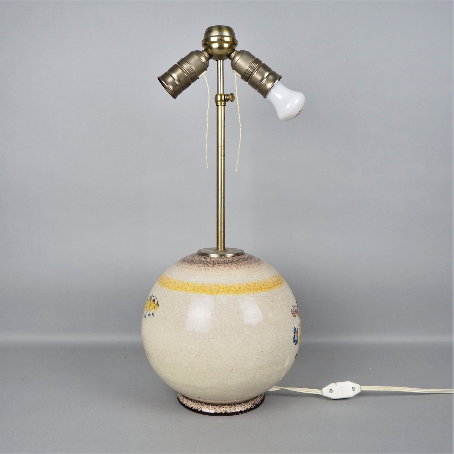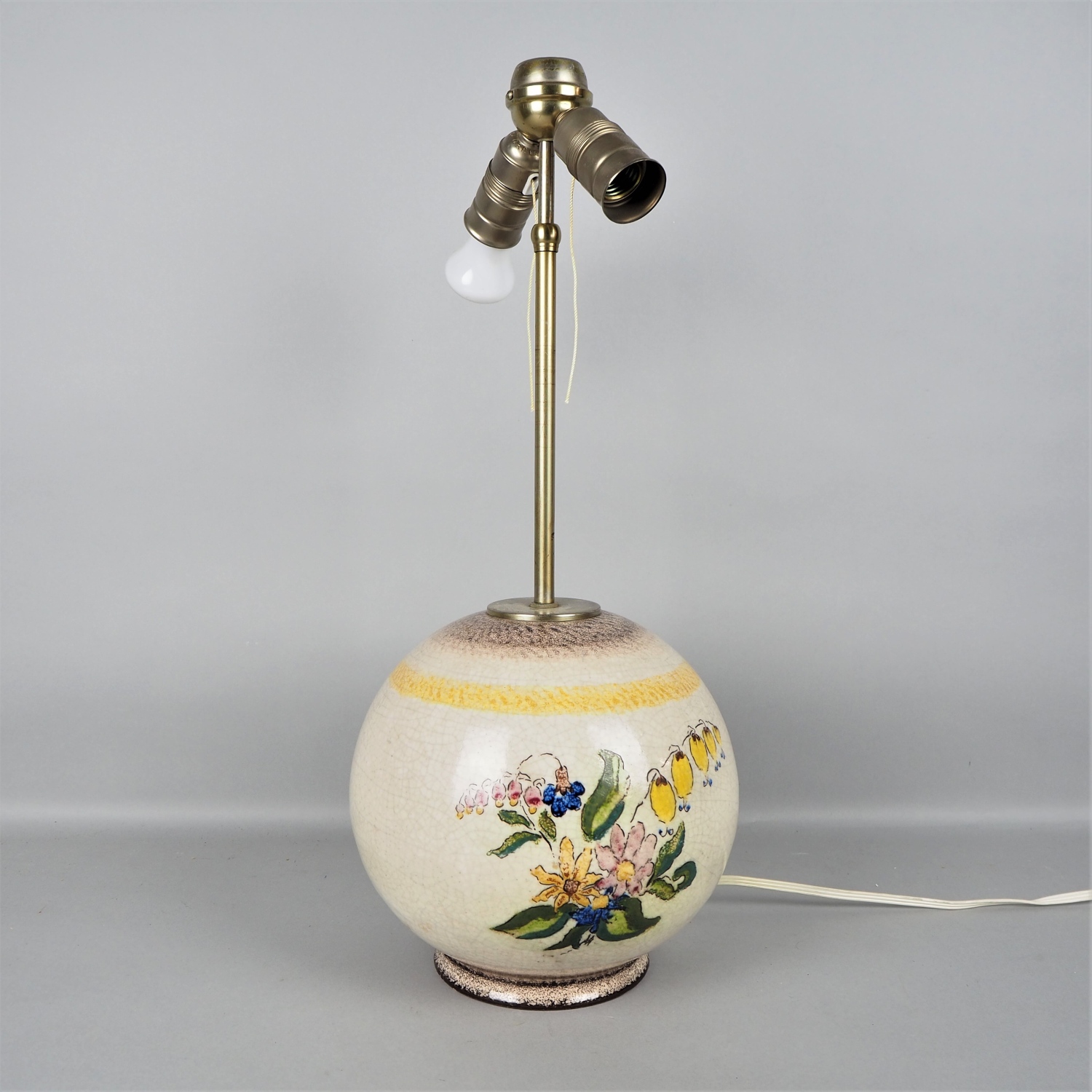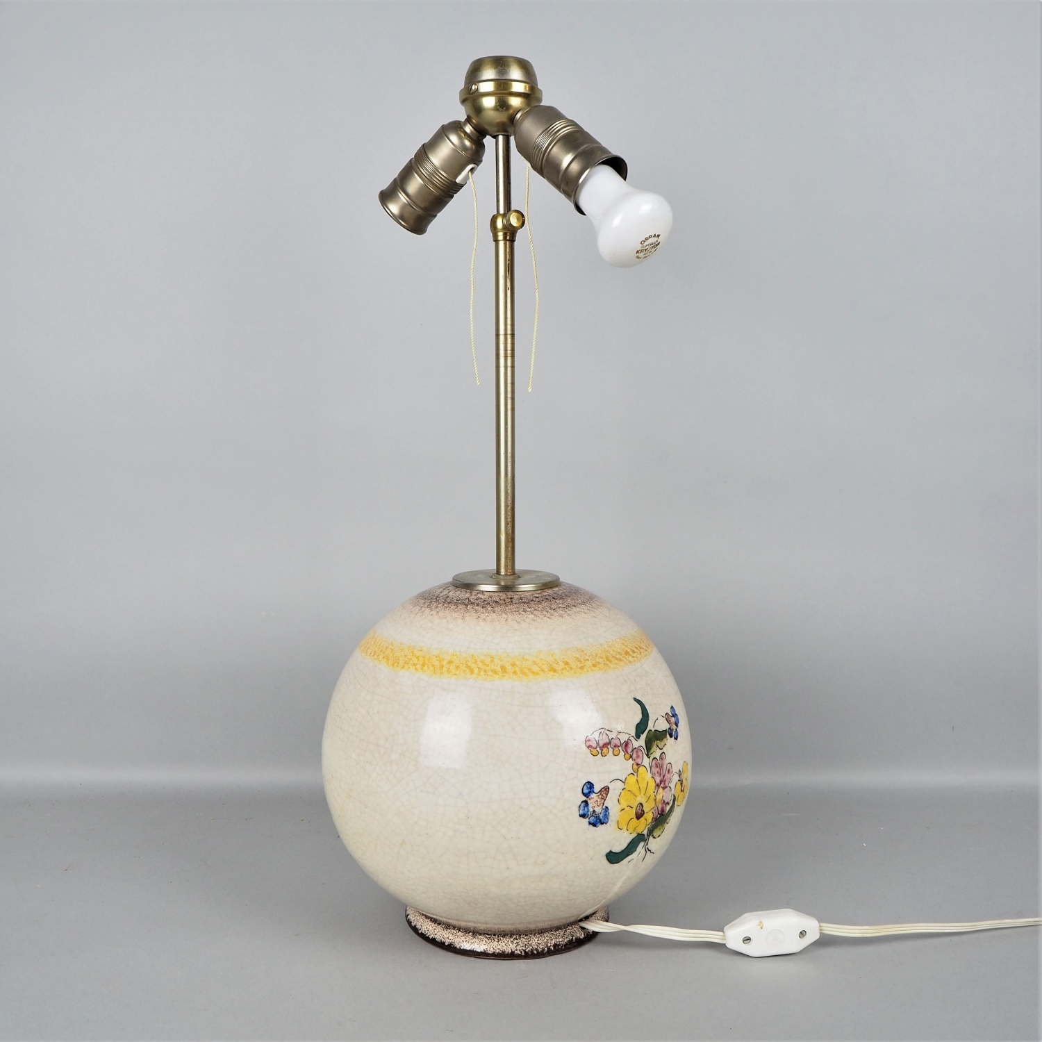 Kugelförmiger Stand aus Steinzeug glasiert, mit Krakele und floralem Dekor. Schaft als Metall (verchromt), höhenverstellbar, mit Schirmhalterung und zwei Fassungen E 27. Gesamthöhe: ca. 60 cm. Guter Erhaltungszustand mit Alters – und Gebrauchsspuren, nicht funktionsgeprüft, ohne Schirm.