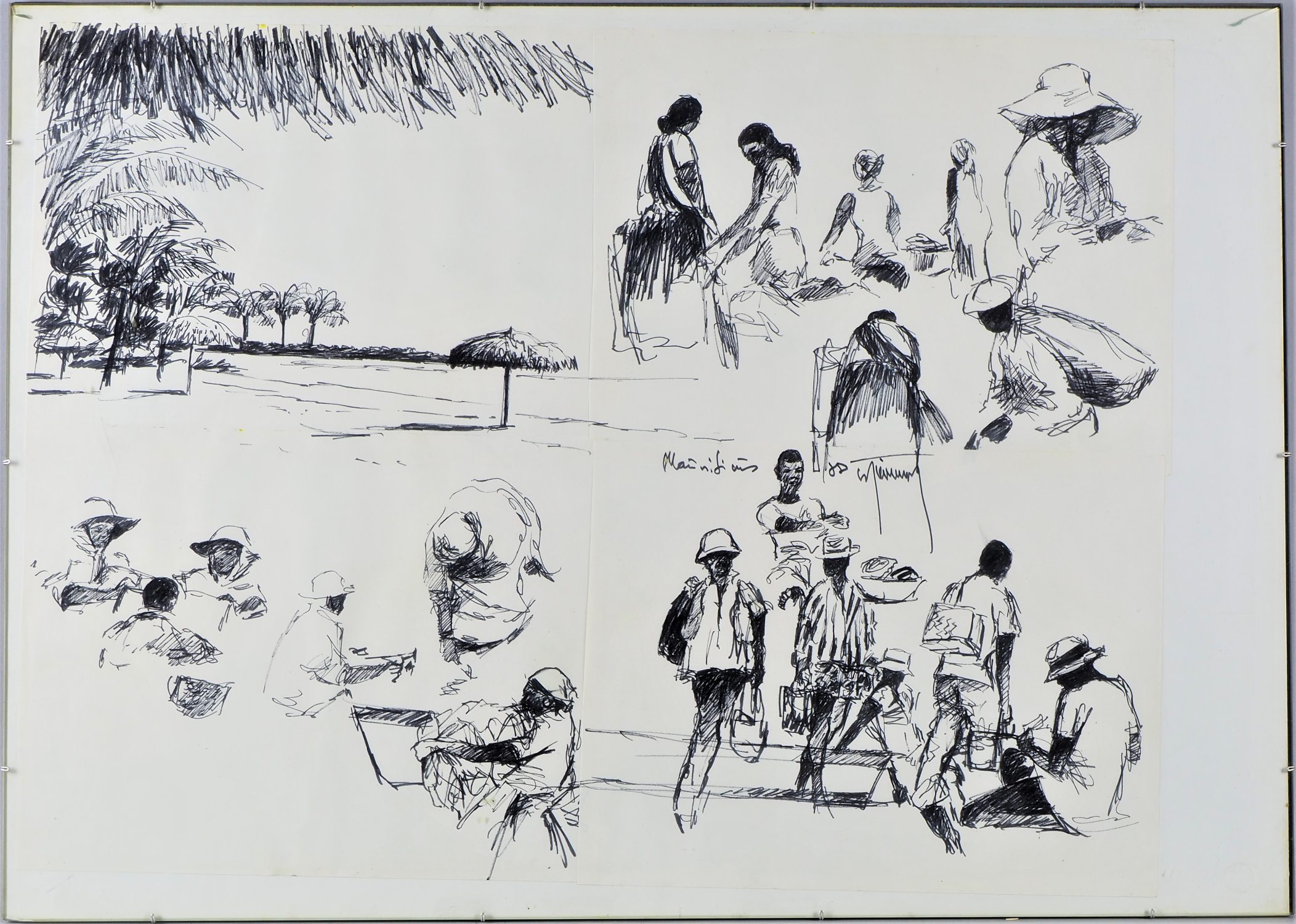 Mischtechnik auf Karton. Skizzenhafte Ansichten und Genreszenen. Signiert und datiert. Mehrere Blätter zusammengefügt, unter Glas. Guter Zustand. Gesamtmaße H. 50cm, B. 70cm.