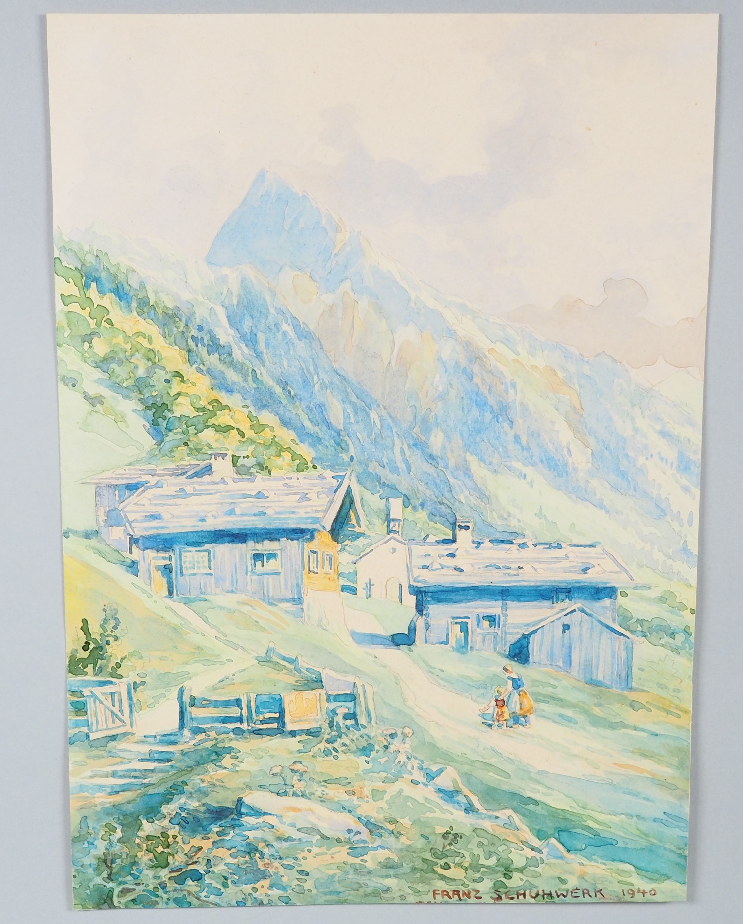 Aquarell auf dickem Papier gemalt, mit kleinem Bergdorf im Allgäu, Mutter mit Kind beim Spaziergang. Rechts unten signiert und datiert. 23 x 33cm