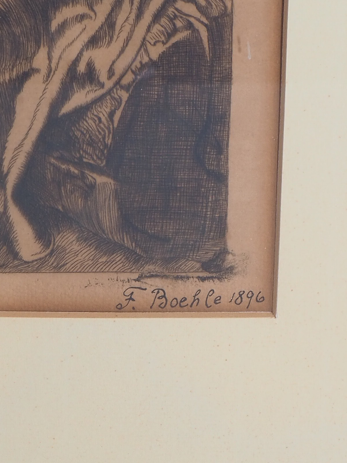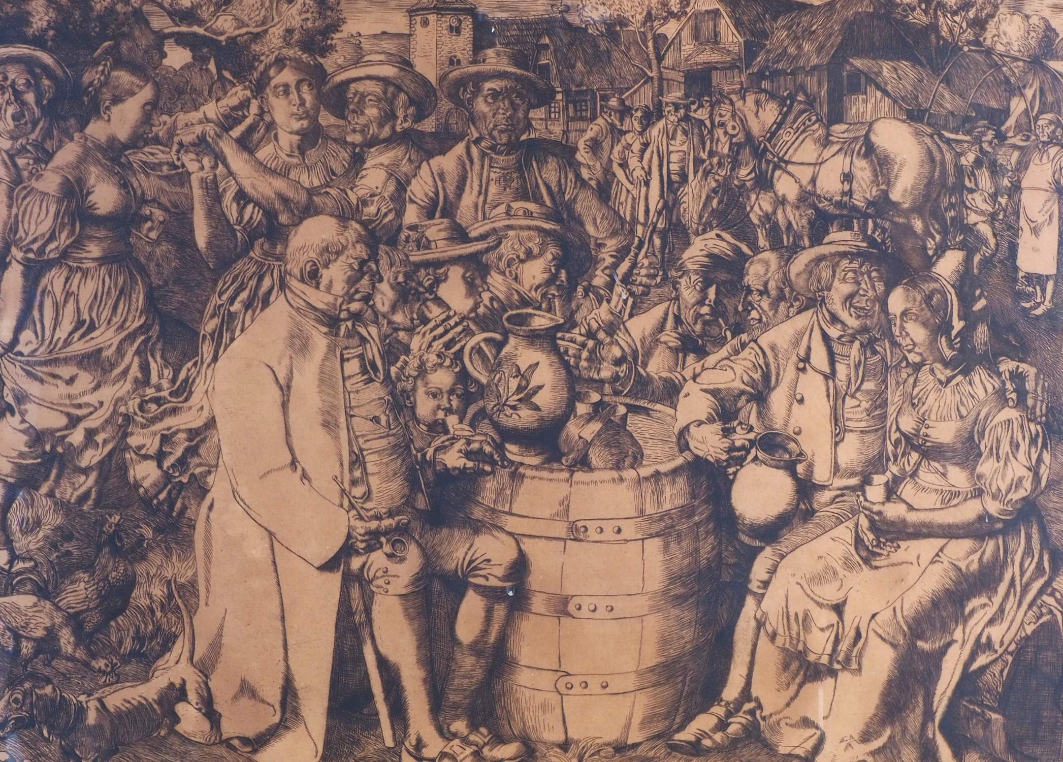 Radierung, in einem Passepartout hinter Glas in einem Holzrahmen gerahmt. Darstellung eines dicht bevölkerten Platzes mit diversen Aktivitäten eines Festes. In der Mitte wird Wein an einem Fass getrunken, im Hintergrund sind Tänzer zu sehen. Unten rechts signiert: F. Boehle, 1896. Maße: Rahmen ca. 71 x 57 cm, Passepartout ca. 51,5 x 39 cm. Guter Erhaltungszustand mit Alters- und Gebrauchsspuren, leicht fleckig. Fritz Boehle (1873 Emmendingen – 1916 Frankfurt am Main) war ein deutscher Maler, Grafiker und Bildhauer. Er war Schüler von Hasselhorst am Städel in Frankfurt und W. Diez in München.
