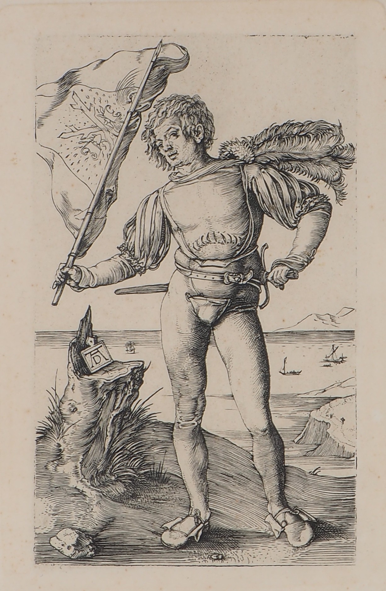 Kupferstich nach Albrecht Dürer (1471 – 1528): „Der Fahnenschwinger (Der Fähnrich)“