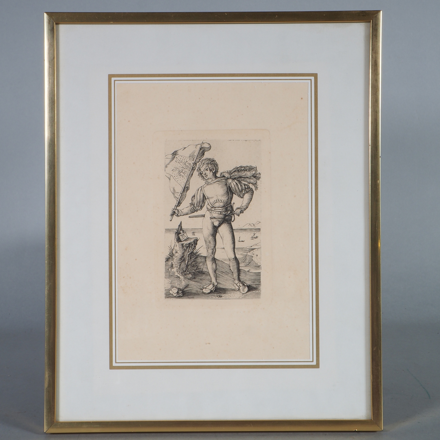 Kupferstich auf Papier mit Passepartout in einem einfachen Rahmen hinter Glas gerahmt. Dargestellt ist der Fahnenträger eines militärischen Kontingentes. Vielleicht handelt es sich um den Fahnenträger der Nürnberger Truppe, die 1499 am Schwabenkrieg teilgenommen hat. Maße: Rahmenmaß ca. 24,5 x 30,5 cm, Bildmaß ca. 7×12 cm. Guter Zustand mit Alters- und Gebrauchsspuren, leichte Fleckenbildung.