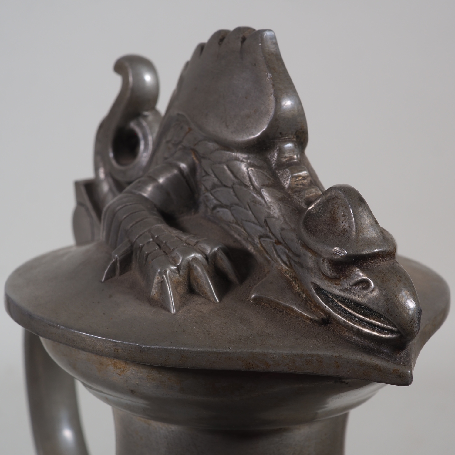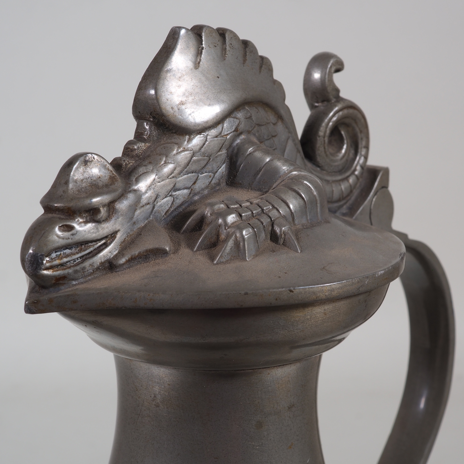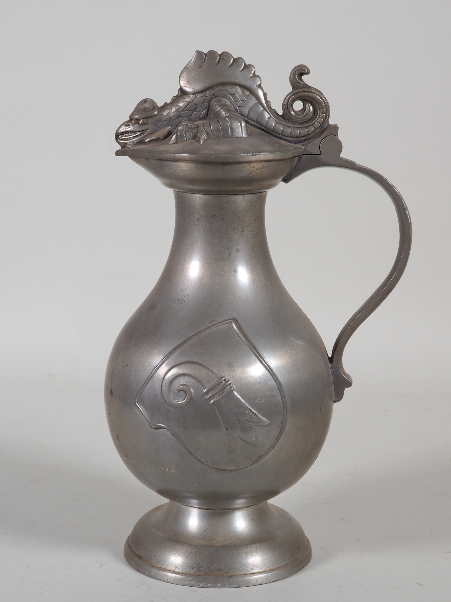 Ungewöhnlicher Zinnkrug aus der Schweiz im Stil des Art Déco, auf dem Klappdeckel liegt ein freifigürlicher Drache, seitlich ist das Basler Stadtwappen angebracht. Entworfen von Hans Frei (1868 Basel – 1947 Riehen), siehe Bilder. Keine Reparaturen. Höhe: ca. 29 cm, Gewicht: 1,5 kg.
