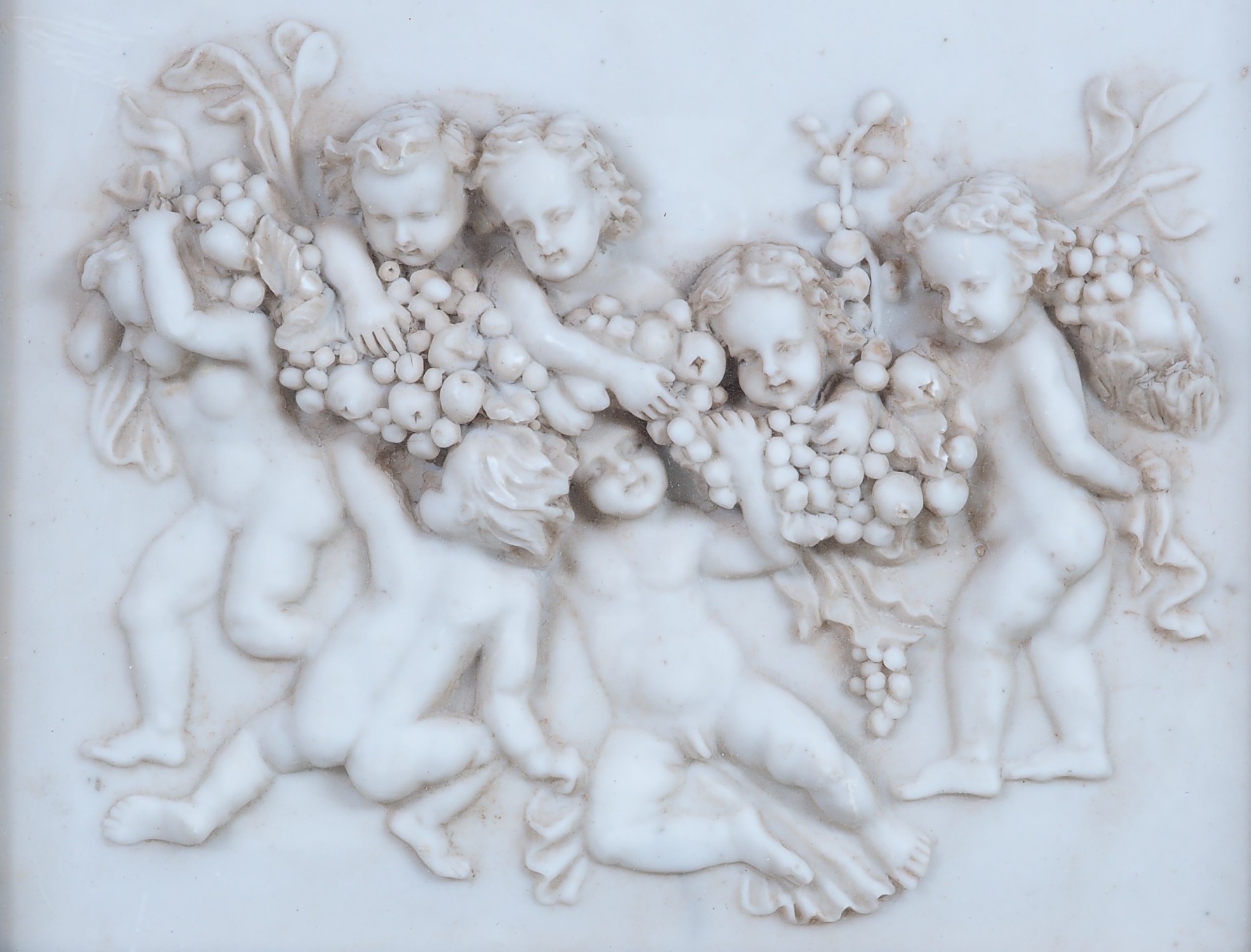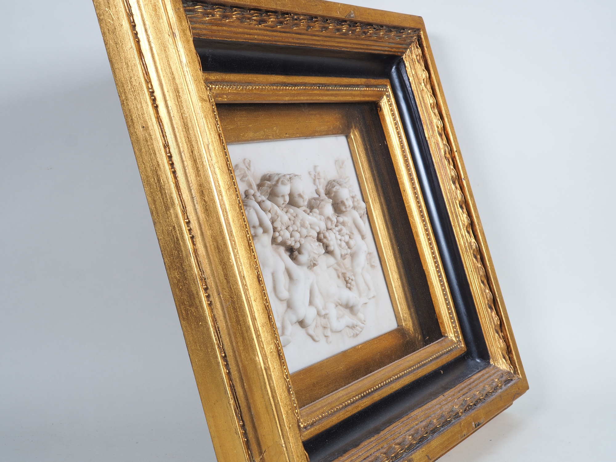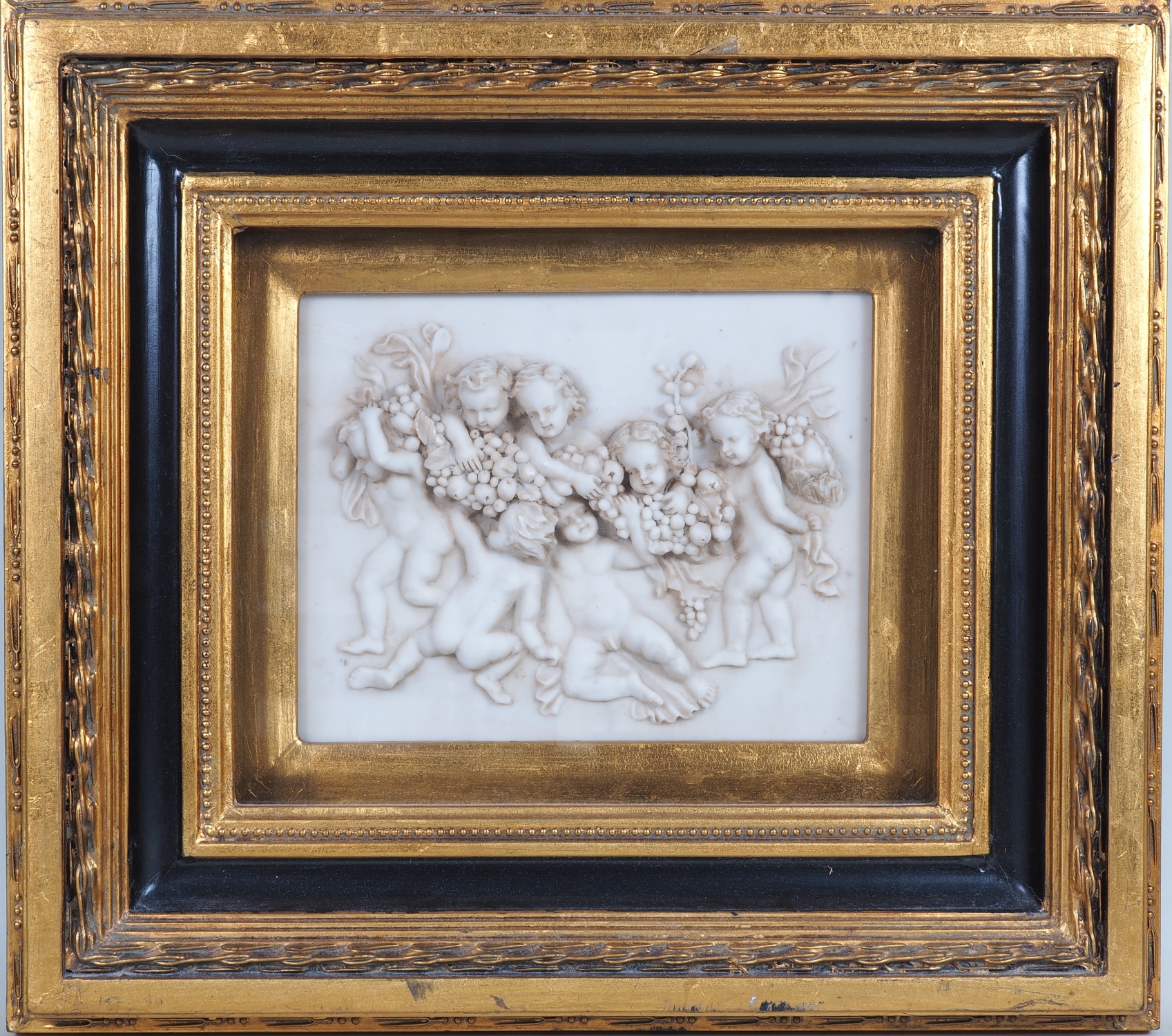 Aus Alabaster gearbeitet, in einem reich verzierten, reliefierten Holzrahmen, dunkel und mit Goldfarbe bemalt, hinter Glas gerahmt. Darstellung von sieben Putti mit Früchten. Maße: Rahmenmaß ca. 46 x 41 cm, Bildmaß ca. 23 x 18 cm. Sehr guter Erhaltungszustand mit wenigen Altersspuren.