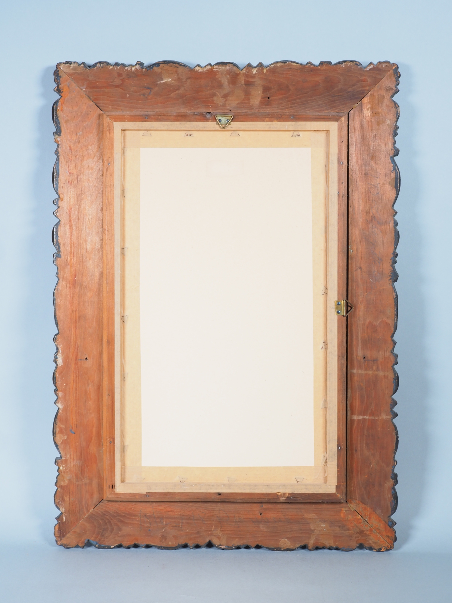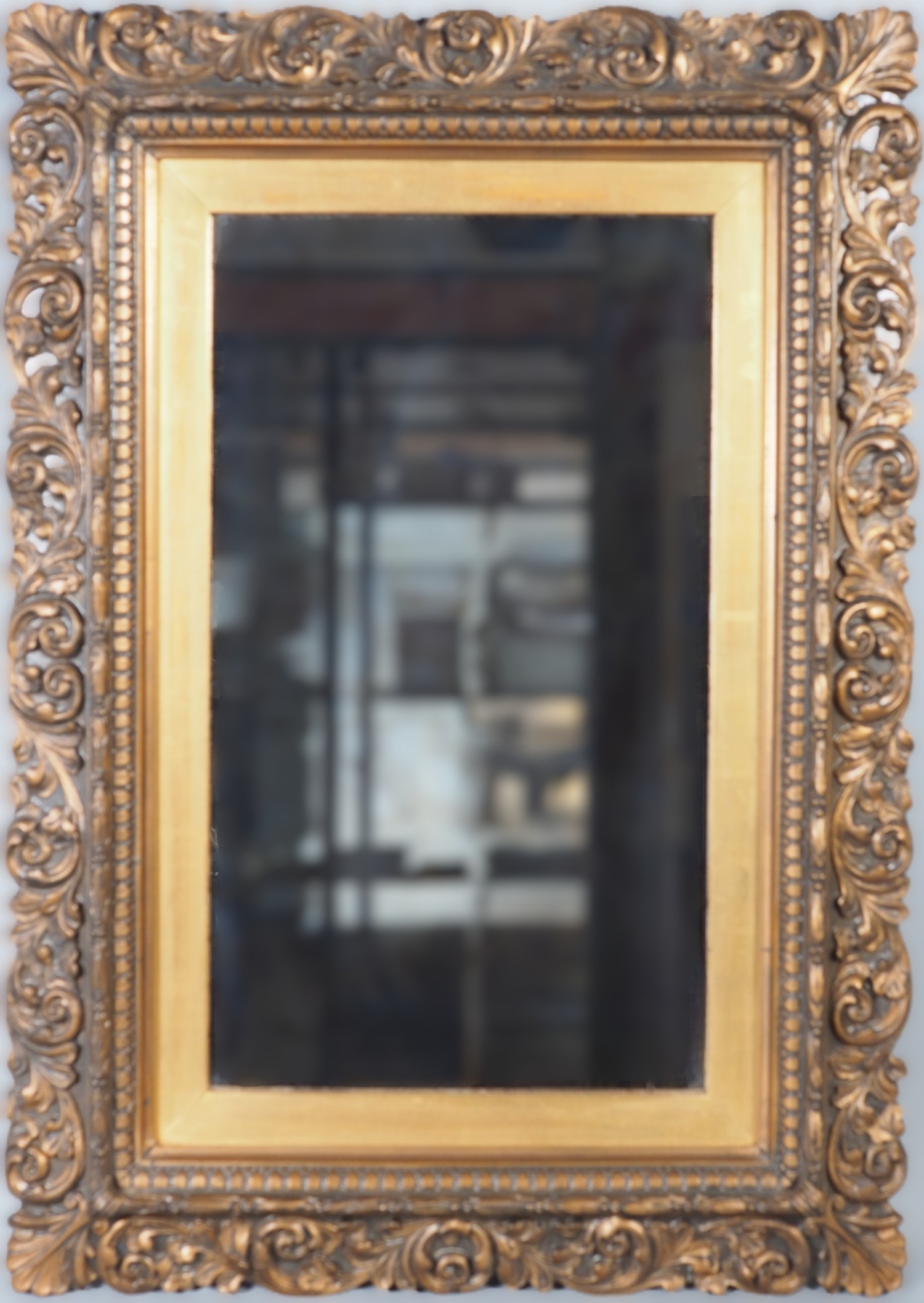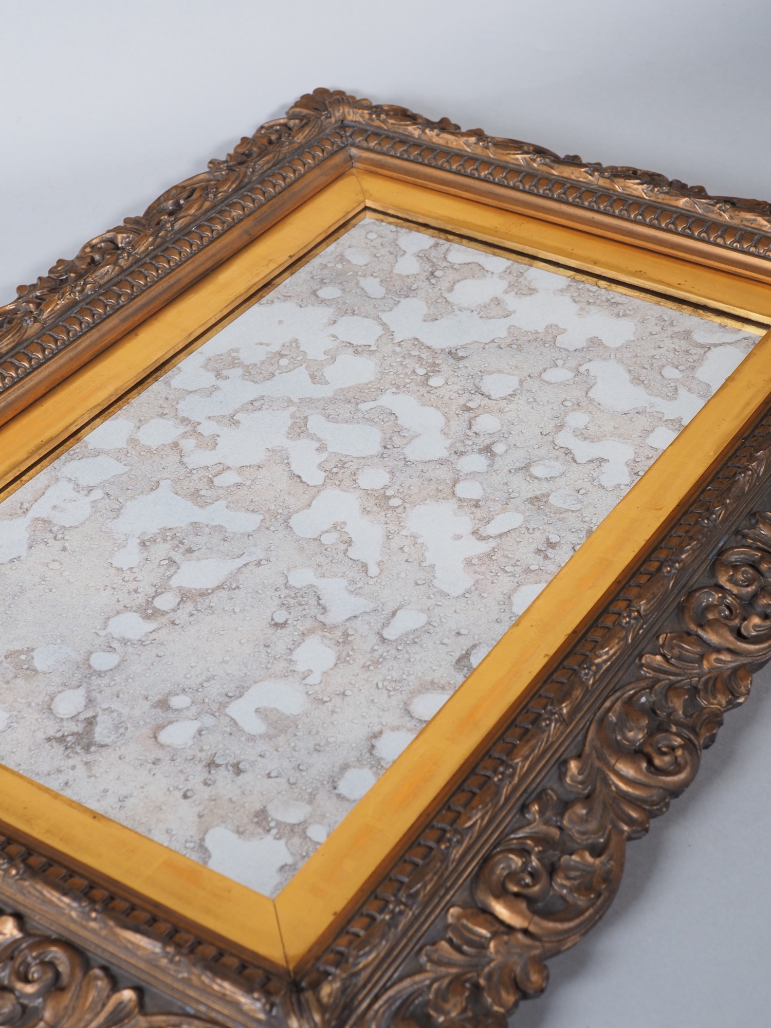 Spiegel mit einem stuckierten, mit Goldfarbe bemalten Holzrahmen im klassizistischen Stil, Spiegelglas neuzeitlich ersetzt. Maße mit Rahmen ca. 45,5 x 66 cm. Mit Alters- und Gebrauchsspuren, Rahmen mit Rissbildung, Spiegelglas künstlich gealtert.