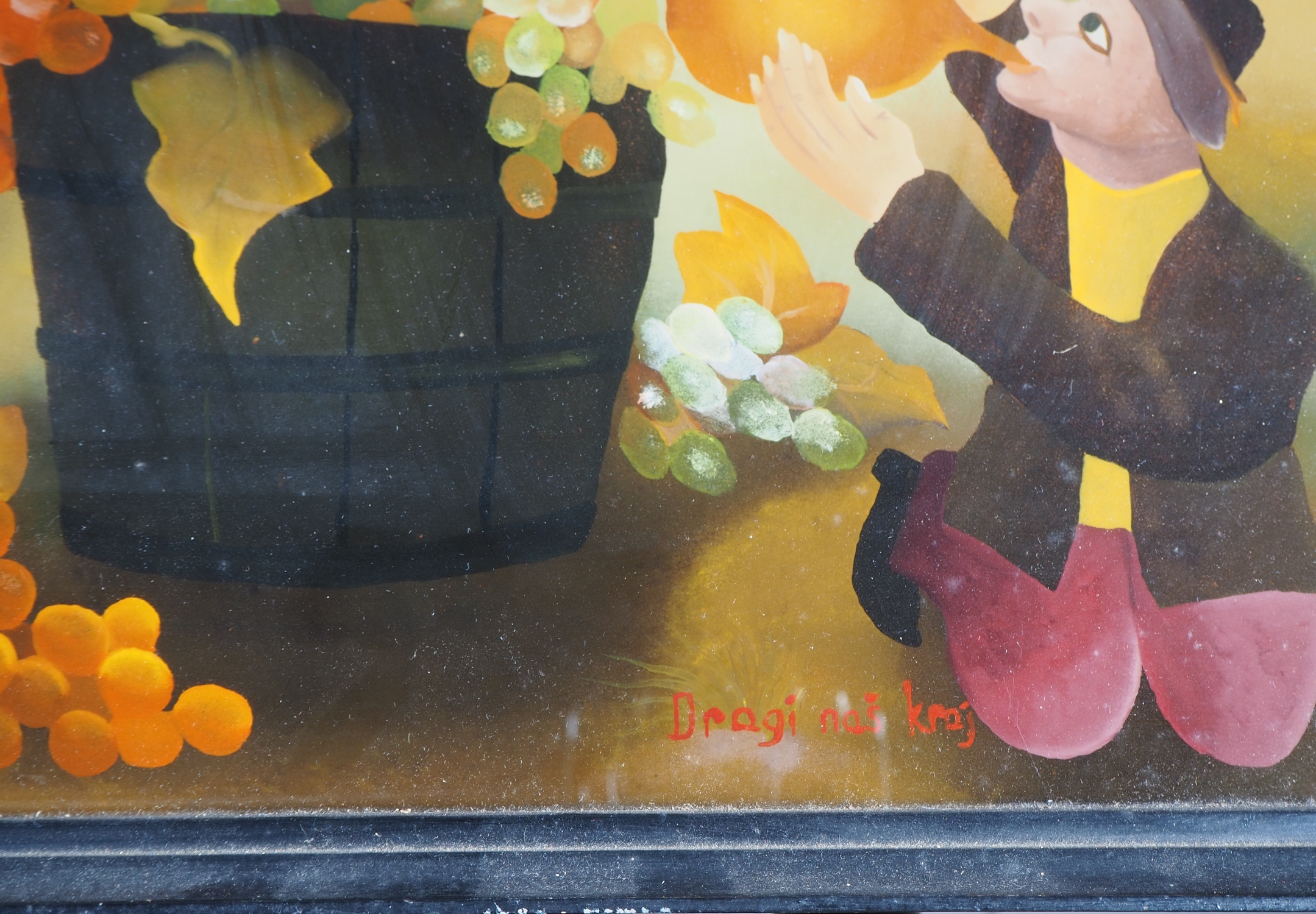 Hinterglasmalerei in einem bemalten Holzrahmen gerahmt. Im naiven Stil gemalte Darstellung von einem Haus auf einer violetten Wolke mit Rebstöcken, auf die ein Mann mit einer Leiter klettert um Trauben zu ernten. Ein weiterer Mann trinkt Wein aus einer bauchigen Flasche. Unten links signiert: Rak K. 77. Auf dem Haus bezeichnet: Vila Mos Mir. Maße mit Rahmen ca. 52,5 x 68 cm. Guter Erhaltungszustand mit wenigen Alters- und Gebrauchsspuren. Kein hauseigener Versand, nur MBE oder Abholung.