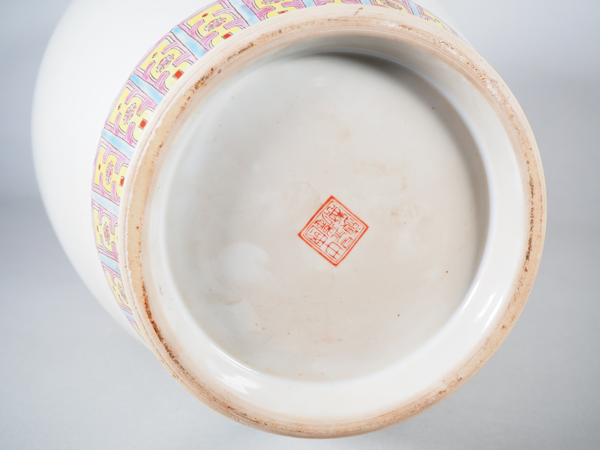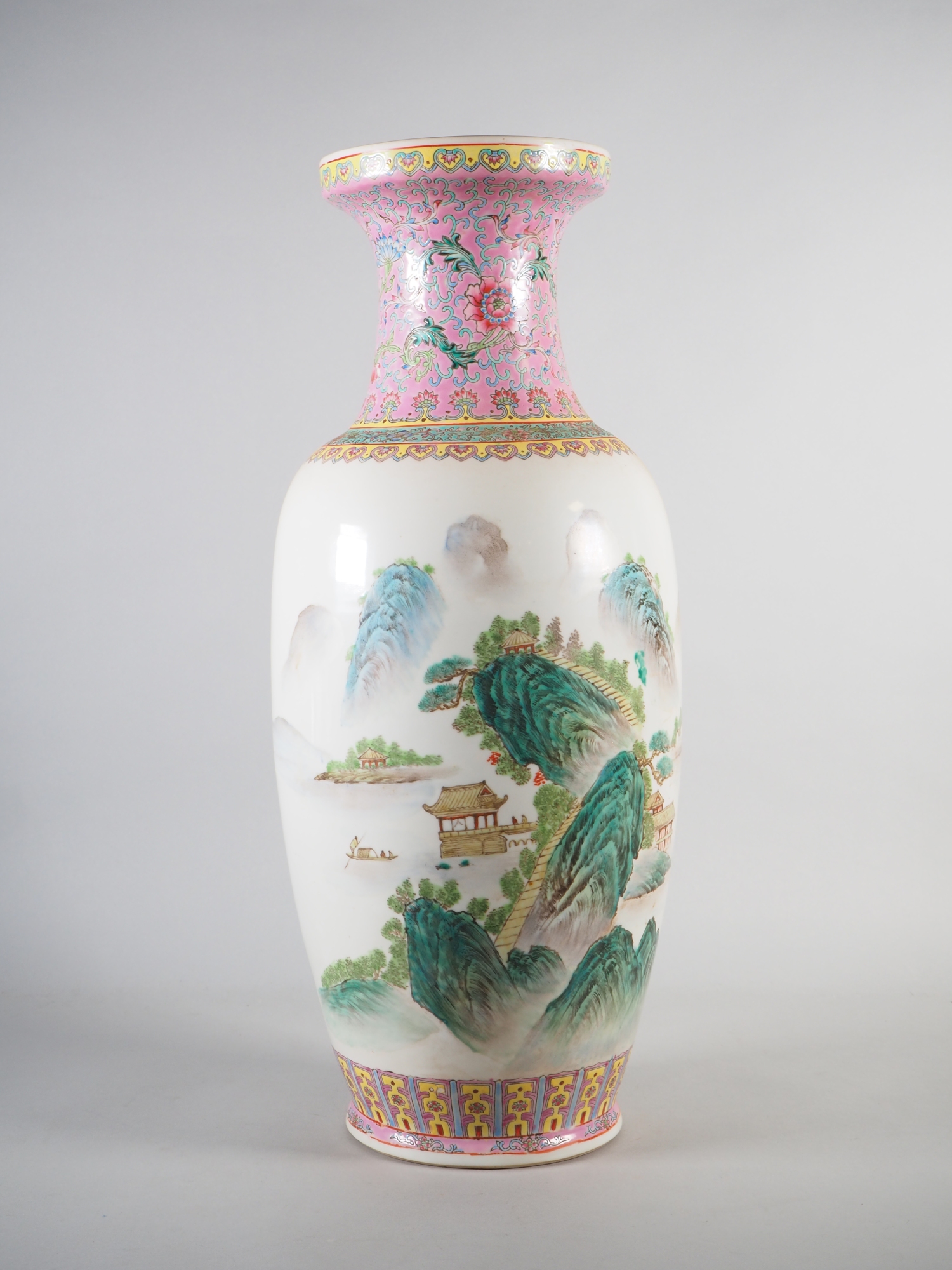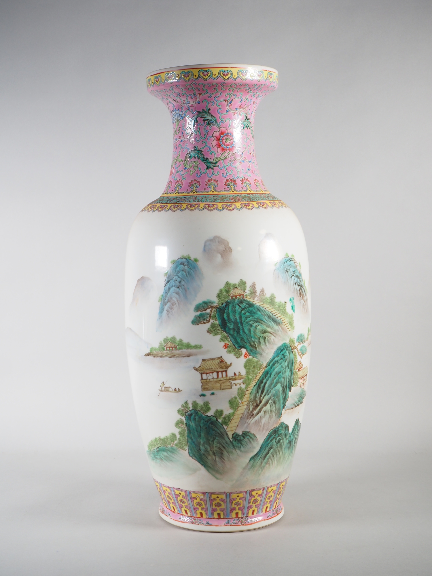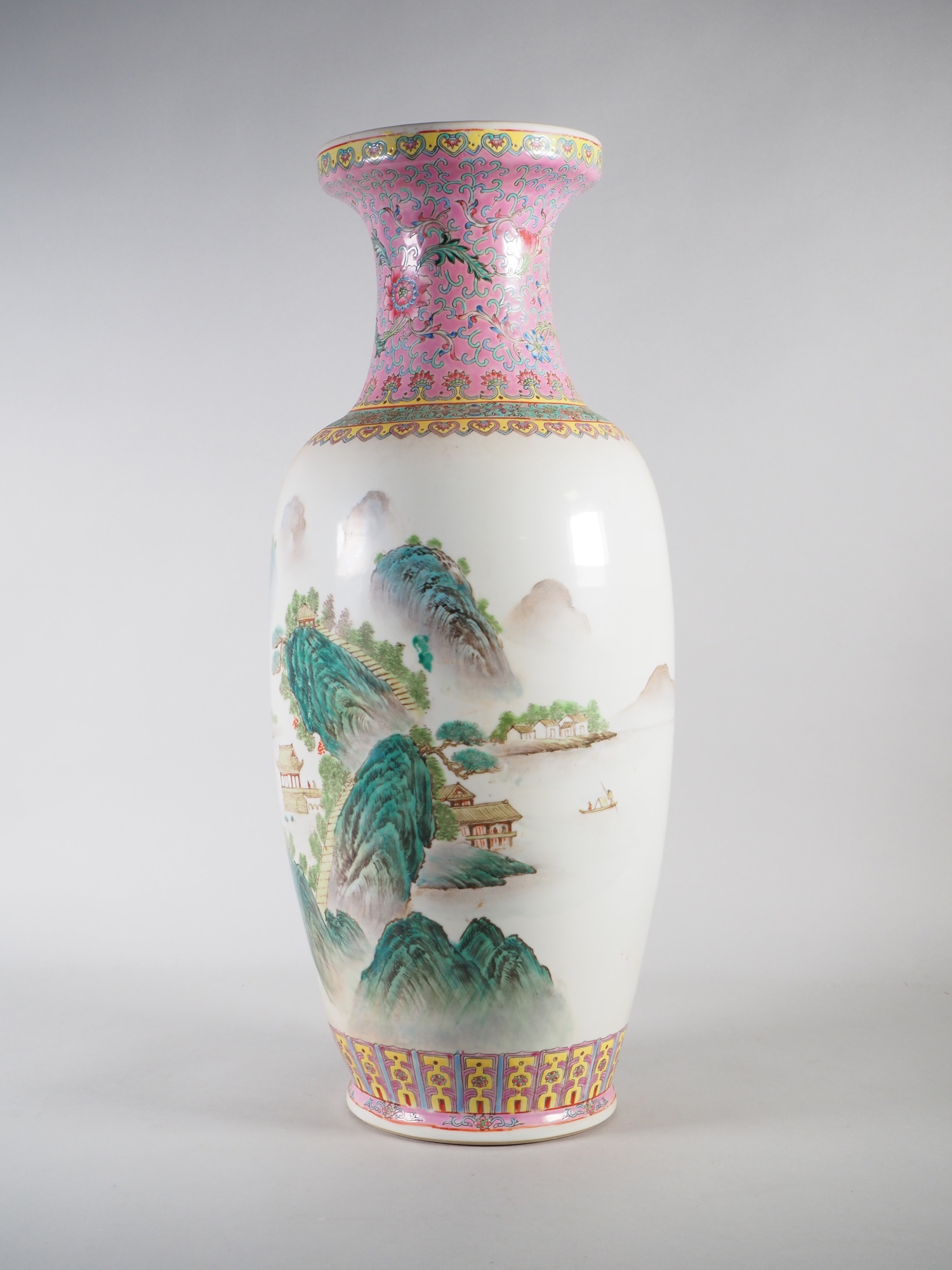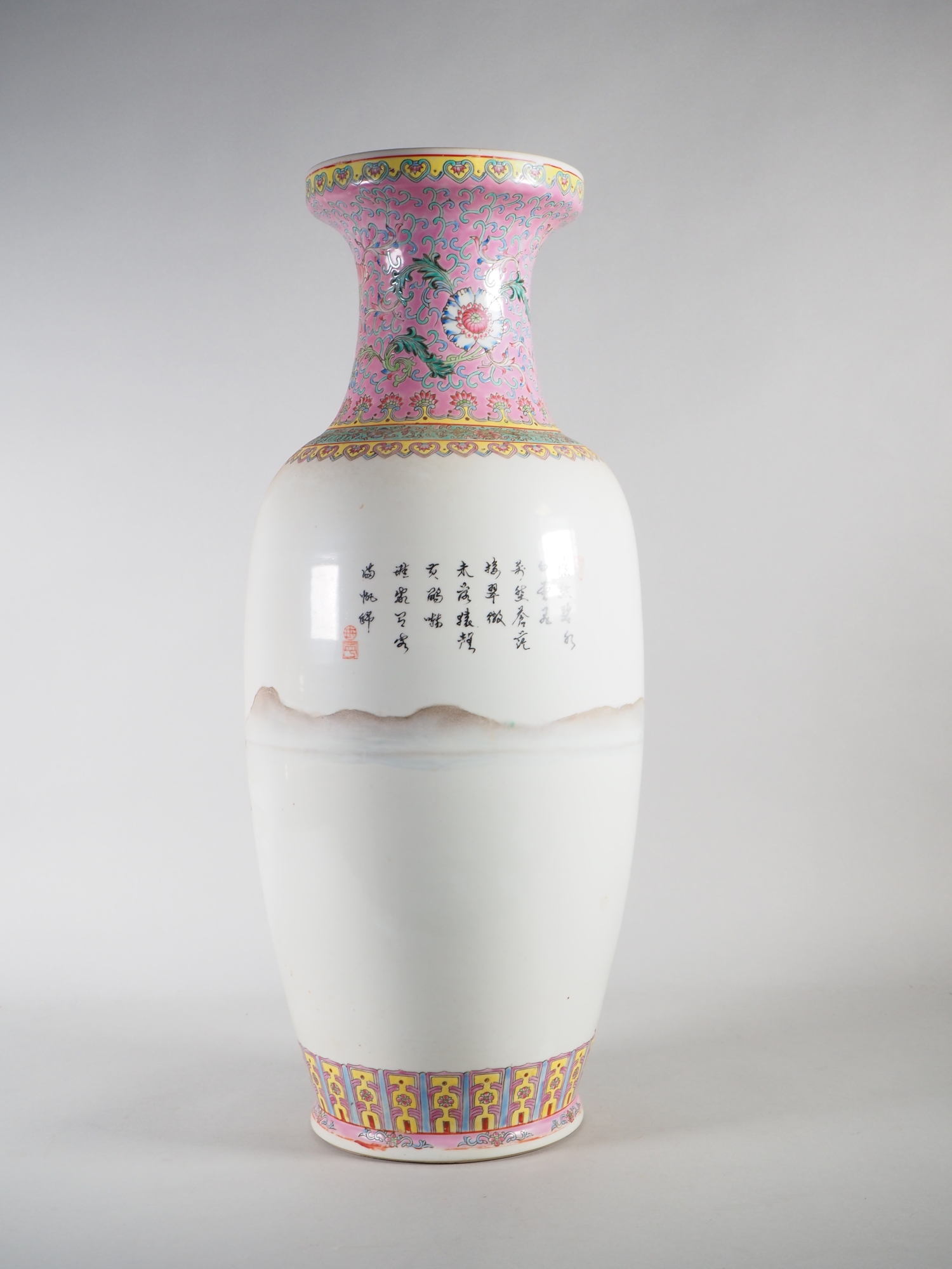 Balusterförmige Vase aus Porzellan, polychrom bemalt. Fuß und Halsung mit floralem Dekor mit dominierendem Rosa. in der Wandung weitläufige Landschaftsszene im traditionellen Stil der Literatenmalerei mit einem chinesischen Text (wohl Gedicht) auf der Rückseite. Am Boden gemarkt. Höhe ca. 62 cm. Mit leichten Alters- und Gebrauchsspuren, teilweise berieben.