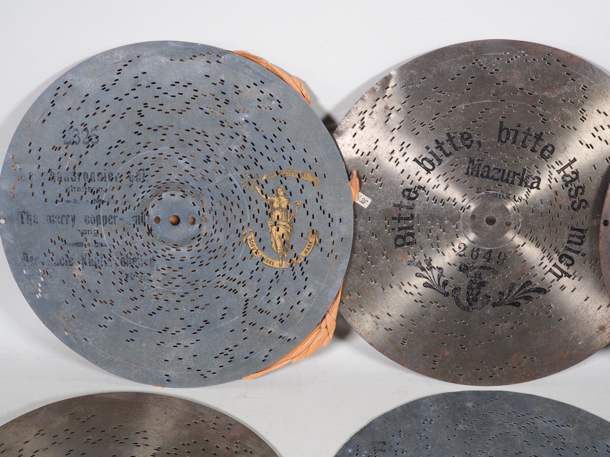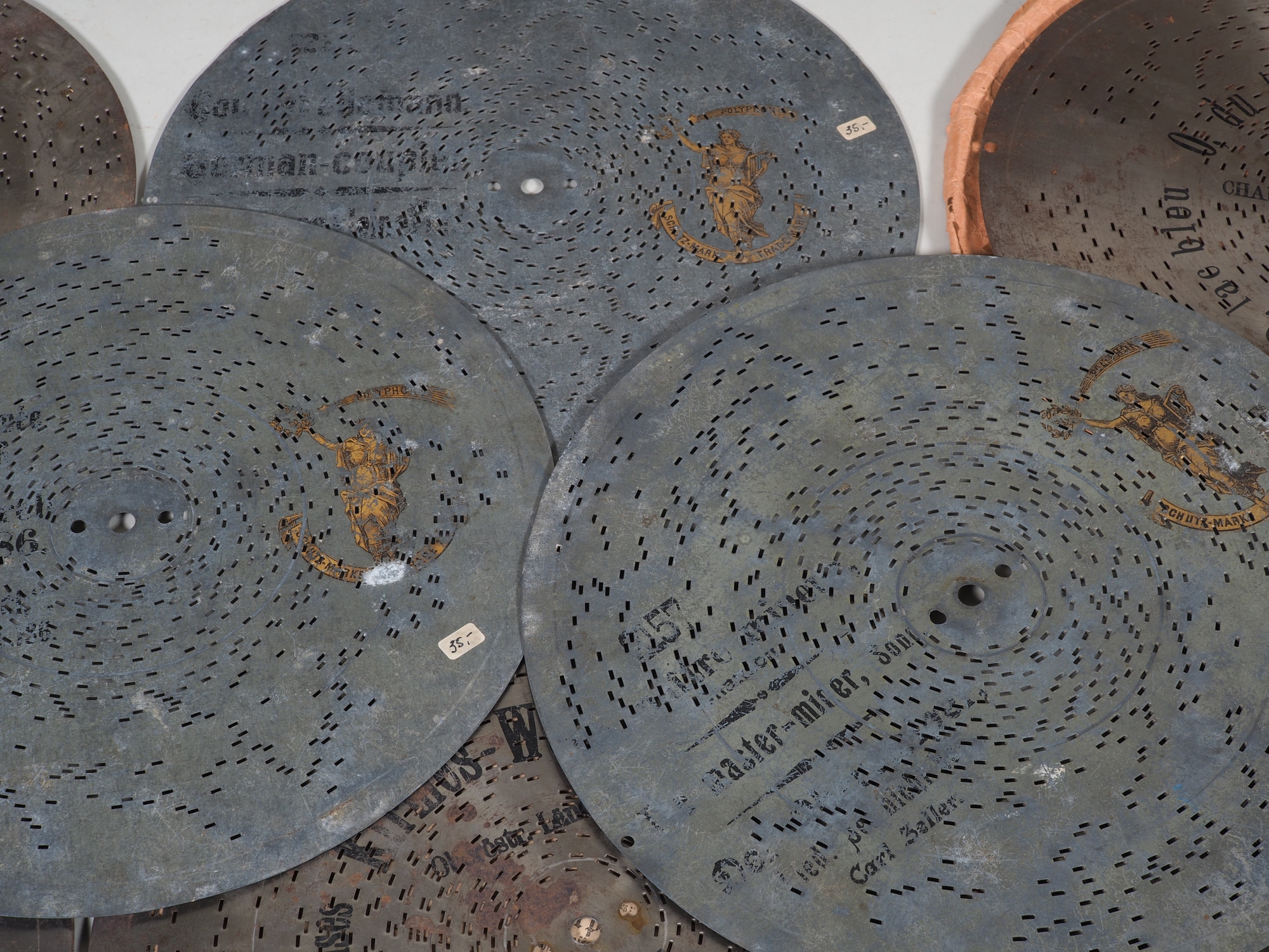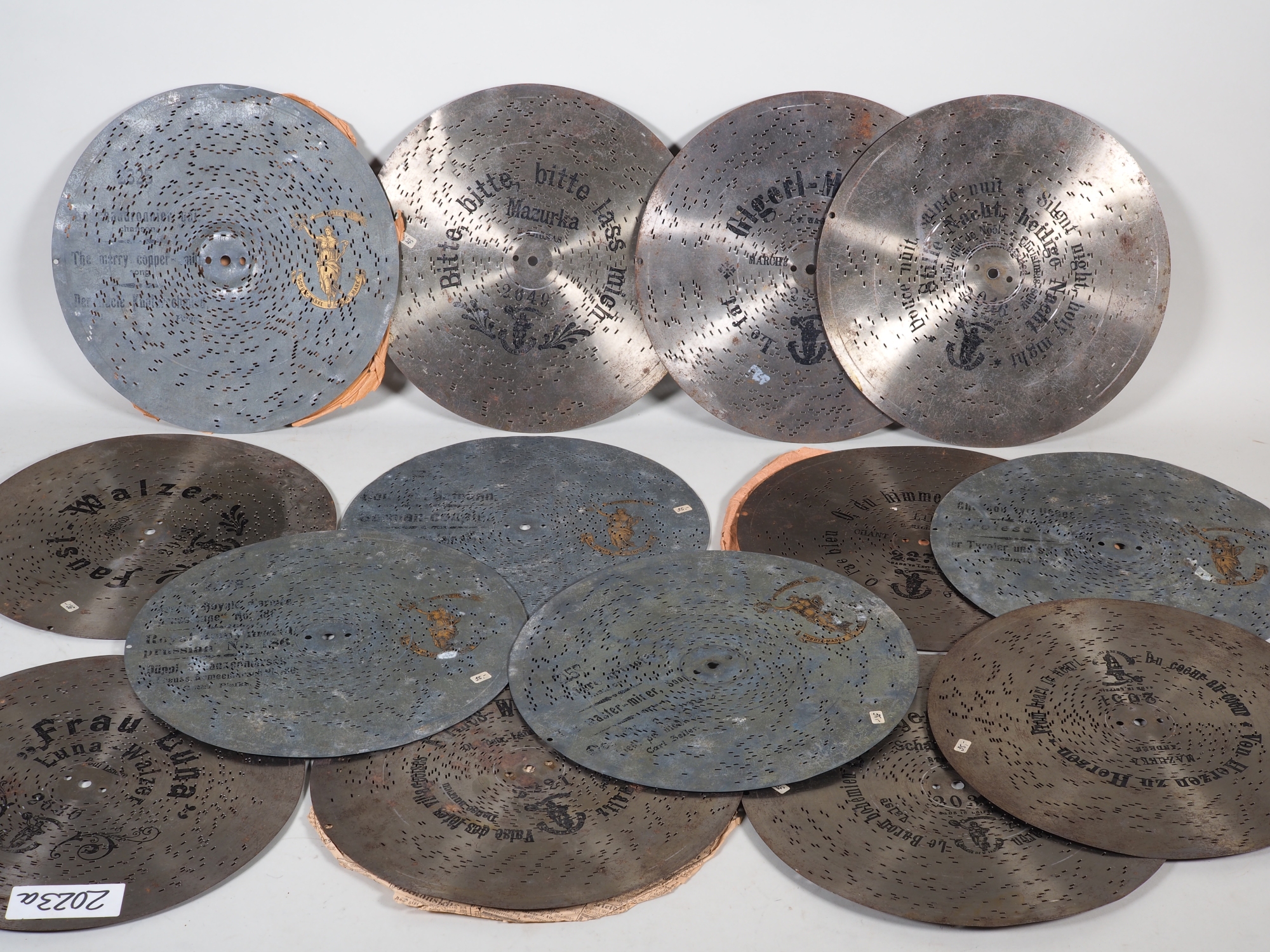 14 Polyphon Blechplatten mit 28cm Plattendurchmesser. Teilweise mit goldfarbenem Trademark Logo aufgedruckt. Verschiedene Melodien, u.a. Der Zigeunerbaron, Von Herzen zu Herzen, Faust Walzer, Kirmes Walzer, O, du himmelblauer See, Stille Nacht, Gigerl Marsch, Bitte lass mich, Frau Luna, usw. Weitestgehend guter Zustand, stellenweise Flugrost. Siehe Fotos.