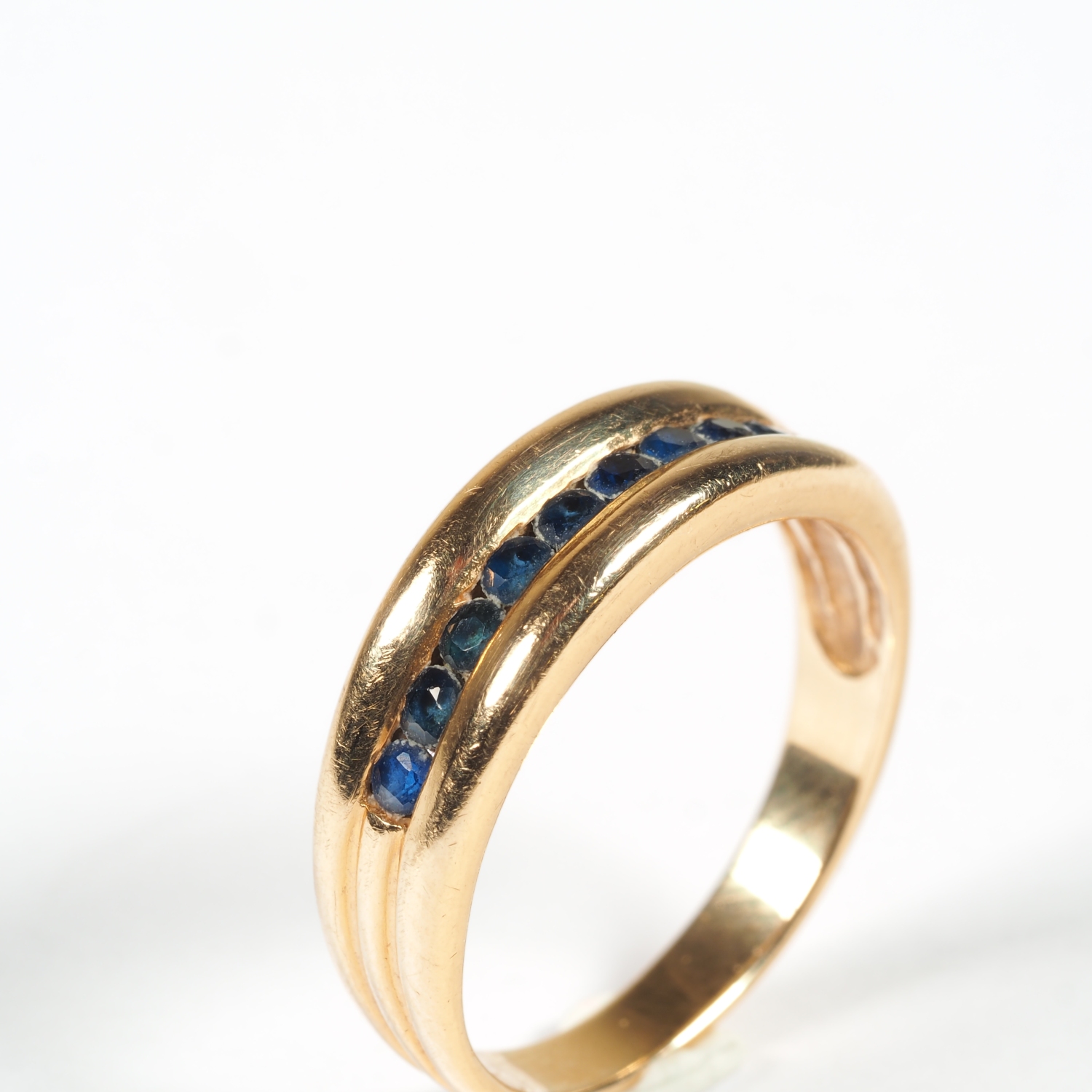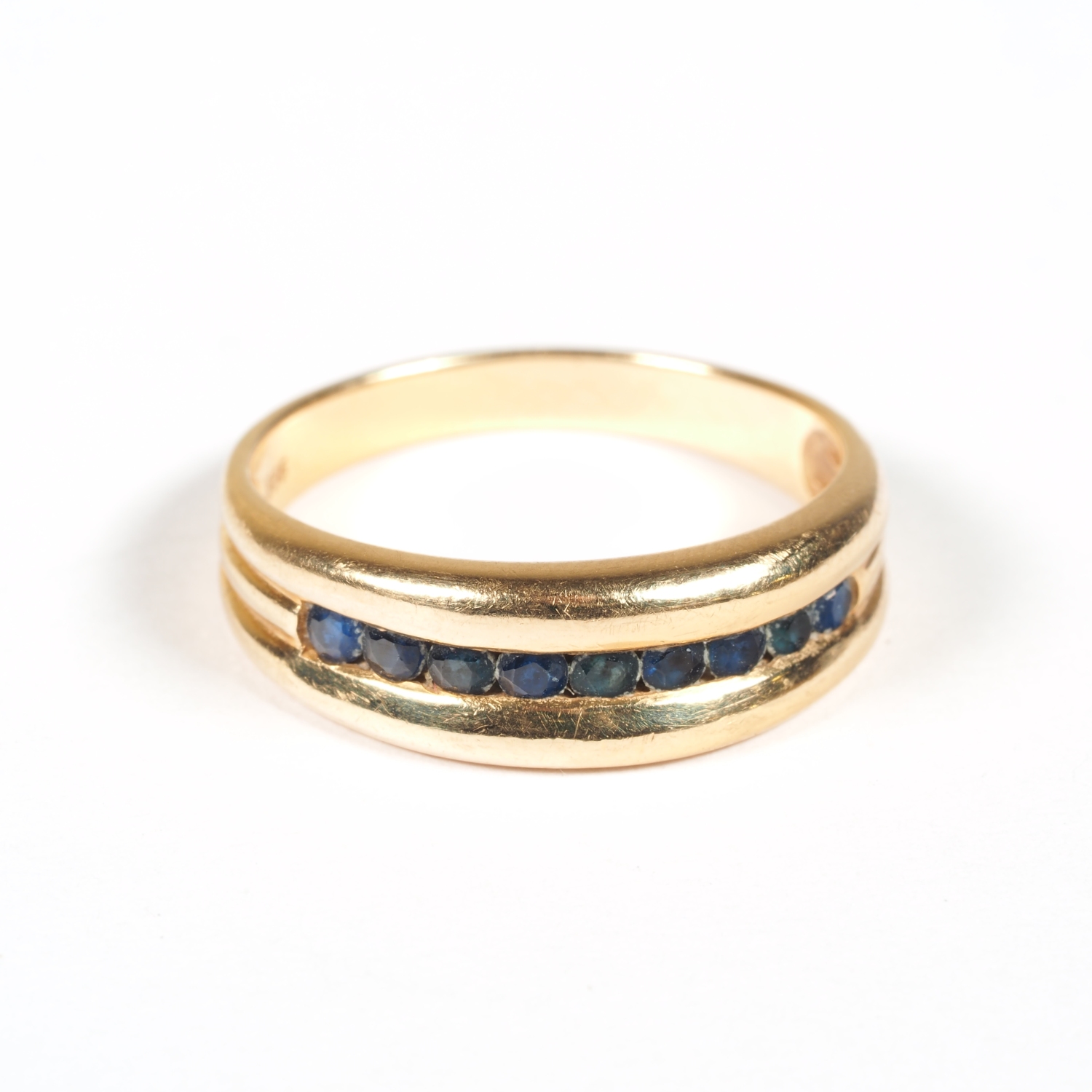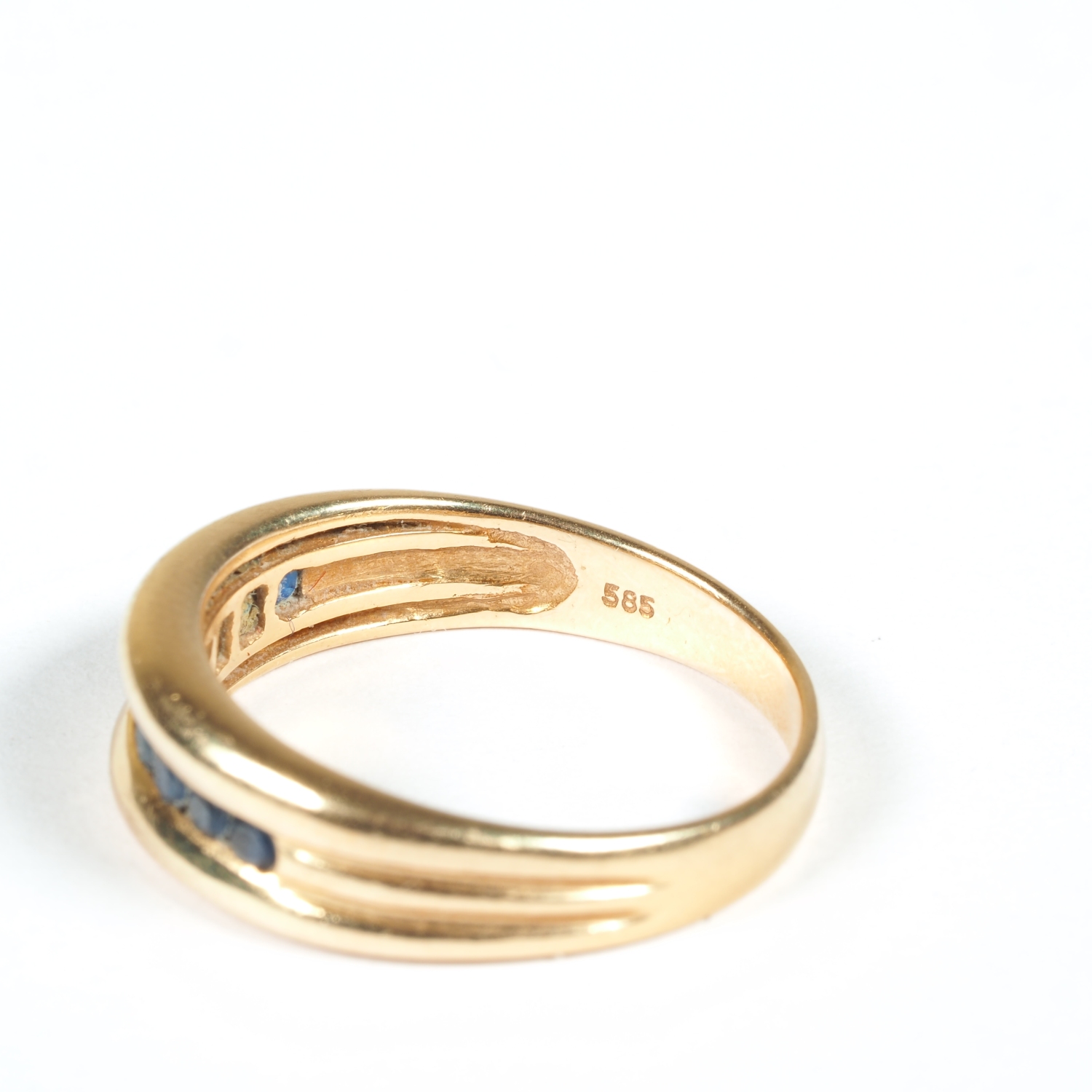 in Vertiefung gefasste Saphire über eine L. von ca. 17mm. Gewicht 4 gr. Ø innen 17,6 mm. Innen gestempelt „585“.