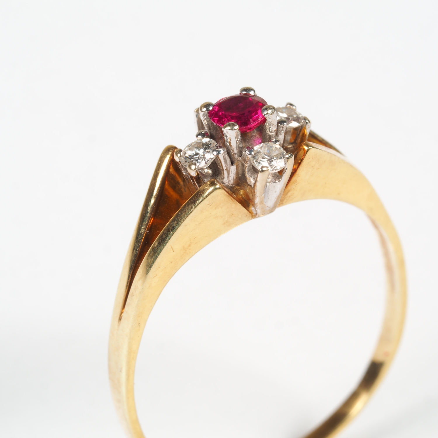 zentral gefasster Rubin, die Seiten mit je einem eingefassten Brillanten das ein Kreuz bildet. L. 25 mm. Gesamtgewicht 2,45 gr. Ø innen 16,75 x 17,8 mm. 585er Gelbgold (geprüft).