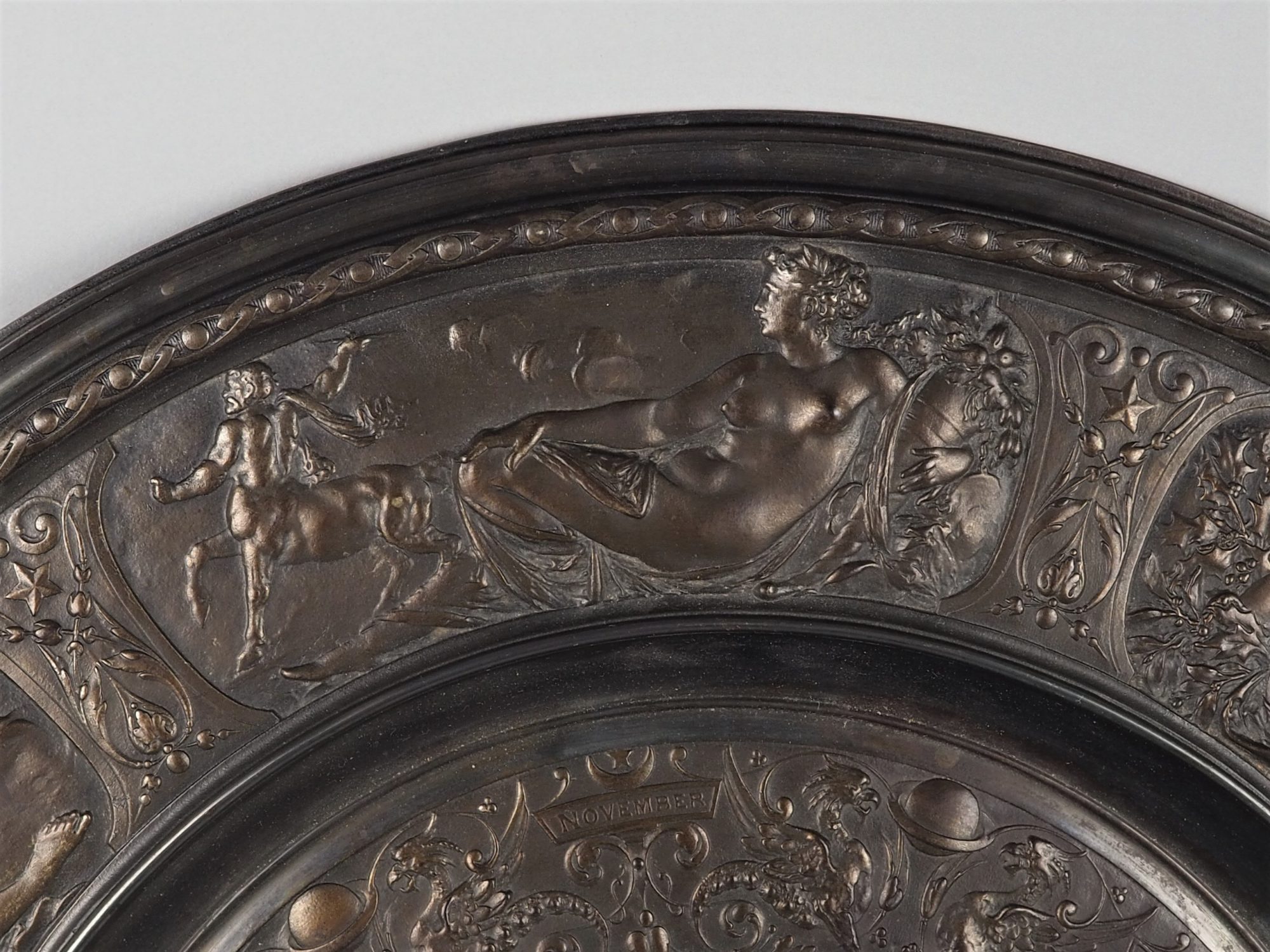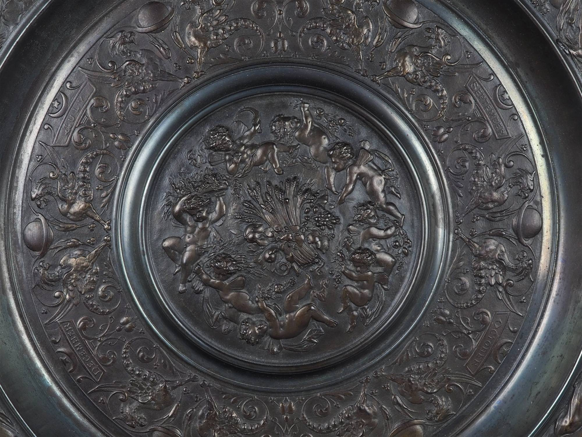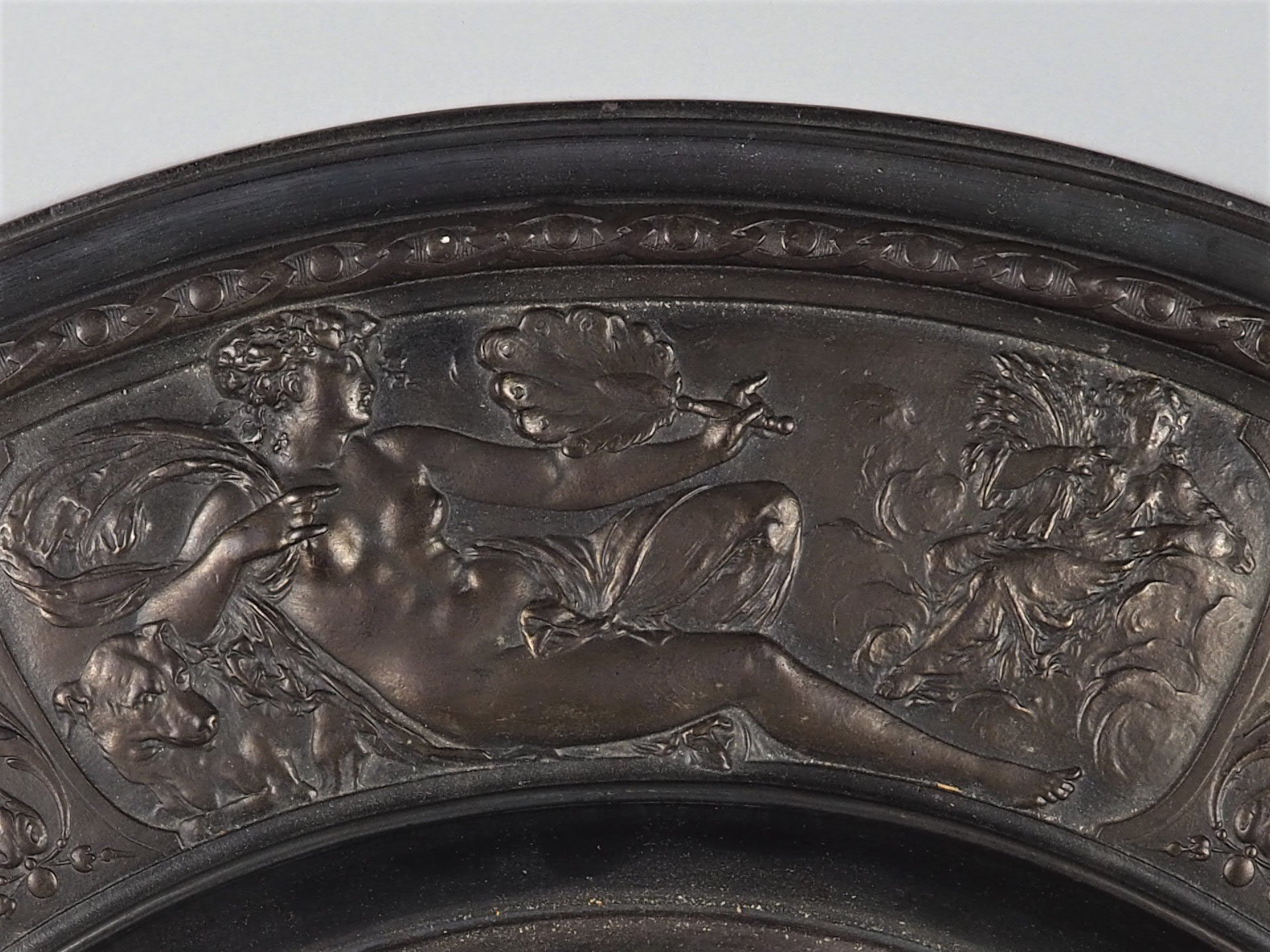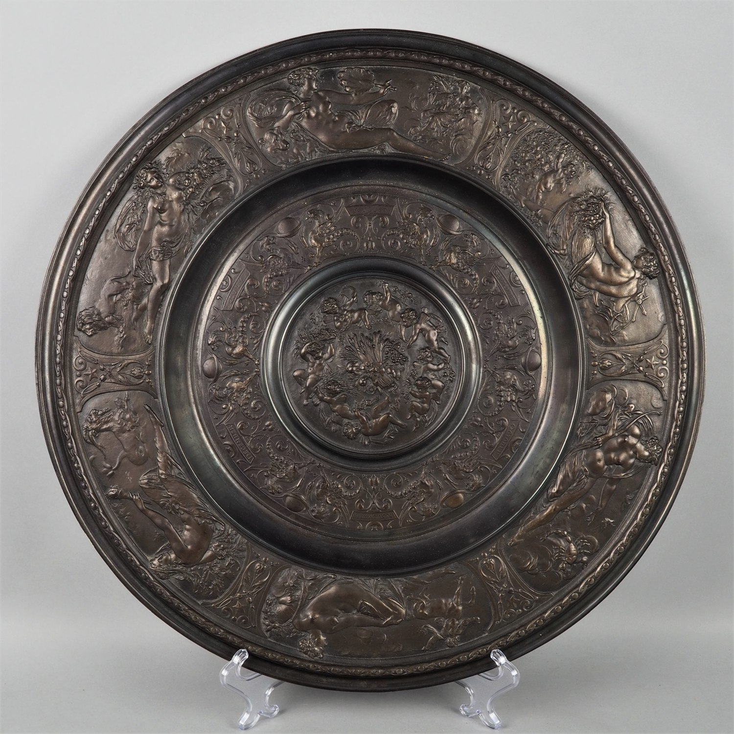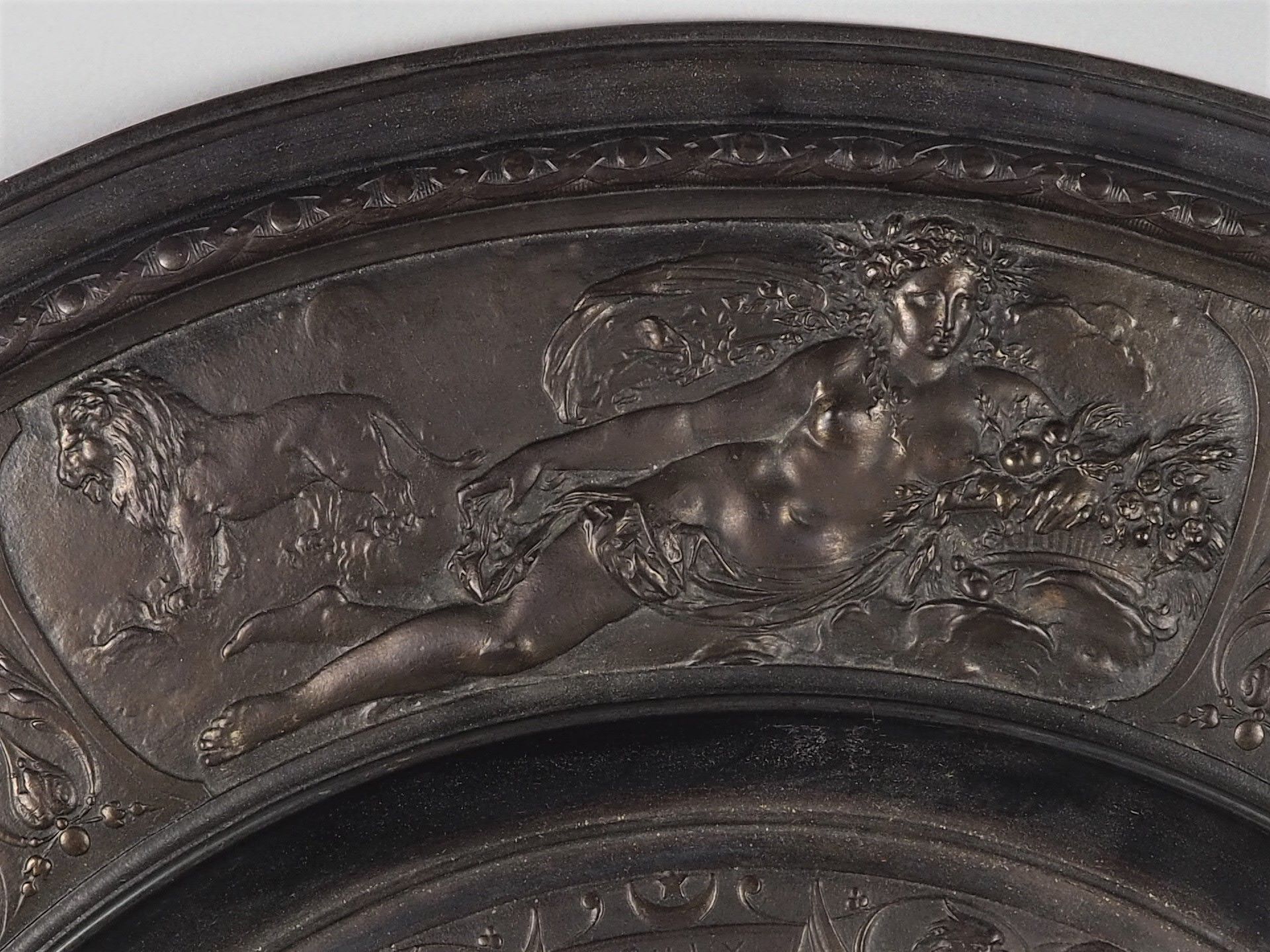 Sehr filigraner Eisenguss mit dunkler bronzefarbener Patinierung. Sehr breiter profilierter Außenrand und stark nach innen versetztes Mittelteil mit großer gebauchter Rosette. Insgesamt üppig verziert mit reliefierten Nymphen, Putten, Fabelwesen sowie florale Darstellungen. Wohl Berliner Eisen, sehr hochwertige Verarbeitung. Rückseitig mit Gießerstempel (schlecht leserlich) sowie Hängevorrichtung, guter Gebr. Zustand. Ø 53cm