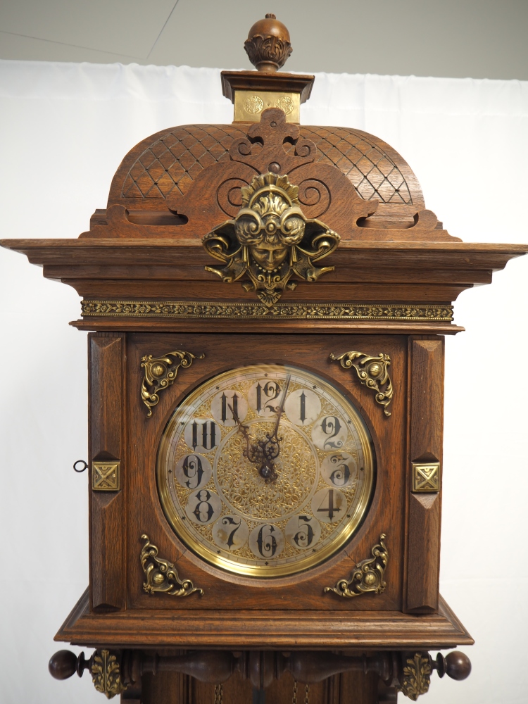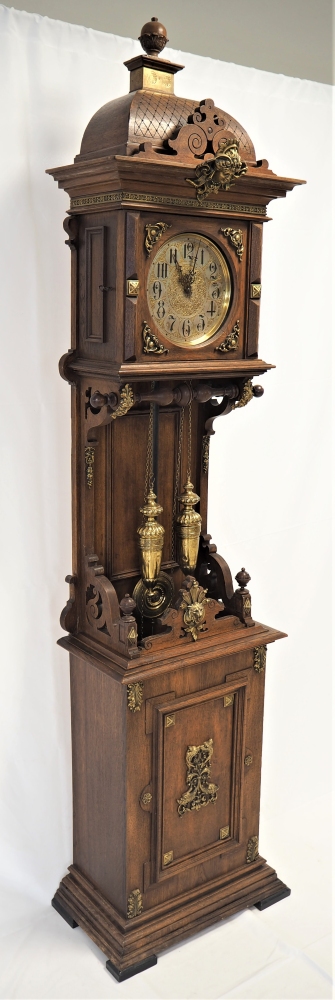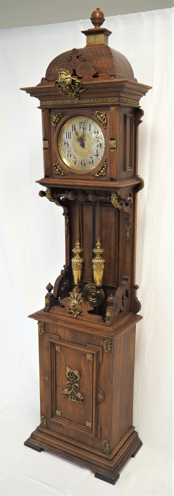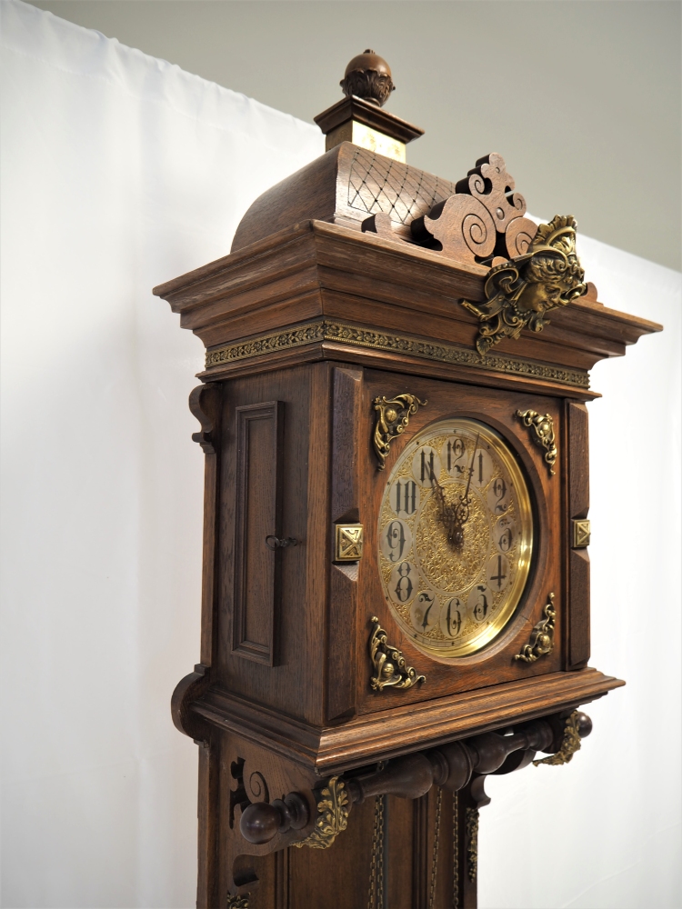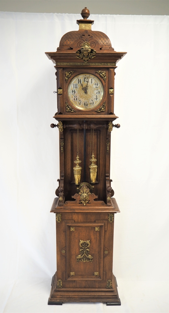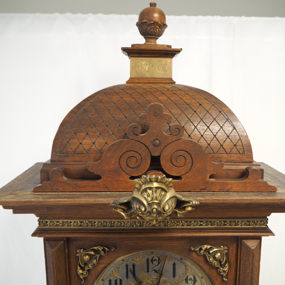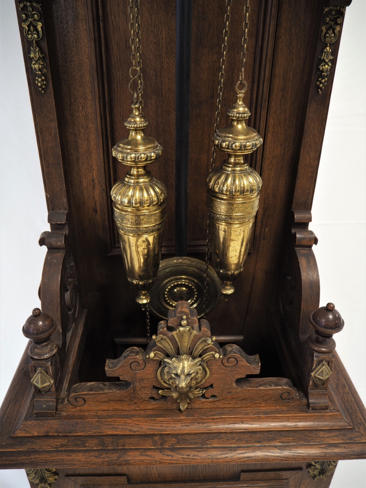 Prunkgehäuse aus Eiche, dunkel gebeizt. Aufwendig verziert mit Bronze-Beschlägen, Werk mit 8-Tages-Gangdauer. Halb- und Stundenschlag auf Klangspirale. Ziffernblatt, Gewichte und Pendellinse in Messing. Graviert und verziert. Werk gepunzt, mit Firmen Signet „Lenzkirch A.G.U.“ und Nr. 719372. Seltene Sammler-Uhr in dieser Qualität.
