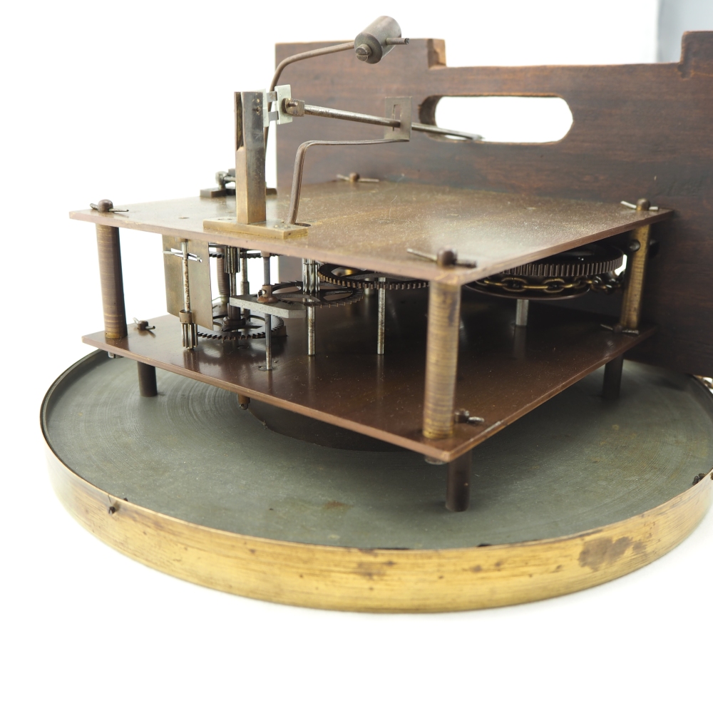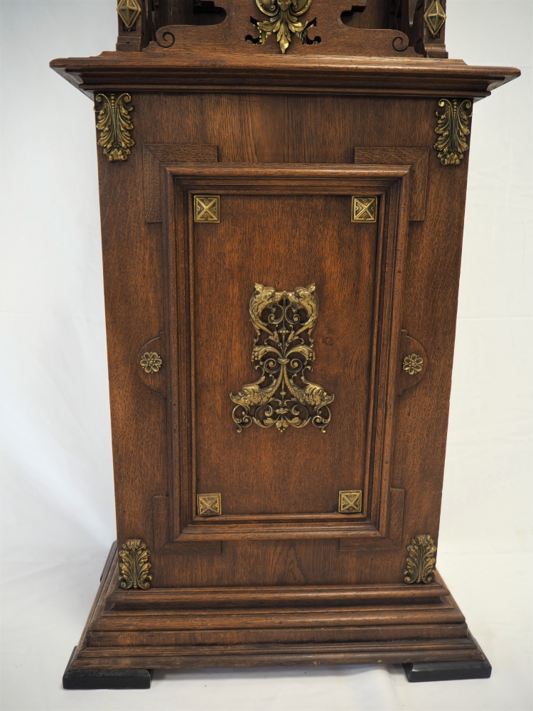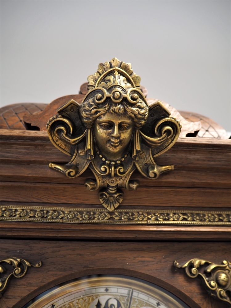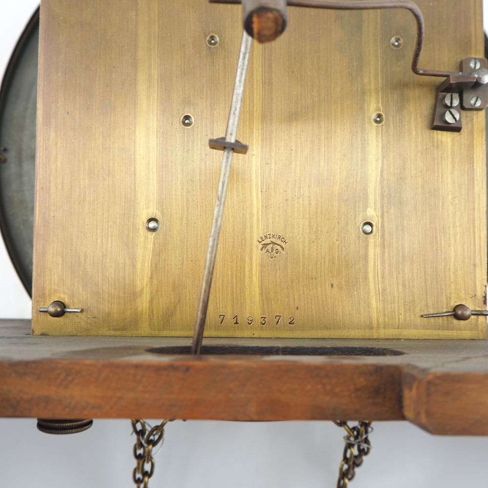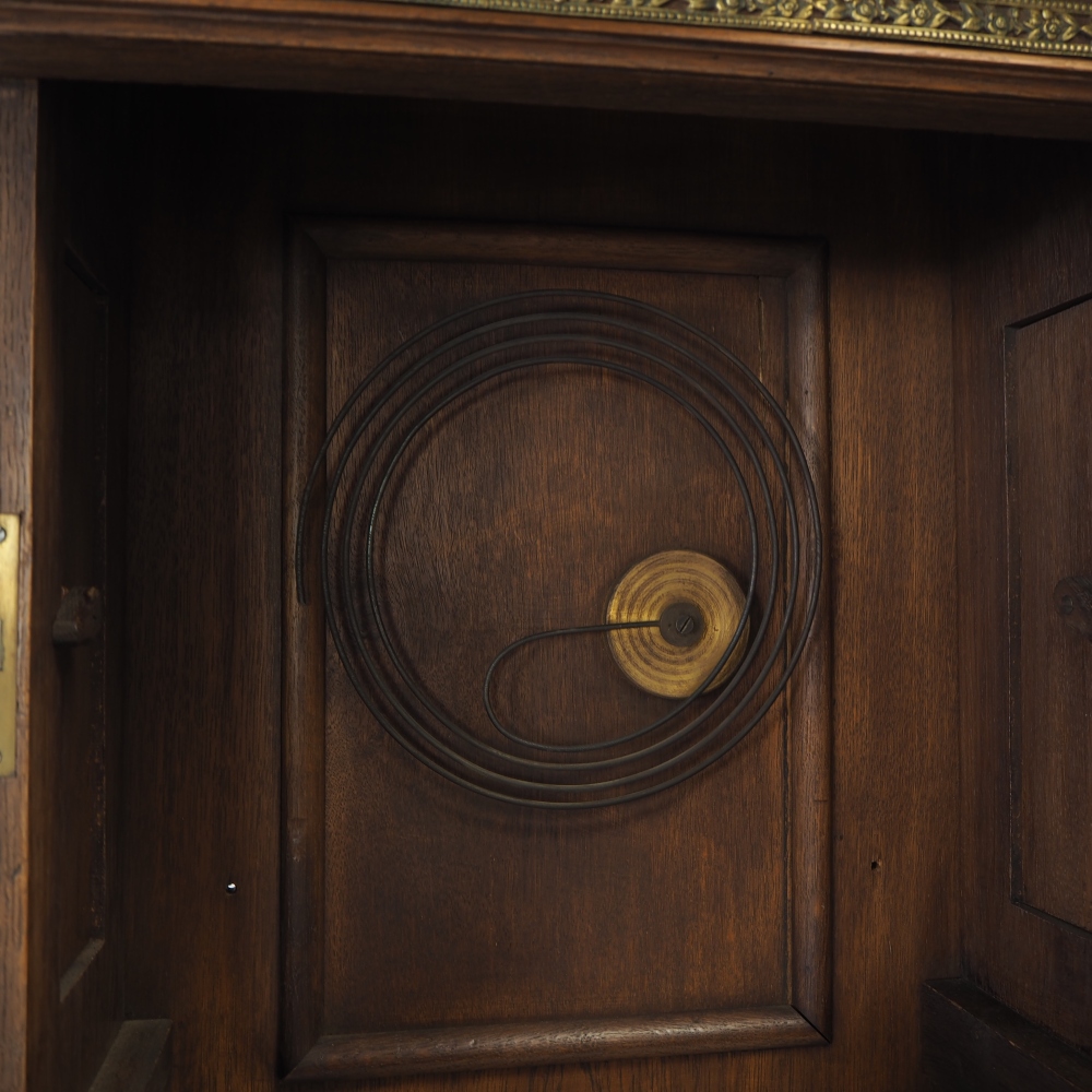 Prunkgehäuse aus Eiche, dunkel gebeizt. Aufwendig verziert mit Bronze-Beschlägen, Werk mit 8-Tages-Gangdauer. Halb- und Stundenschlag auf Klangspirale. Ziffernblatt, Gewichte und Pendellinse in Messing. Graviert und verziert. Werk gepunzt, mit Firmen Signet „Lenzkirch A.G.U.“ und Nr. 719372. Seltene Sammler-Uhr in dieser Qualität.