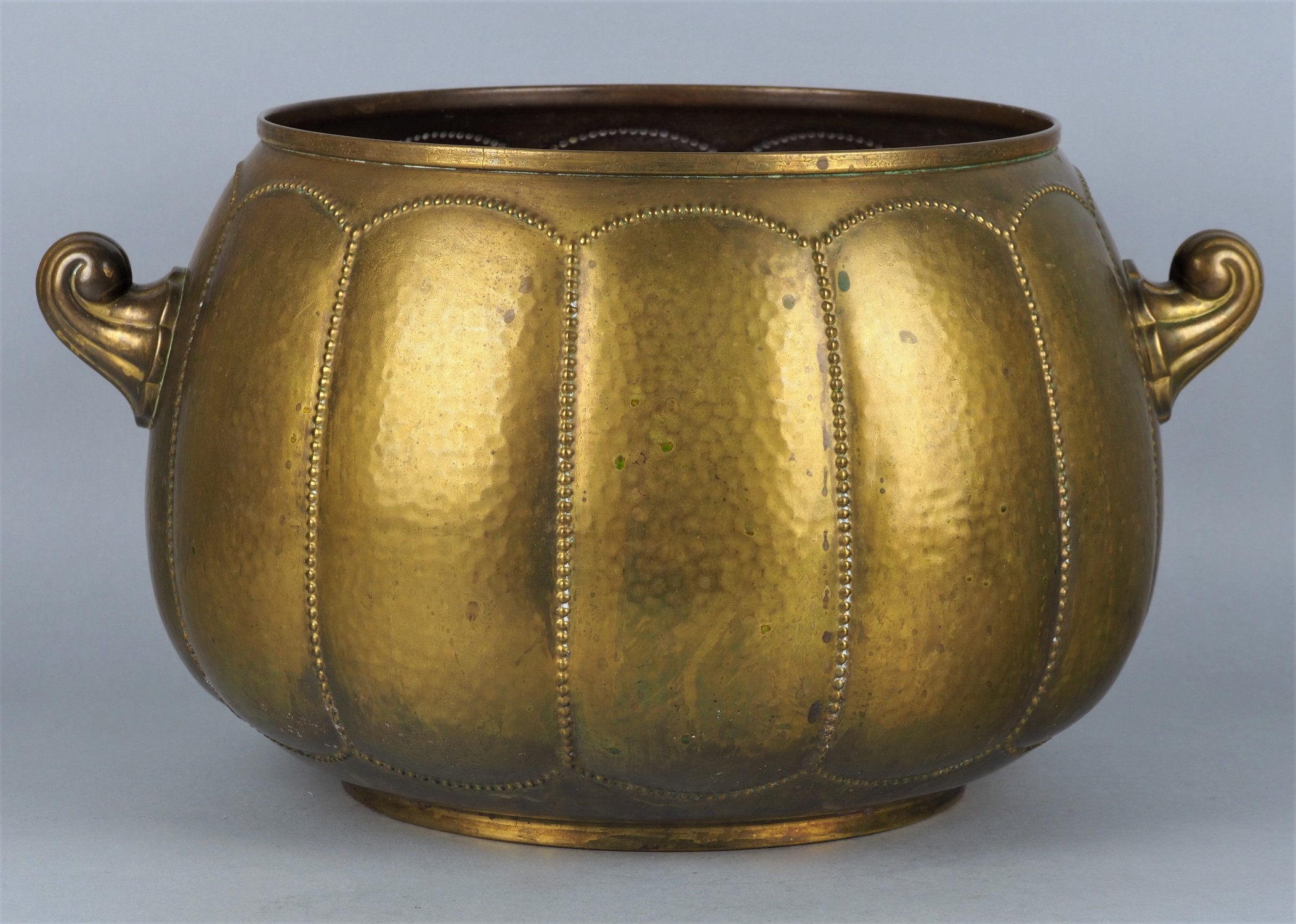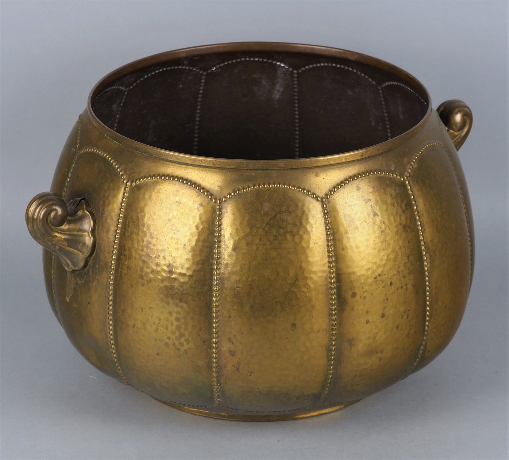 Aus Messing geformter Topf mit Perlverzierungen und leichter Hammerschlag Optik. Seitlich mit Handhaben, Alters- und Gebr. Spuren. Am Boden Herstellerpunze. Mit Alters- und Gebr. Spuren. H. 21cm, Ø ca. 23cm