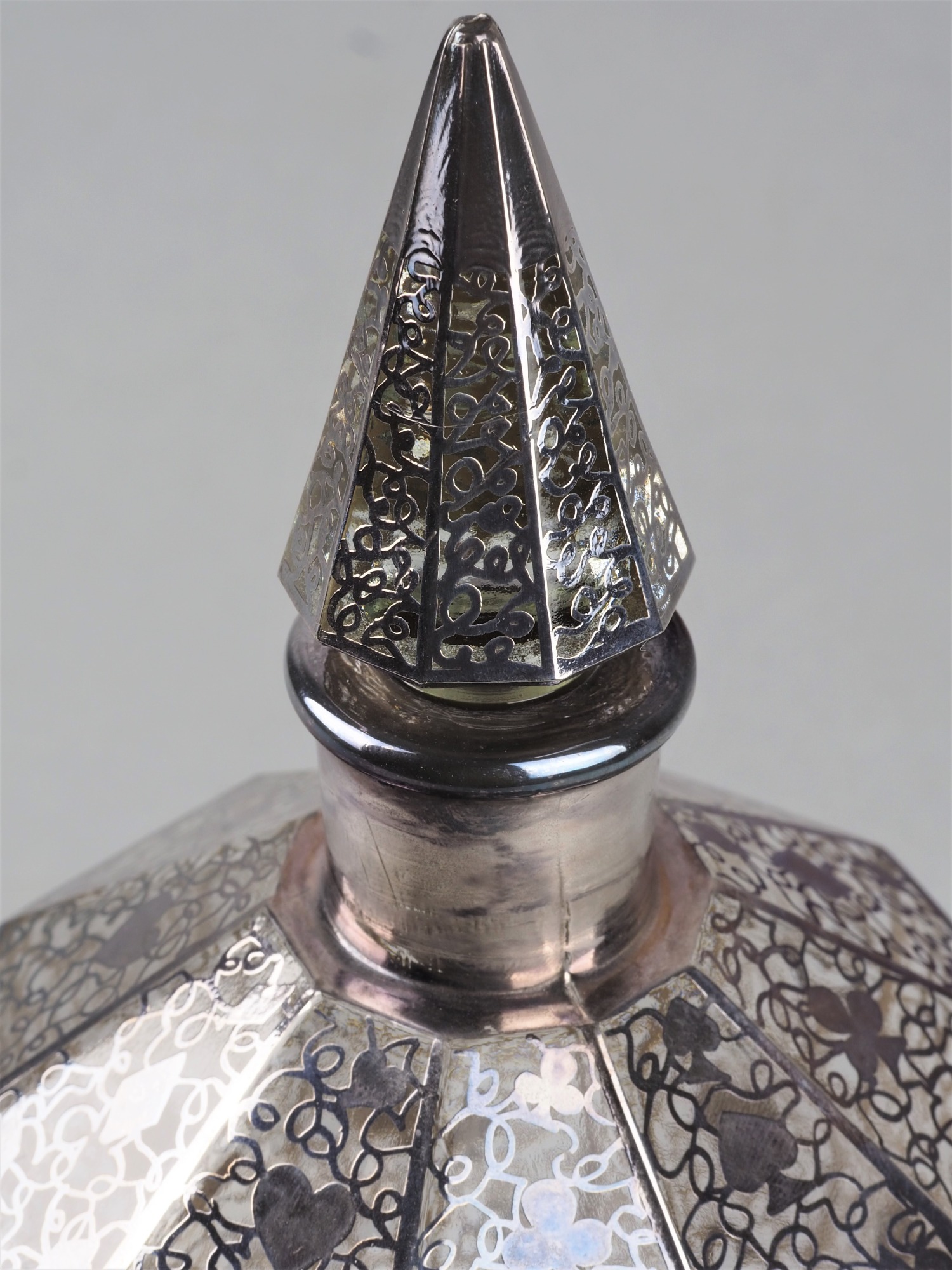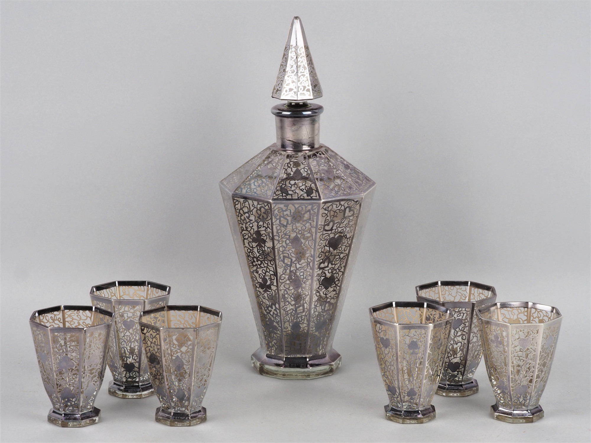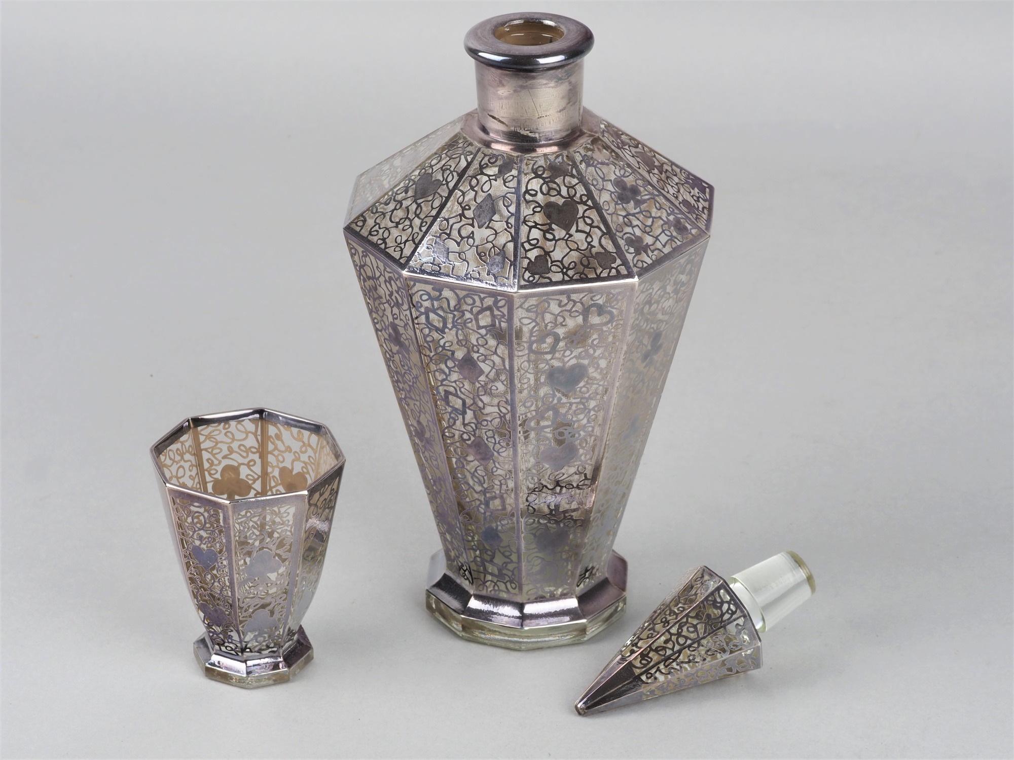 Aus durchsichtigem Kristallglas gearbeitet, mit Silber Overlay verziert. Bestehend aus Karaffe mit Stöpsel und sechs Stampern. Konische Form, sich nach oben öffnend, guter gebrauchter Zustand. Wohl England um 1930. Karaffe: H. 25cm, Ø 11cm, Stampern: H. 7cm, Ø 6cm