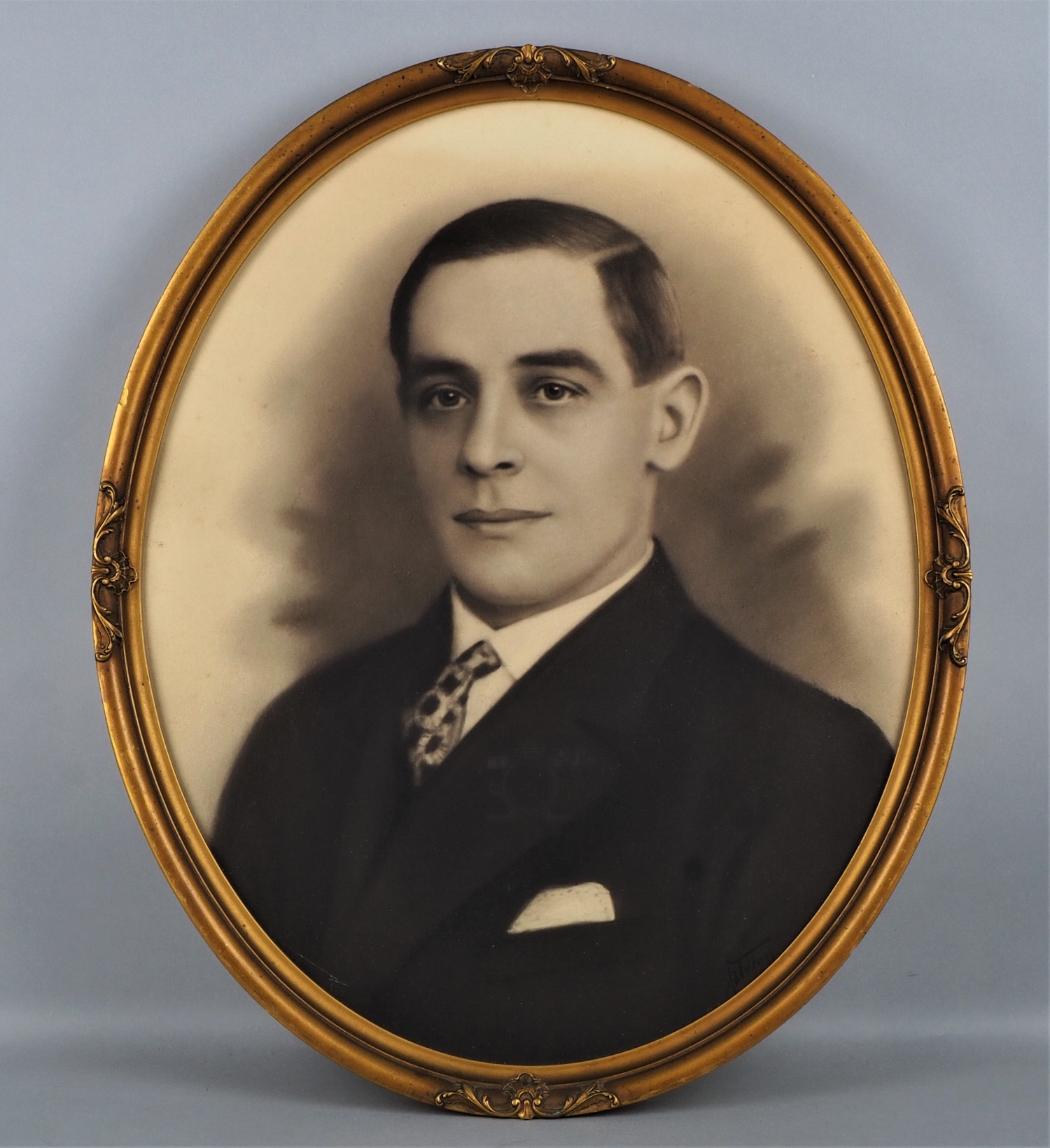 Kohlezeichnung auf Karton. Darstellung eines jungen Herrn im Anzug und Krawatte, mit leicht lächelnden Zügen. Hinter Glas gerahmt, ovale Form, unten rechts signiert. H. 54cm, B. 44cm