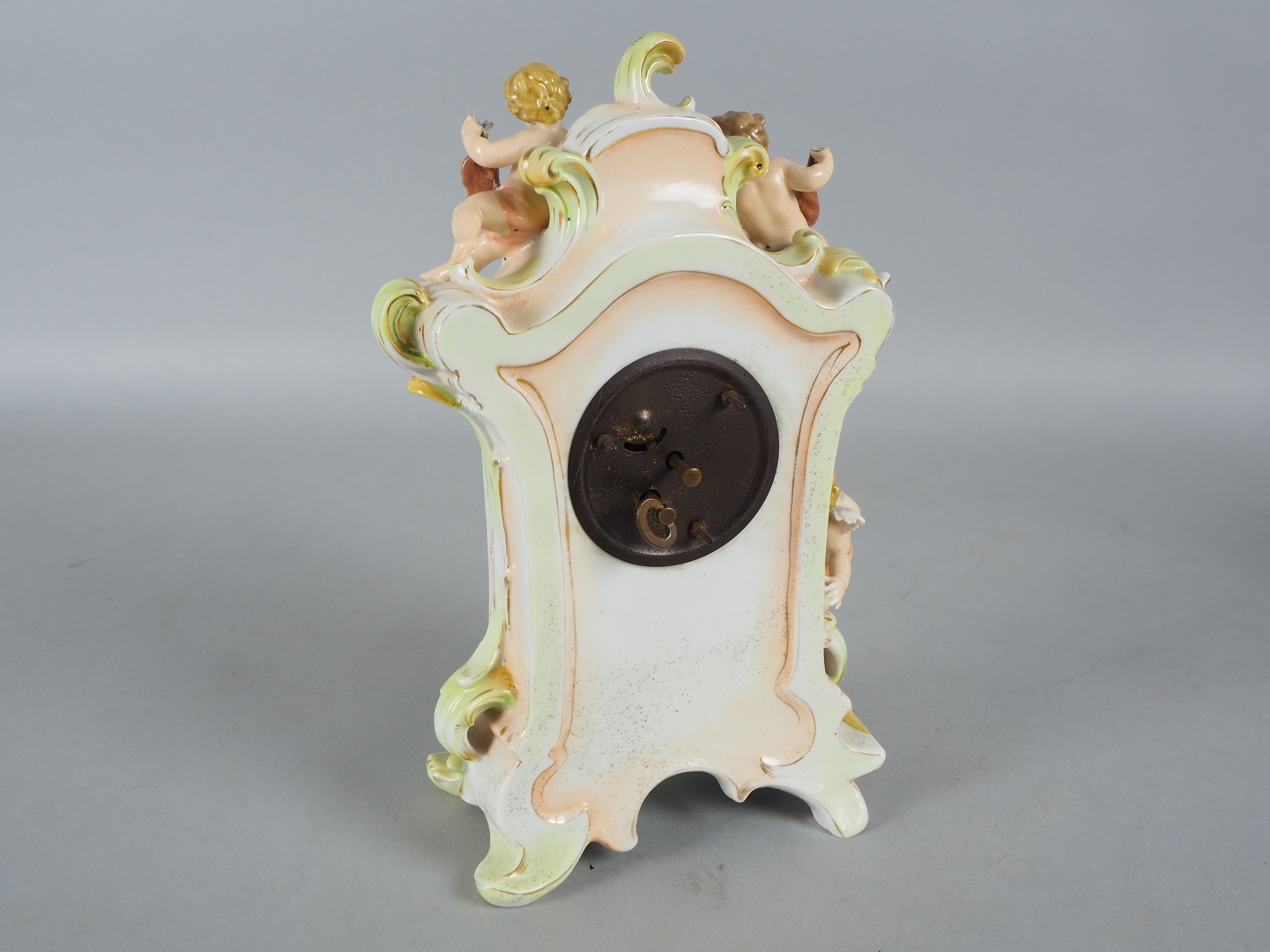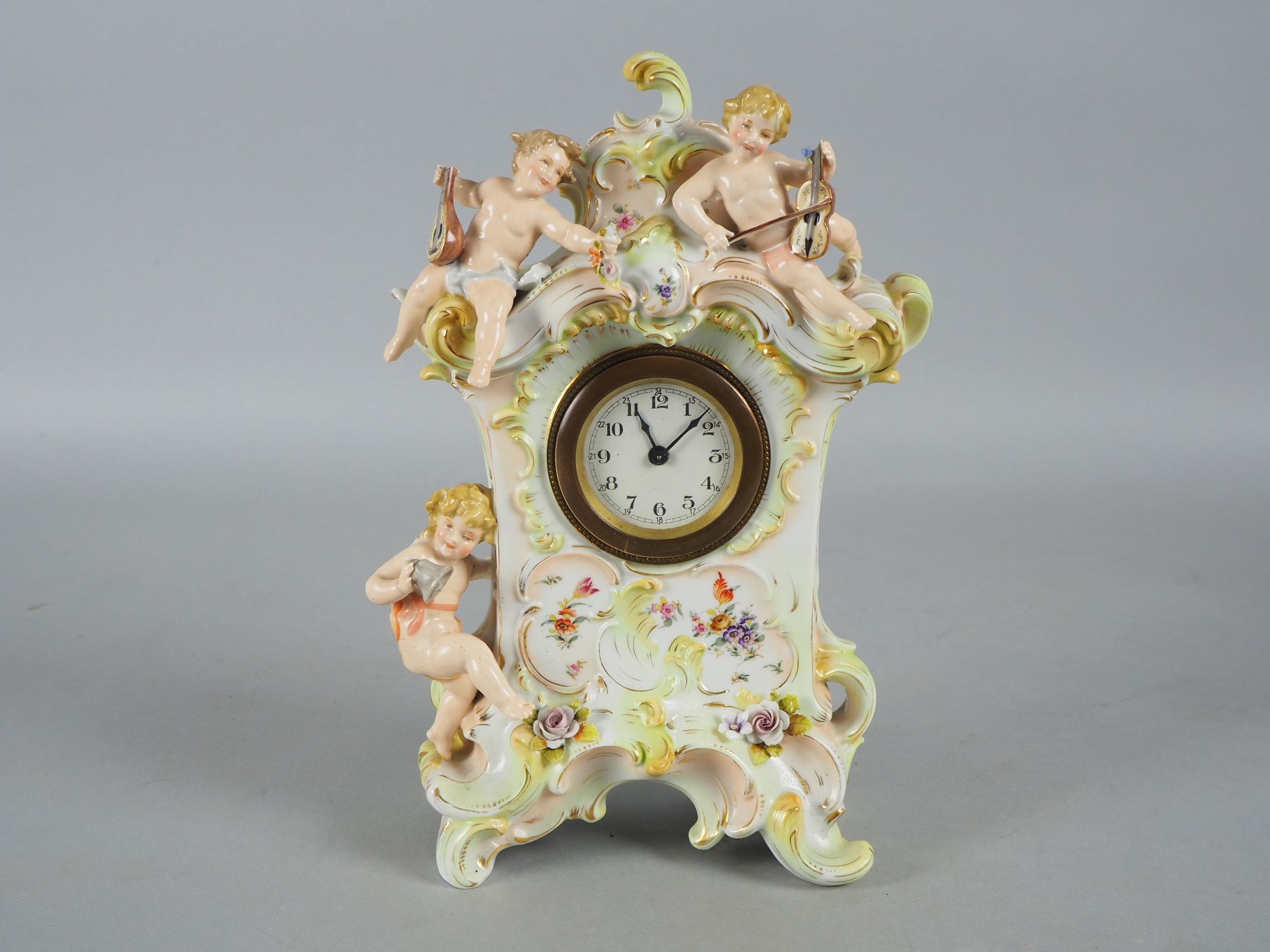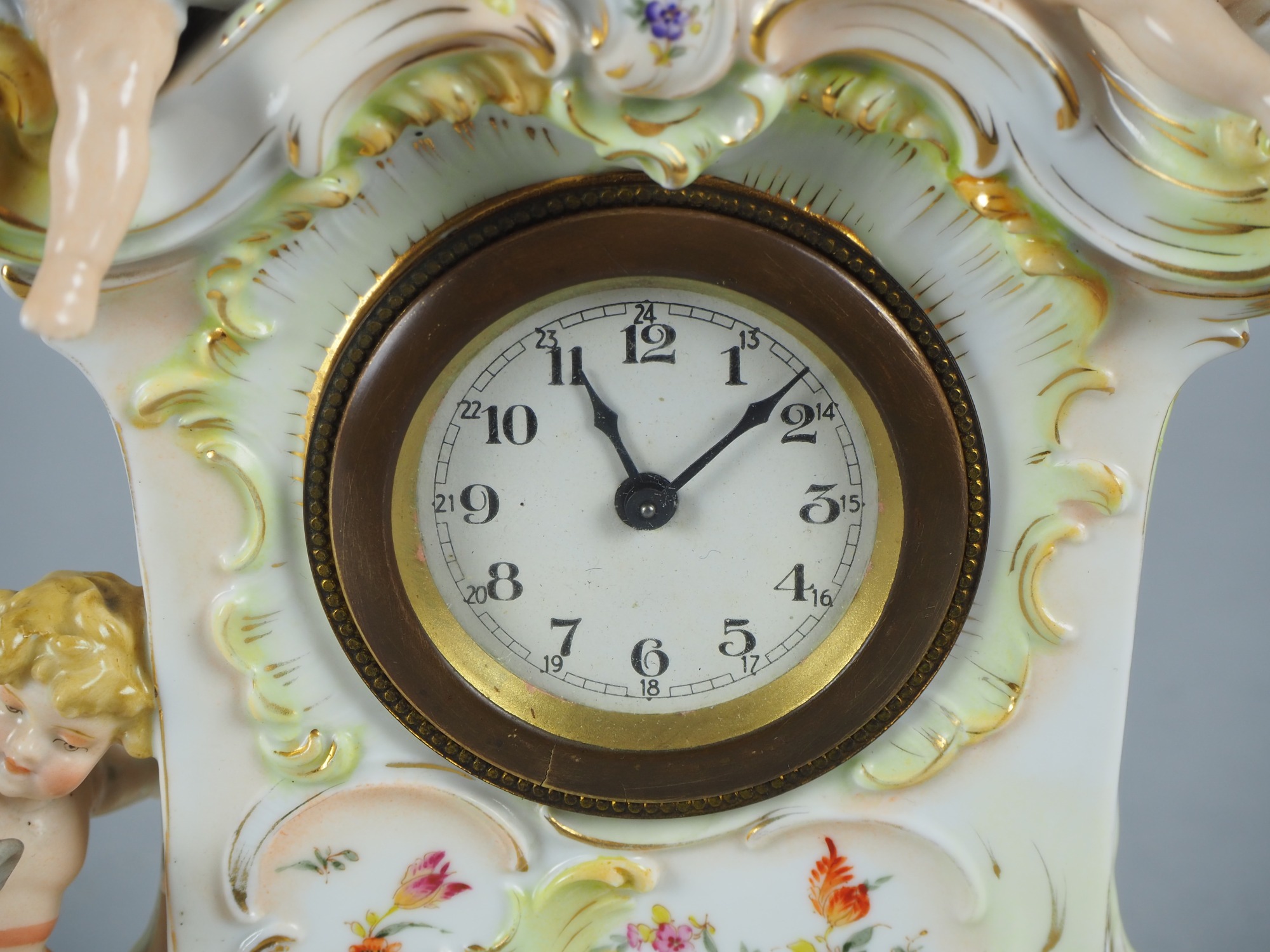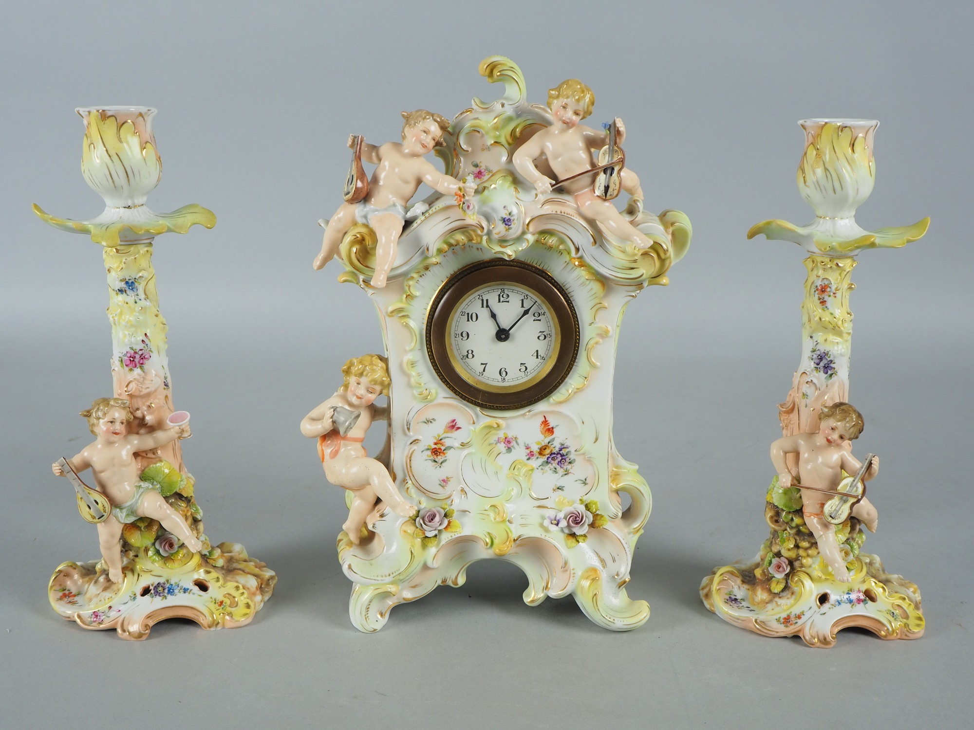Bestehend aus einer Uhr und zwei Leuchtern. Allegorie auf die Musik: Gehäuse und Leuchter aus polychrom (Pastellfarben) handbemaltem Porzellan mit Goldstaffage, sehr fein und detailliert gearbeitet. Uhr: in Rocaillen aufsteigender Korpus, verziert mit vollplastisch ausgeformten musizierenden Amoretten und applizierte Blüten. Leuchter: mit Rocaillensockel, säulenförmiger Schaft, sich nach oben verjüngend, darauf Tülle in Form einer Tulpenblüte, ebenfalls mit Amoretten und Blüten. Mit Messing gerahmtes Emailzifferblatt mit arabischen, schwarzen Ziffern und zwei Zeigern. Einfaches Uhrwerk zum aufziehen. Wohl Heubach um 1900. Guter Erhaltungszustand mit Alters- und Gebrauchsspuren, mehrere Fehlstellen, Uhr funktioniert im Kurzzeittest.
