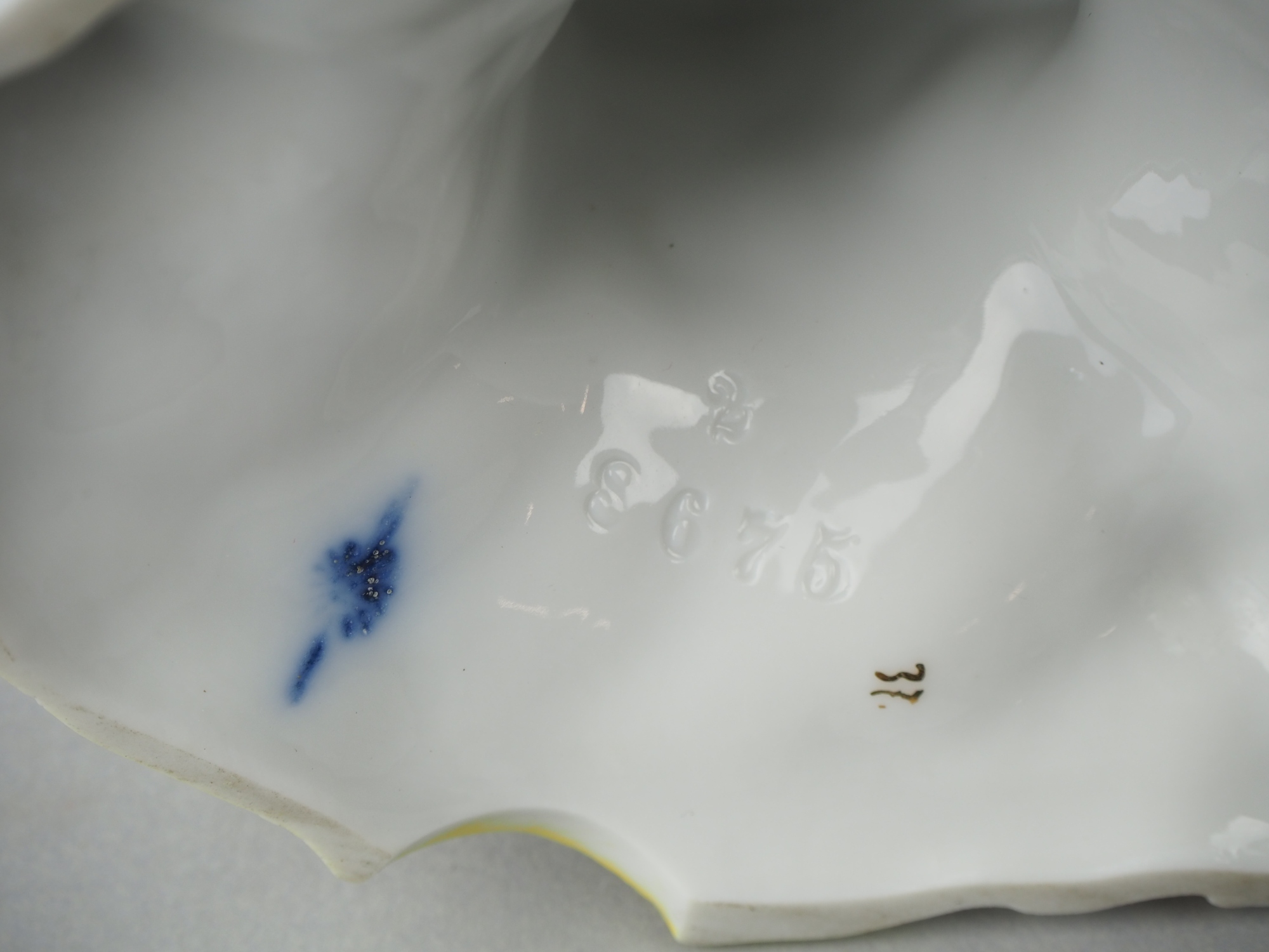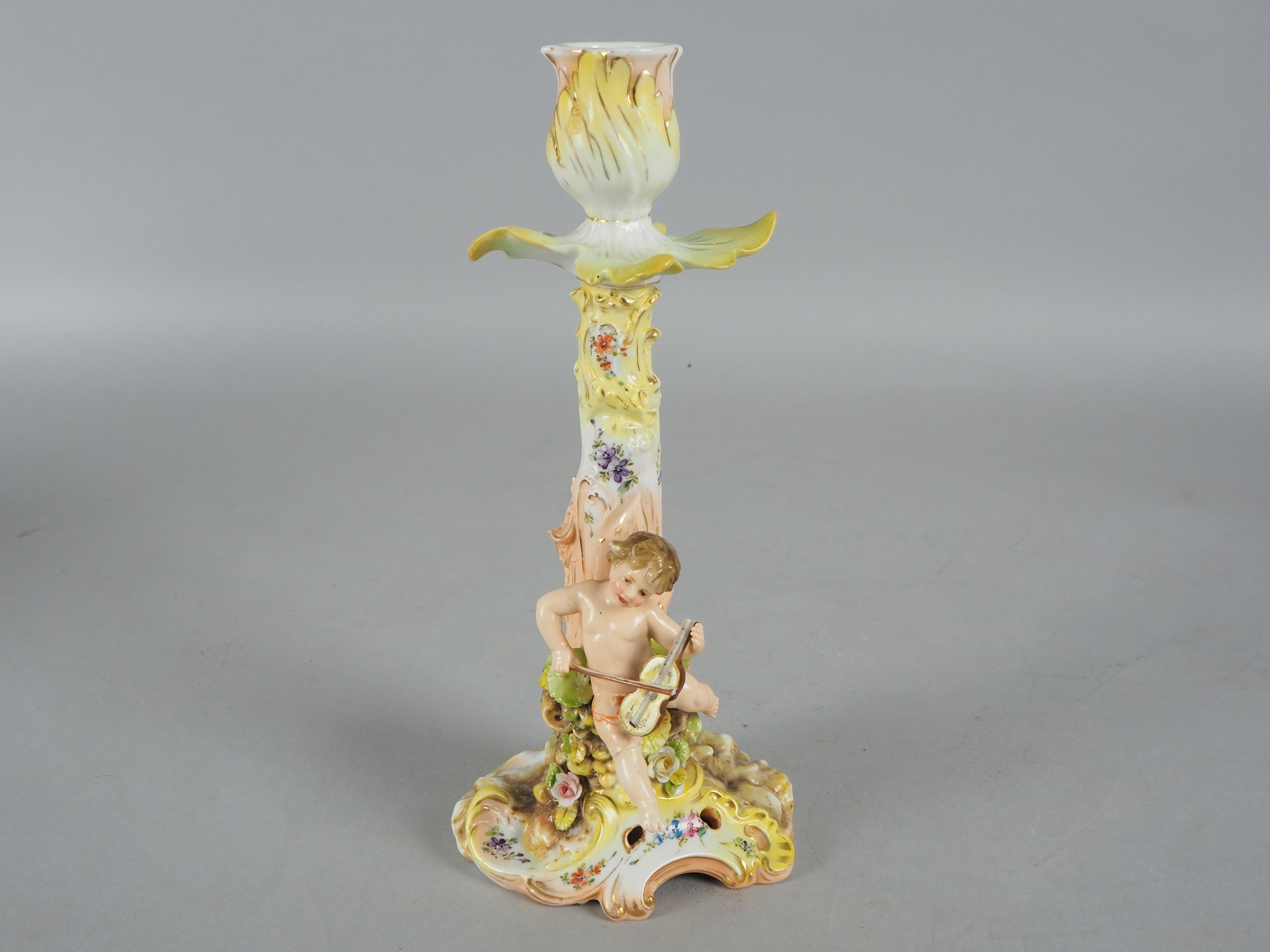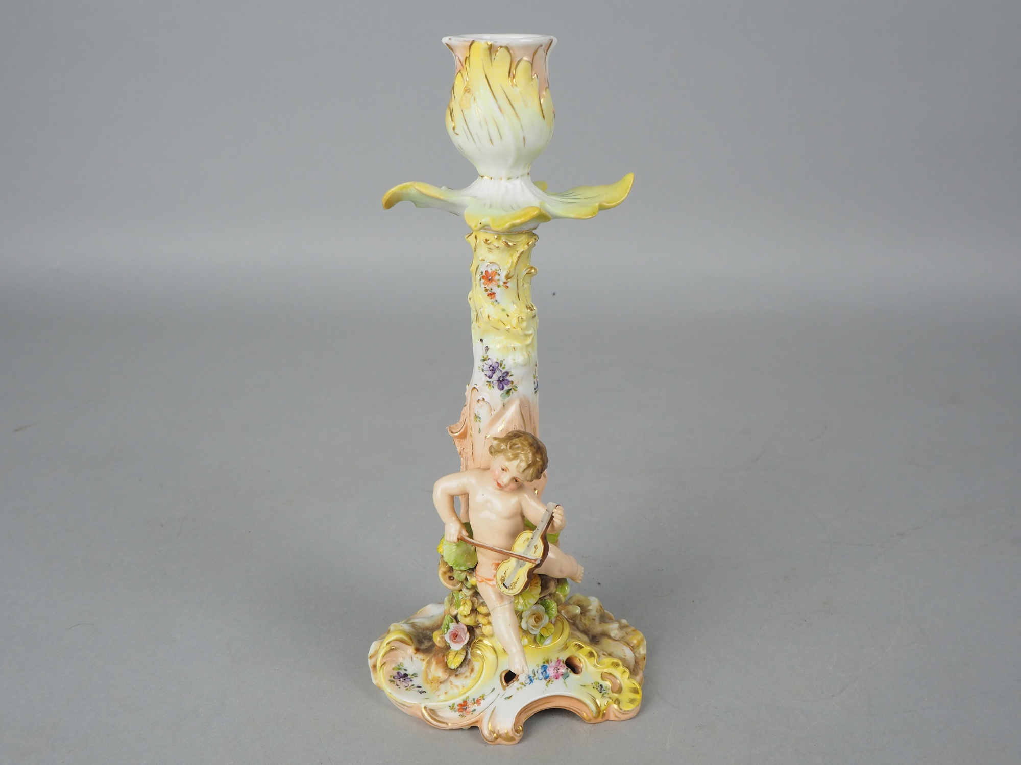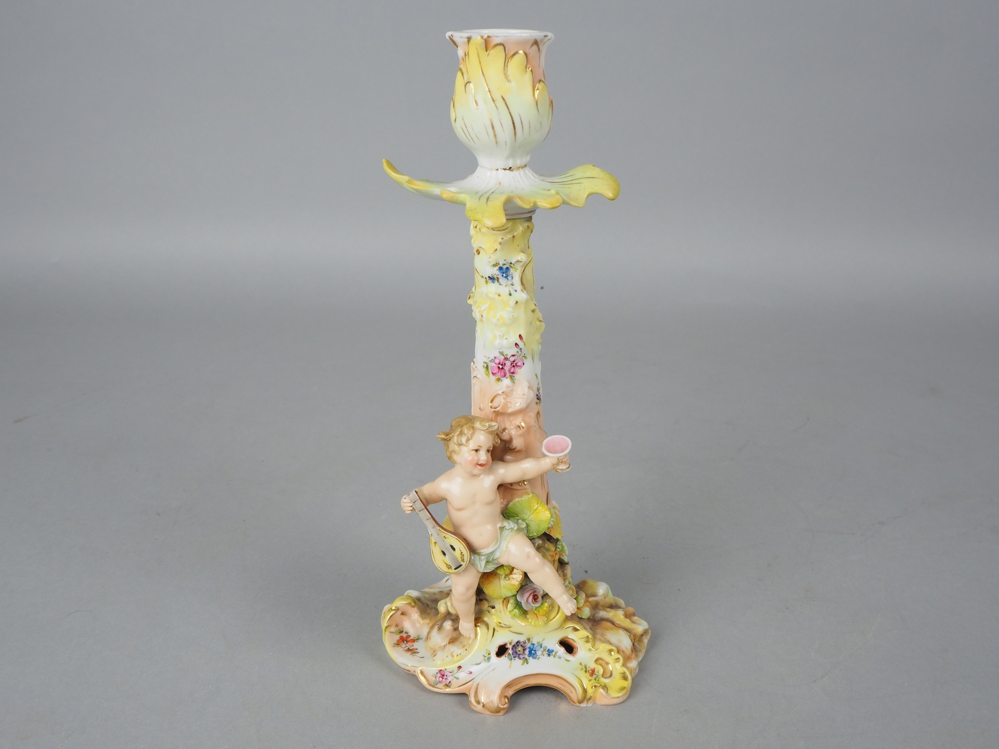 Bestehend aus einer Uhr und zwei Leuchtern. Allegorie auf die Musik: Gehäuse und Leuchter aus polychrom (Pastellfarben) handbemaltem Porzellan mit Goldstaffage, sehr fein und detailliert gearbeitet. Uhr: in Rocaillen aufsteigender Korpus, verziert mit vollplastisch ausgeformten musizierenden Amoretten und applizierte Blüten. Leuchter: mit Rocaillensockel, säulenförmiger Schaft, sich nach oben verjüngend, darauf Tülle in Form einer Tulpenblüte, ebenfalls mit Amoretten und Blüten. Mit Messing gerahmtes Emailzifferblatt mit arabischen, schwarzen Ziffern und zwei Zeigern. Einfaches Uhrwerk zum aufziehen. Wohl Heubach um 1900. Guter Erhaltungszustand mit Alters- und Gebrauchsspuren, mehrere Fehlstellen, Uhr funktioniert im Kurzzeittest.