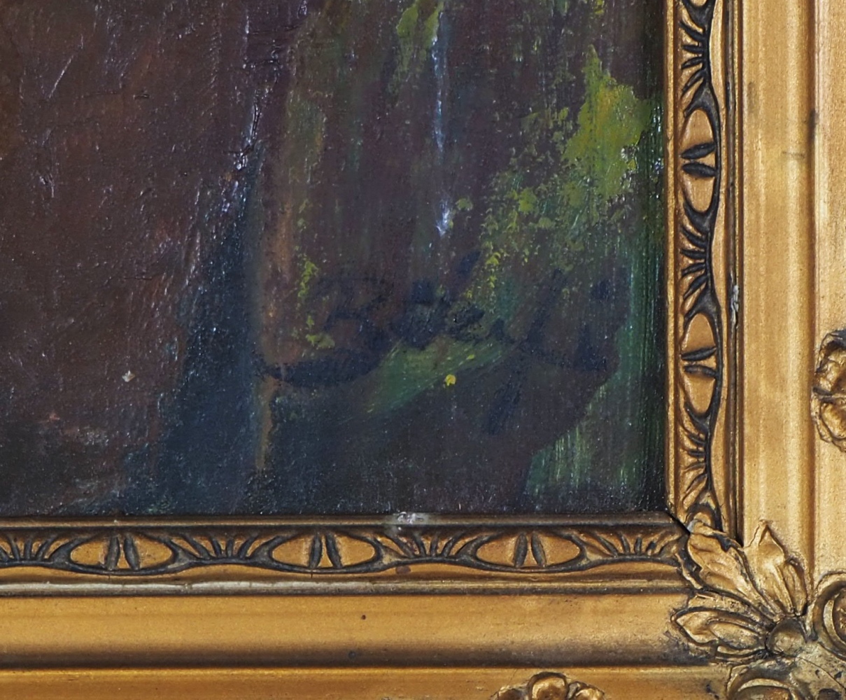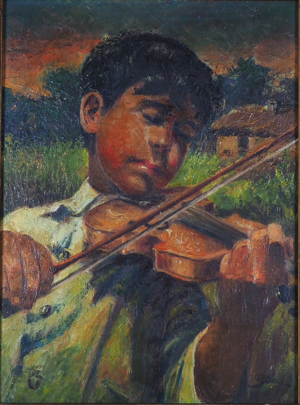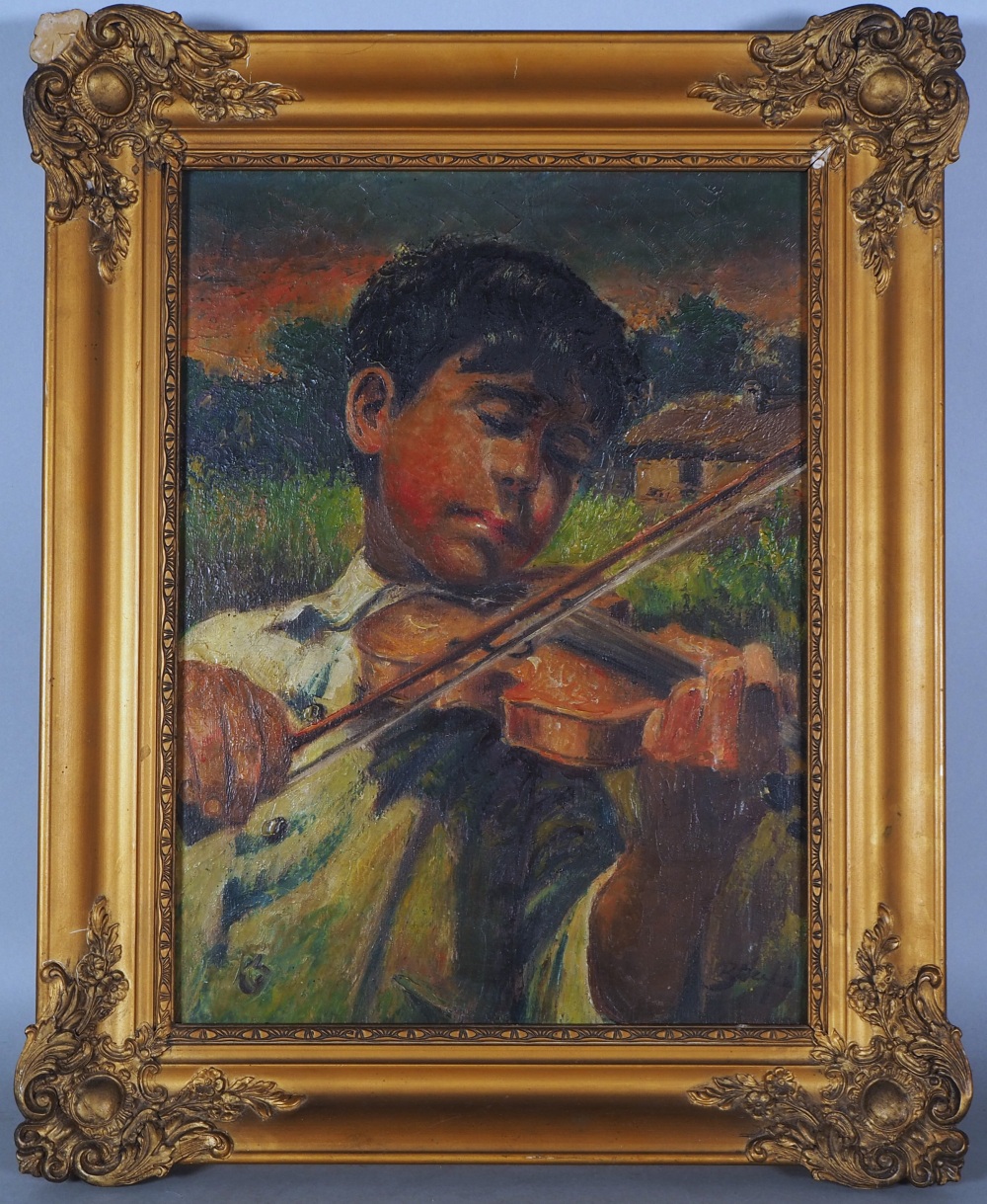 Öl auf Leinwand in einem stuckierten, mit Goldfarbe bemalten Holzrahmen gerahmt. Sehr detaillierte Darstellung eines Jungen mit einem weißen Hemd spielt mit geschlossenen Augen auf einer Geige. Im Hintergrund ist ein Haus und der Himmel in der Morgen- oder Abenddämmerung zu erkennen. Rechts unten signiert: Belzefi? Wohl ungarischer Künstler. Maße: Bild ca. 28,5 x 38,5 cm, Rahmen ca. 41 x 51 cm. Guter Zustand mit Altersspuren, Rahmen bestoßen.
