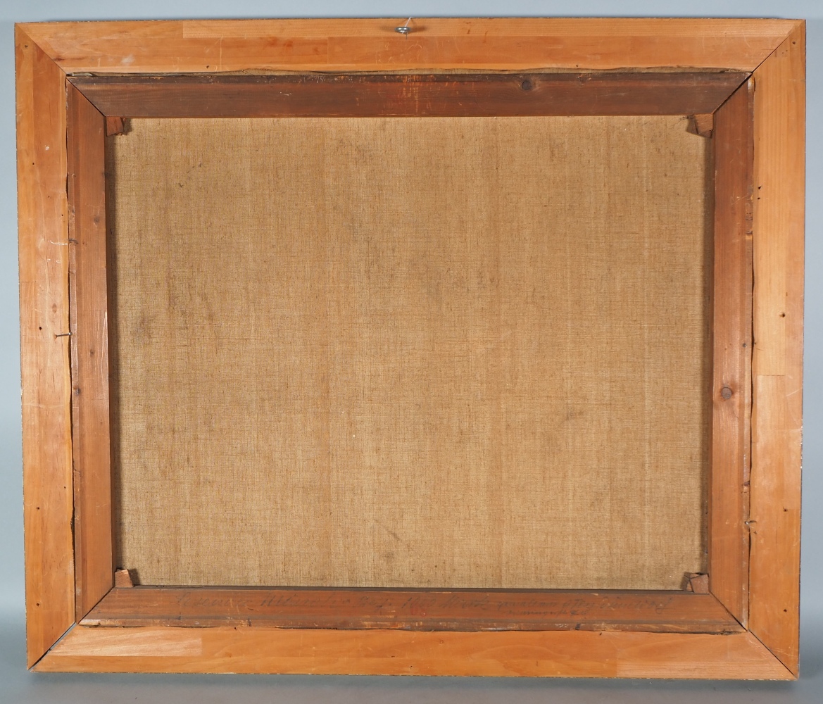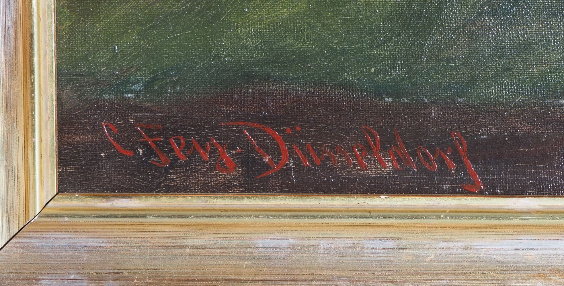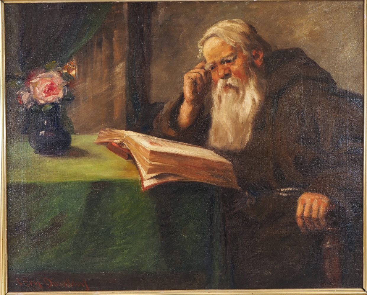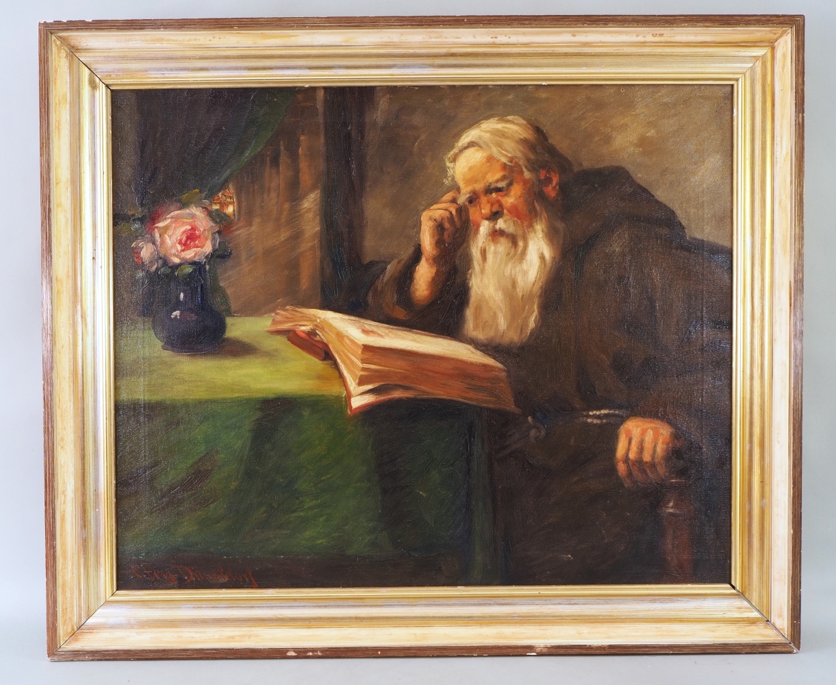Öl auf Leinwand, in einem bemalten Holzrahmen gerahmt. Ein Mönch in Kutte mit einem langen Bart sitzt an einem Tisch mit einer Blumenvase und liest in einem Buch. Unten links signiert: C. Frey, Düsseldorf. Maße mit Rahmen ca. 79 x 94 cm. Guter Erhaltungszustand mit Alters- und Gebrauchsspuren, Leinwand an einer Stelle leicht bestoßen, Rahmen an einer Ecke gelöst. Carl Fey lebte 1867- 1939 in Düsseldorf. Er studierte an der Düsseldorfer Akademie, unternahm Studienreisen nach Holland und malte meist niederrheinische und holländische Fluß-, Kanal-, Küsten-, Heide- und Waldlandschaften sowie Kinder- und Weinkellerszenen in lockerem Duktus und mit meisterhafter Wiedergabe der Licht- bzw. Wetterstimmungen.
