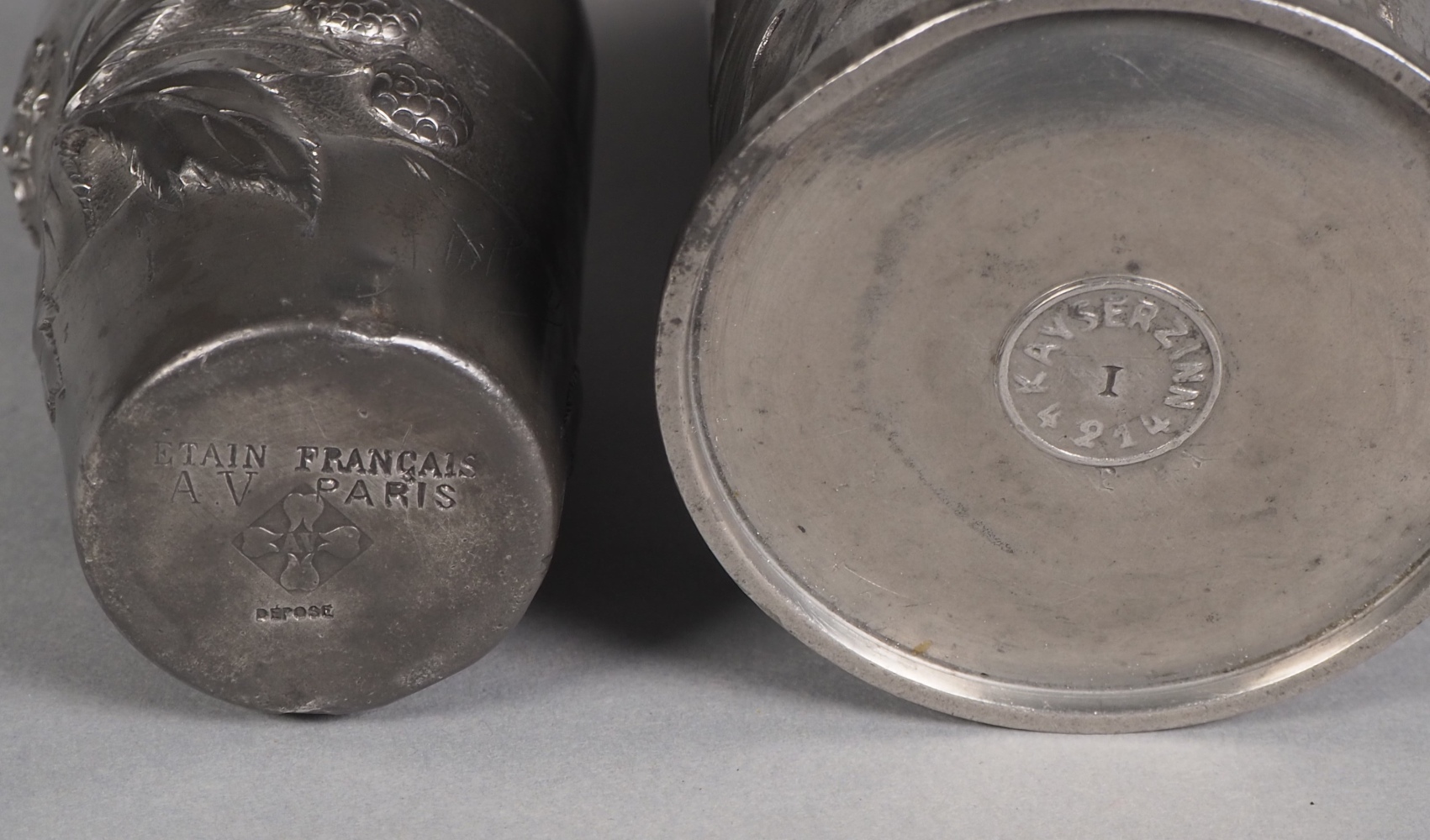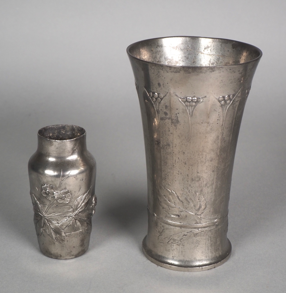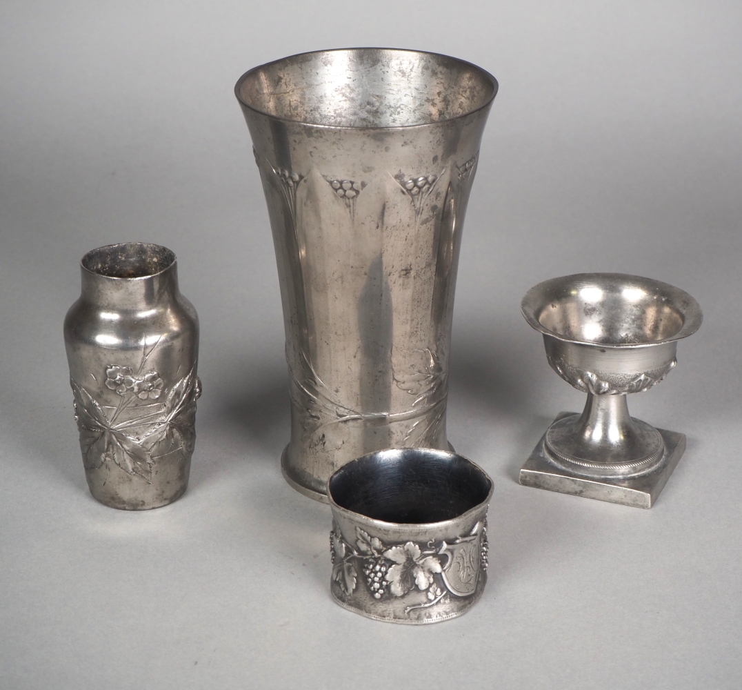 Bestehend aus einem Weinbecher, einem kleinen Kelch, einem Serviettenring und einer kleinen Vase. Alle mit floralen Elementen im Relief verziert. Teilweise mit Herstellerpunzen: „Kayser Zinn“und „Etain Francais“. Höhe Weinbecher ca. 14,5 cm. Guter Erhaltungszustand mit Alters- und Gebrauchsspuren.