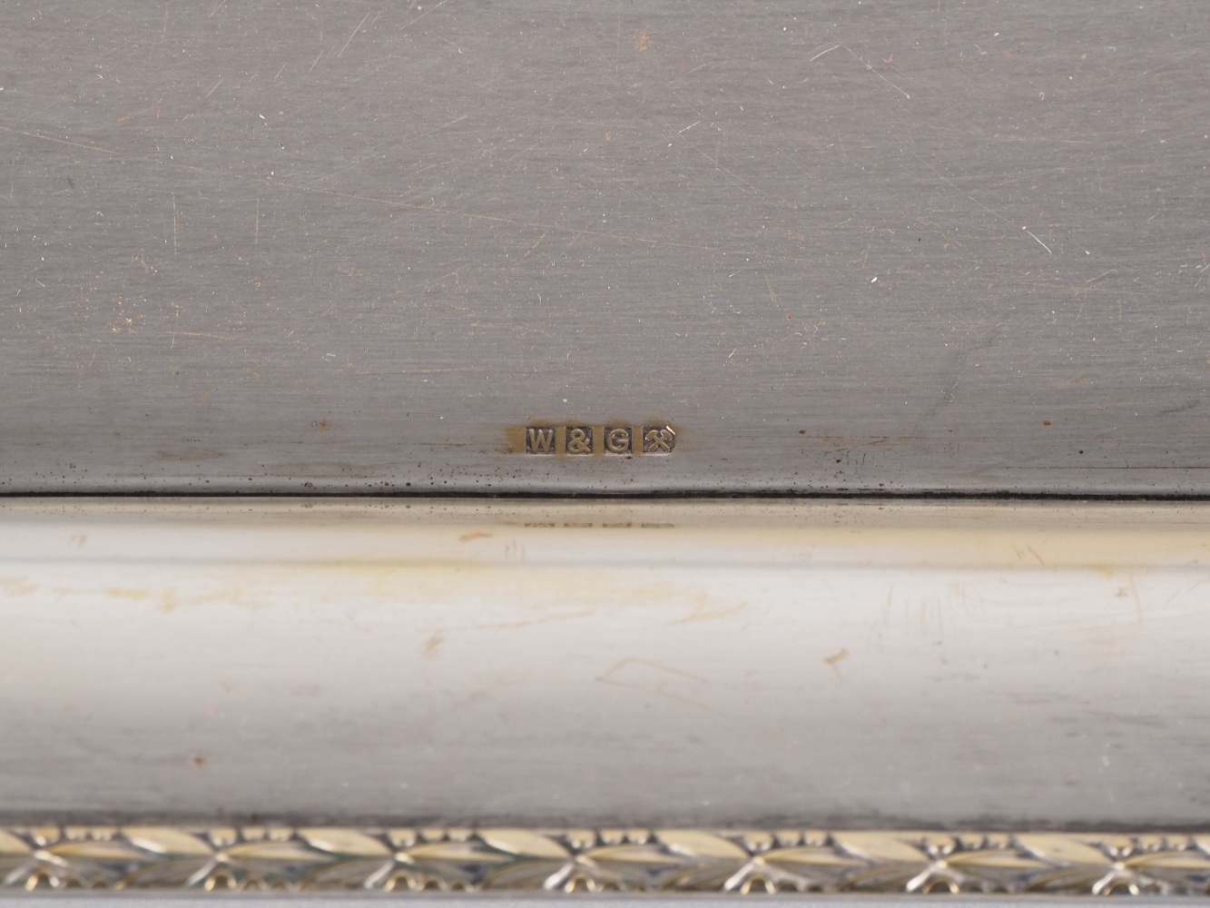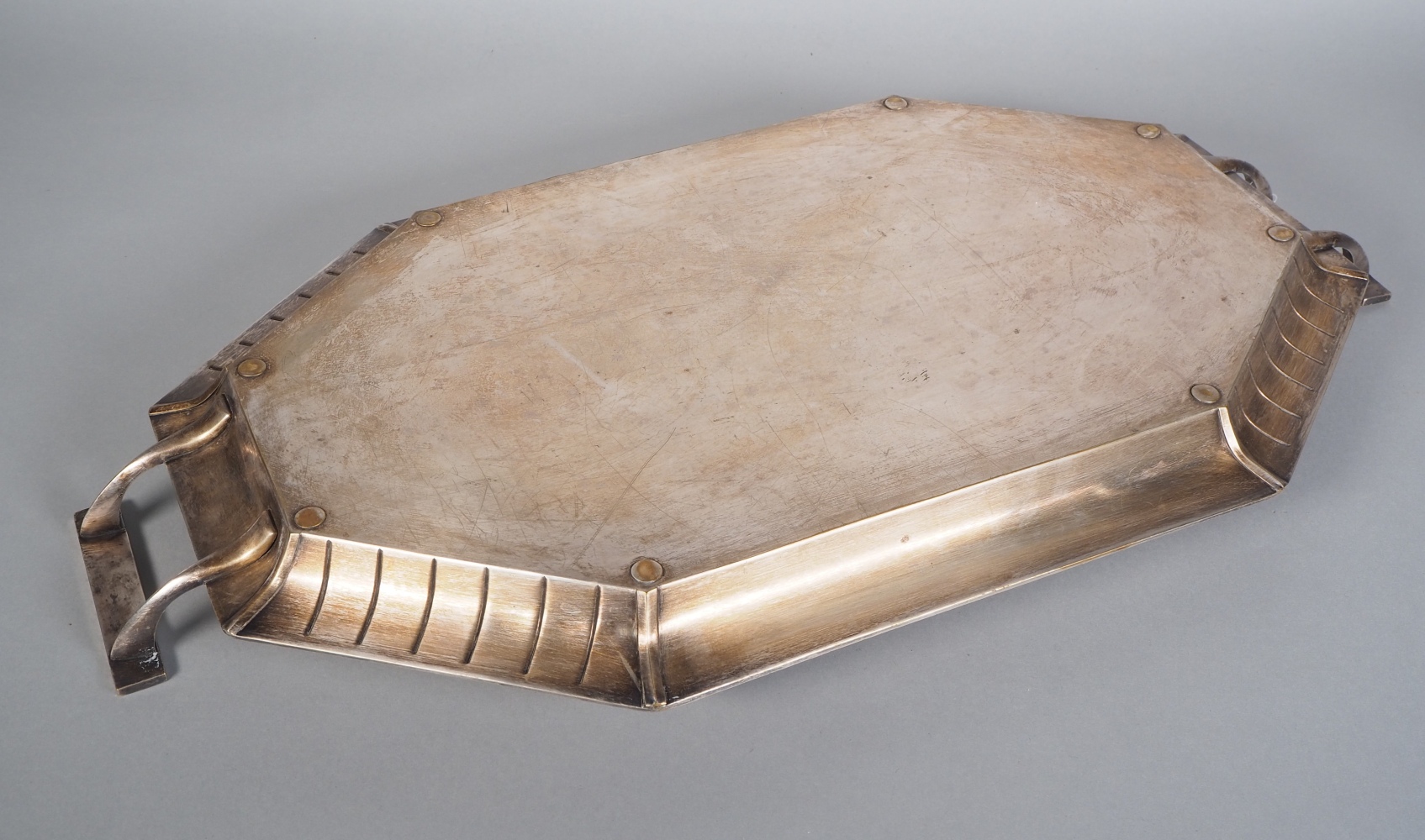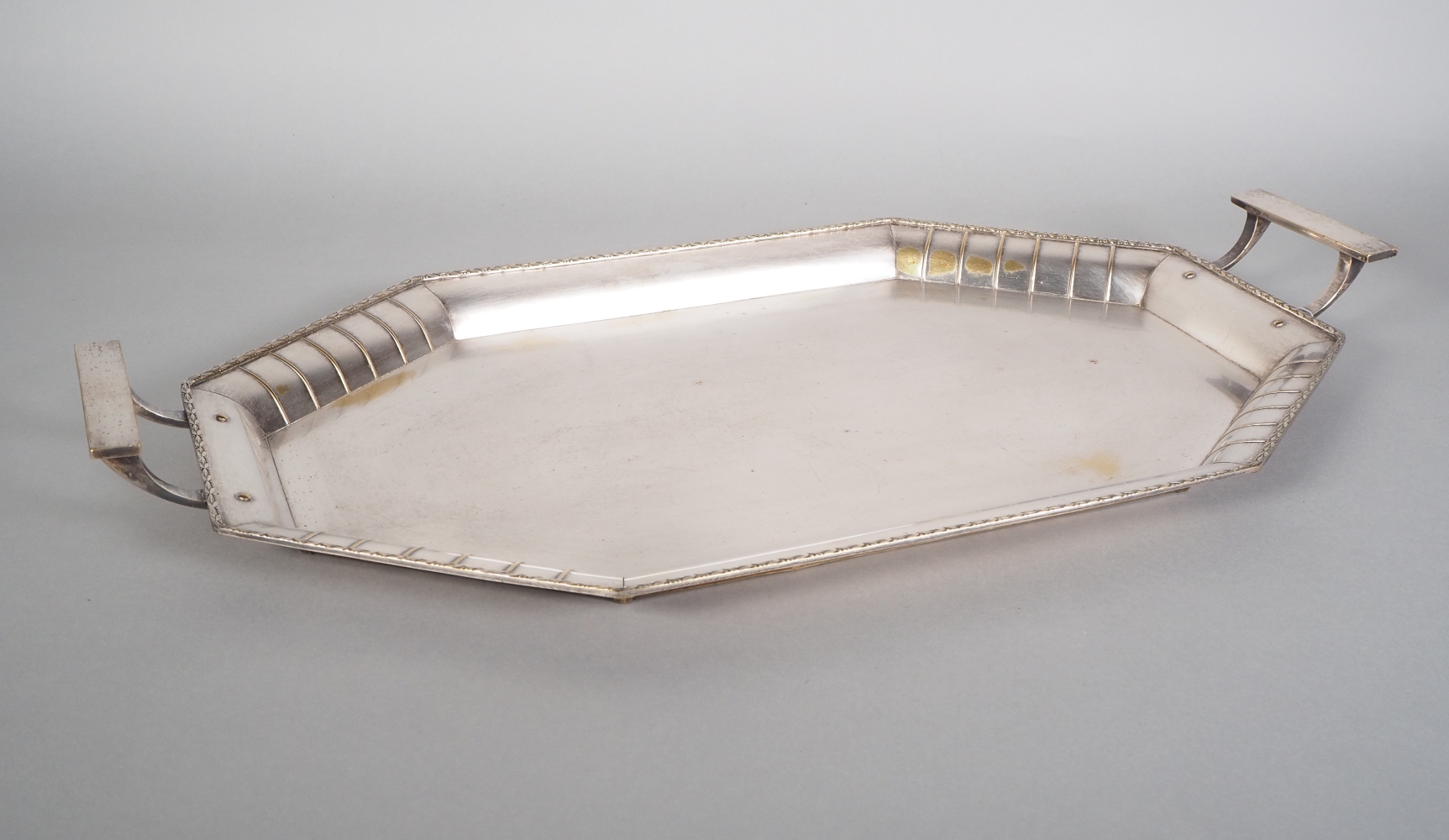 Aus Metall, versilbert. Rechteckige Form mit stark abgeschrägten Ecken, umrundet von halbrund geformter Leiste mit Blattmotiv mit zwei massiven Handhaben. Seitlich Herstellerpunze: W&B. Maße ca. 62 x 35 cm. Guter Erhaltungszustand mit Alters- und Gebrauchsspuren.