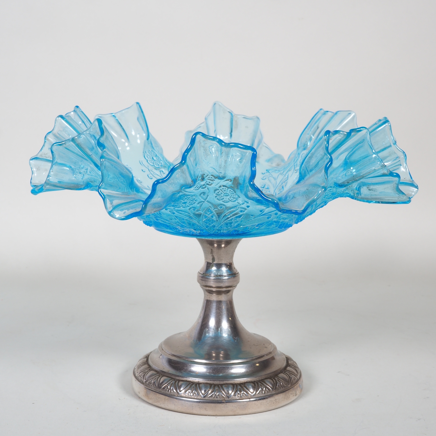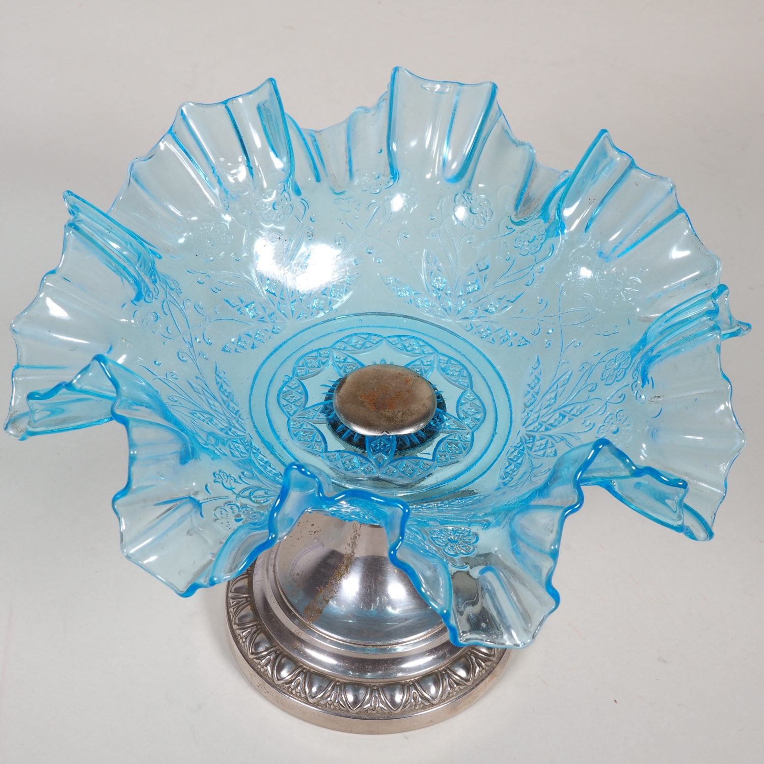 Wohl für Kleinobst gedacht, Schalenfuß aus Metall, mit breitem profiliertem Stand, sich nach oben verjüngend, darauf befestigte Schale aus Glaß, bläulich eingefärbt, stark gewellter Rand mit leicht im Relief floralem Zierrat, wenige Altersspuren am Fuß, Glaß intakt. H. 18cm, Durchmesser 23,5cm.