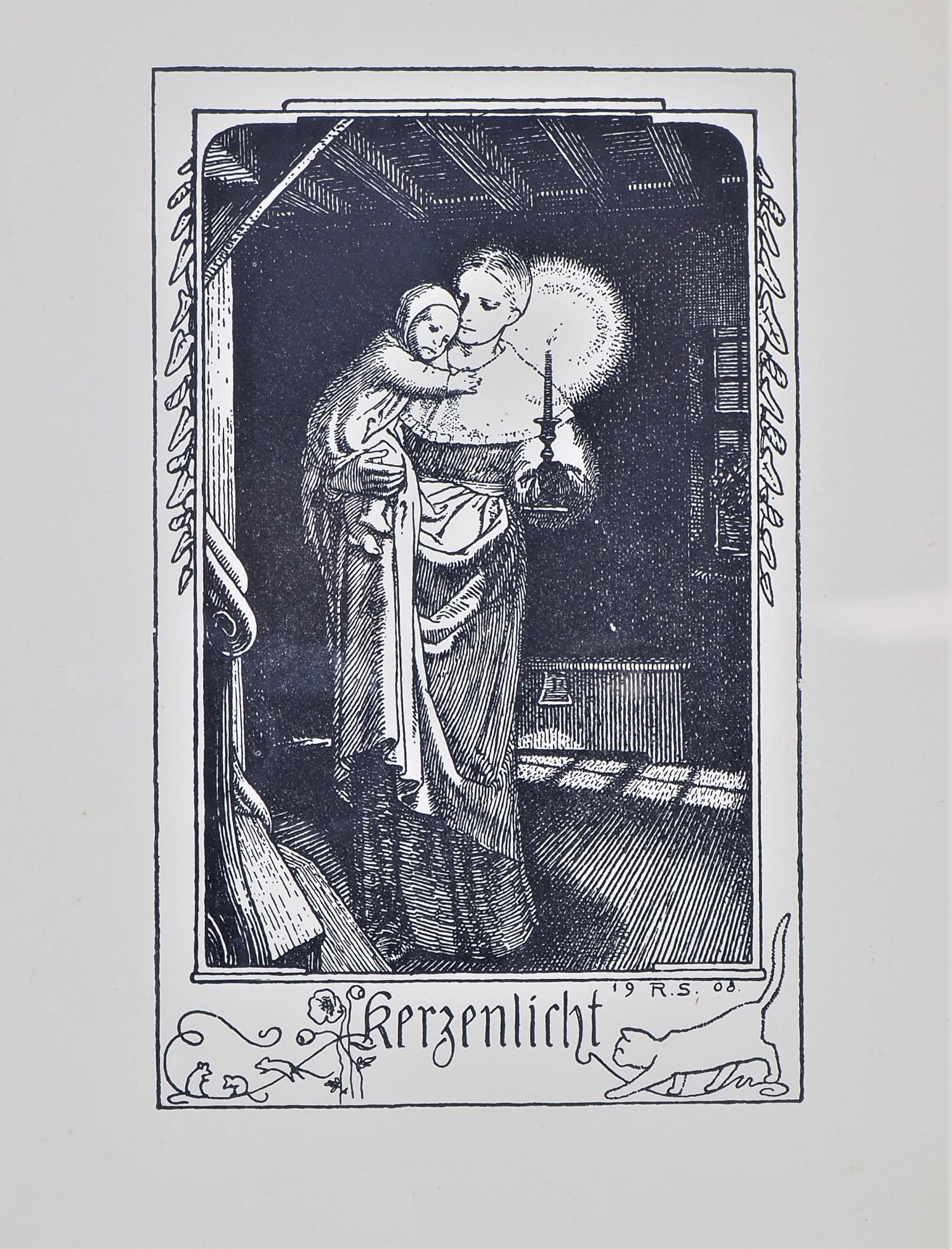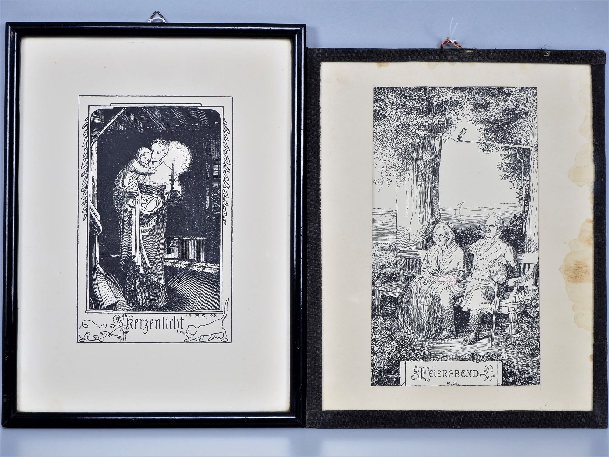 Auf Papier. Beide monogrammiert R.S. Einmal „Feierabend“, Darstellung eines älteren Paares auf einer Parkbank. Einmal „Kerzenlicht“, Mutter mit Kind, datiert 1908. Je gerahmt unter Glas. Rückseitig mit Biographie des Künstlers. Wasserschaden am Passepartout, etwas vergilbt, sonst gut. Gesamtmaße H. bis 31cm, B. 24cm.