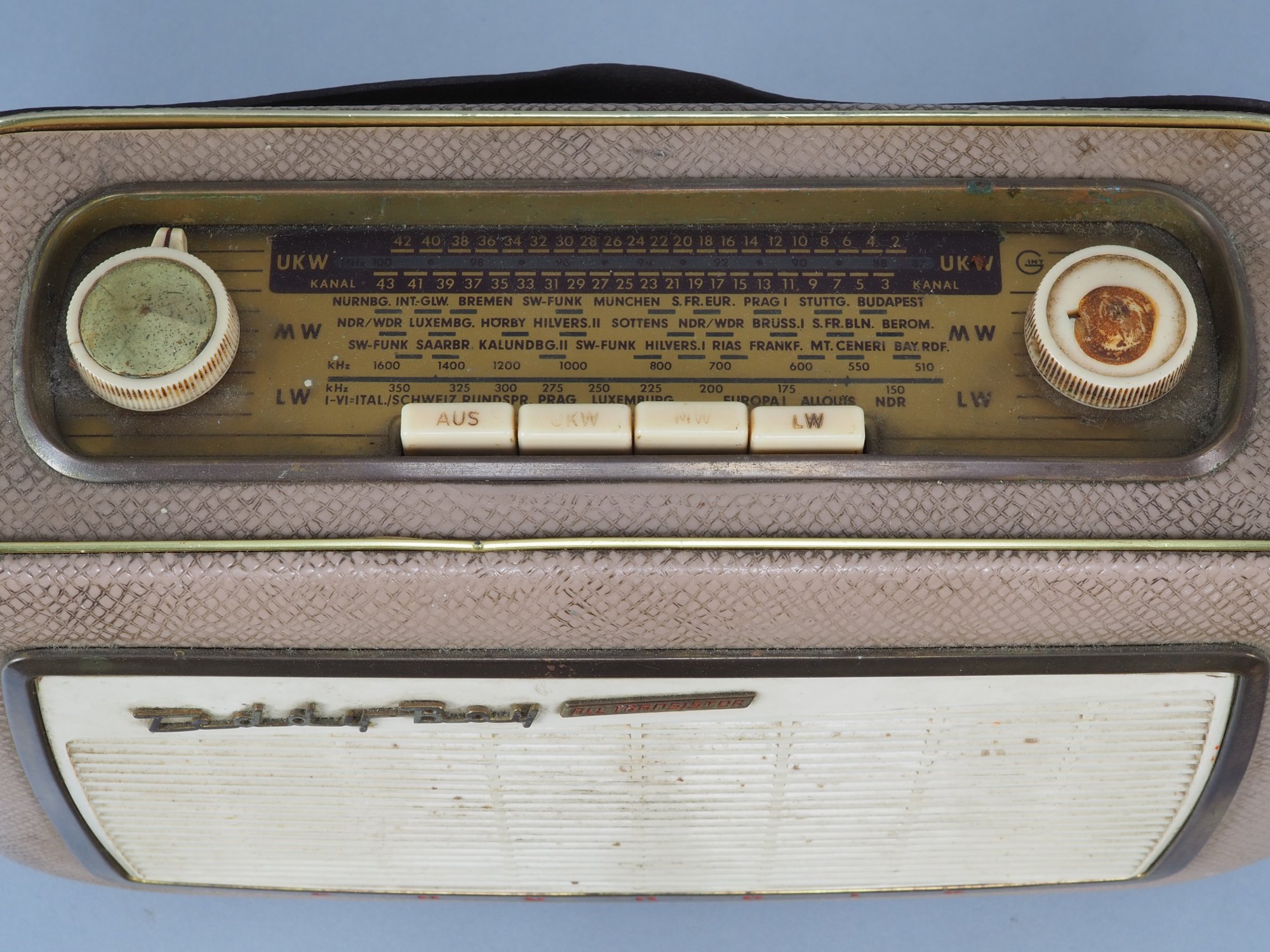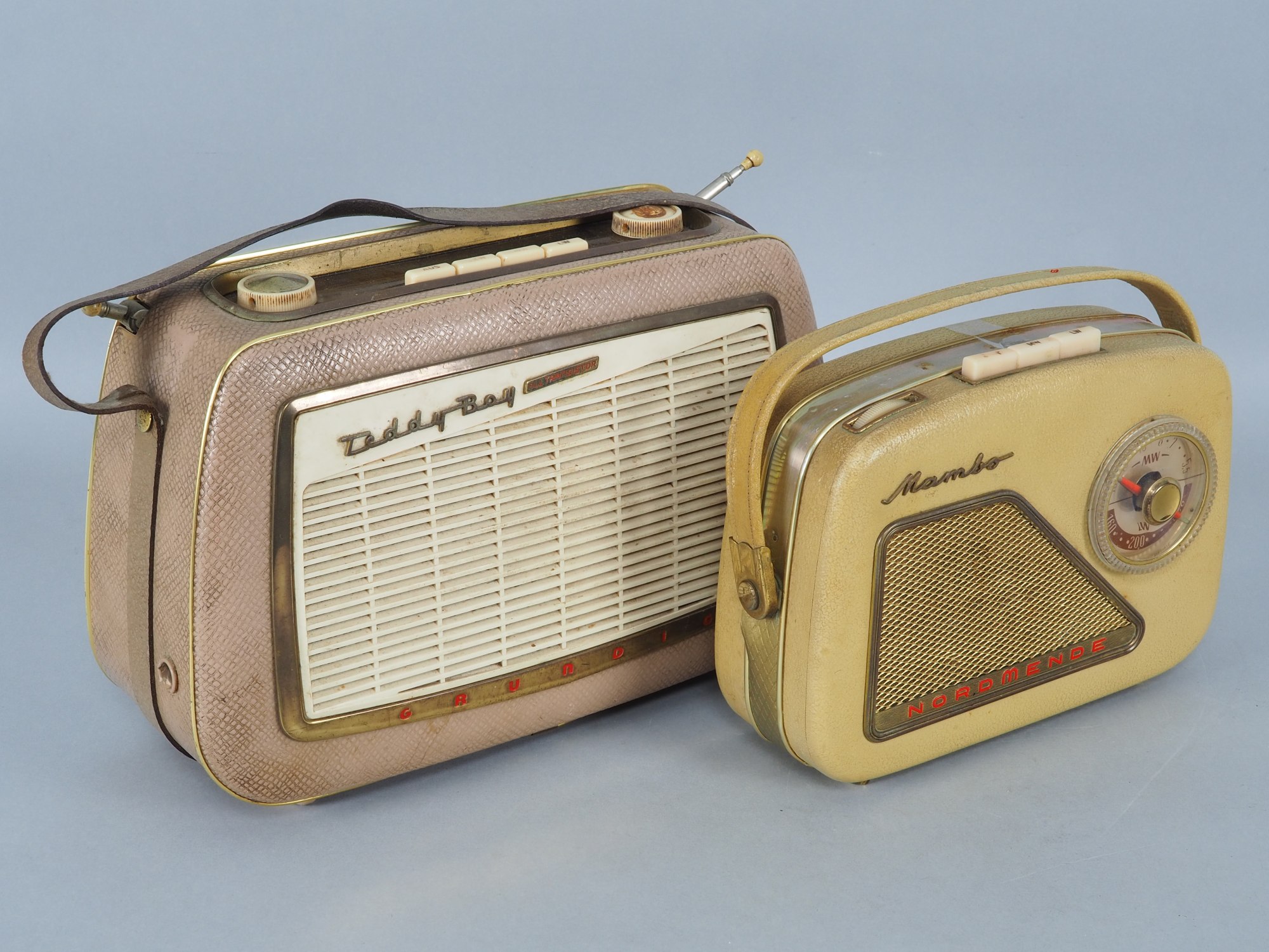 einmal „Nordmende Mambo 59“ in beigefarbener Lederoptik, Schraube für Rückdeckel fehlt, sonst wohl komplett, H. 18cm, B. 22,5cm, T. 8cm. Einmal „Grundig Teddy Boy“ in Lederoptik mit weißer, gerippter Front, schräg außen zwei Antennen, gebraucht, etwas Schmutz. H. 21cm, B. 30cm, T. 12cm.