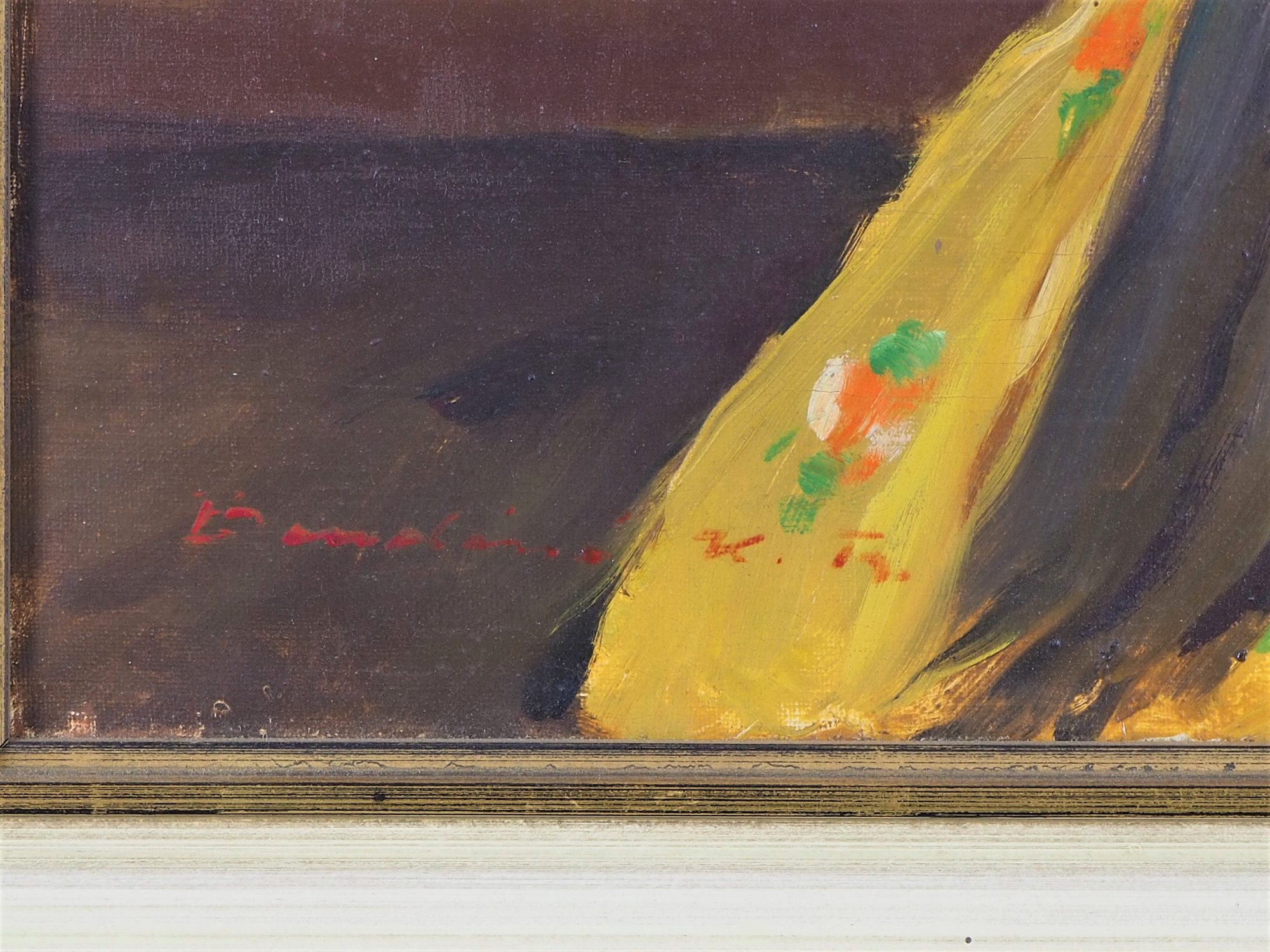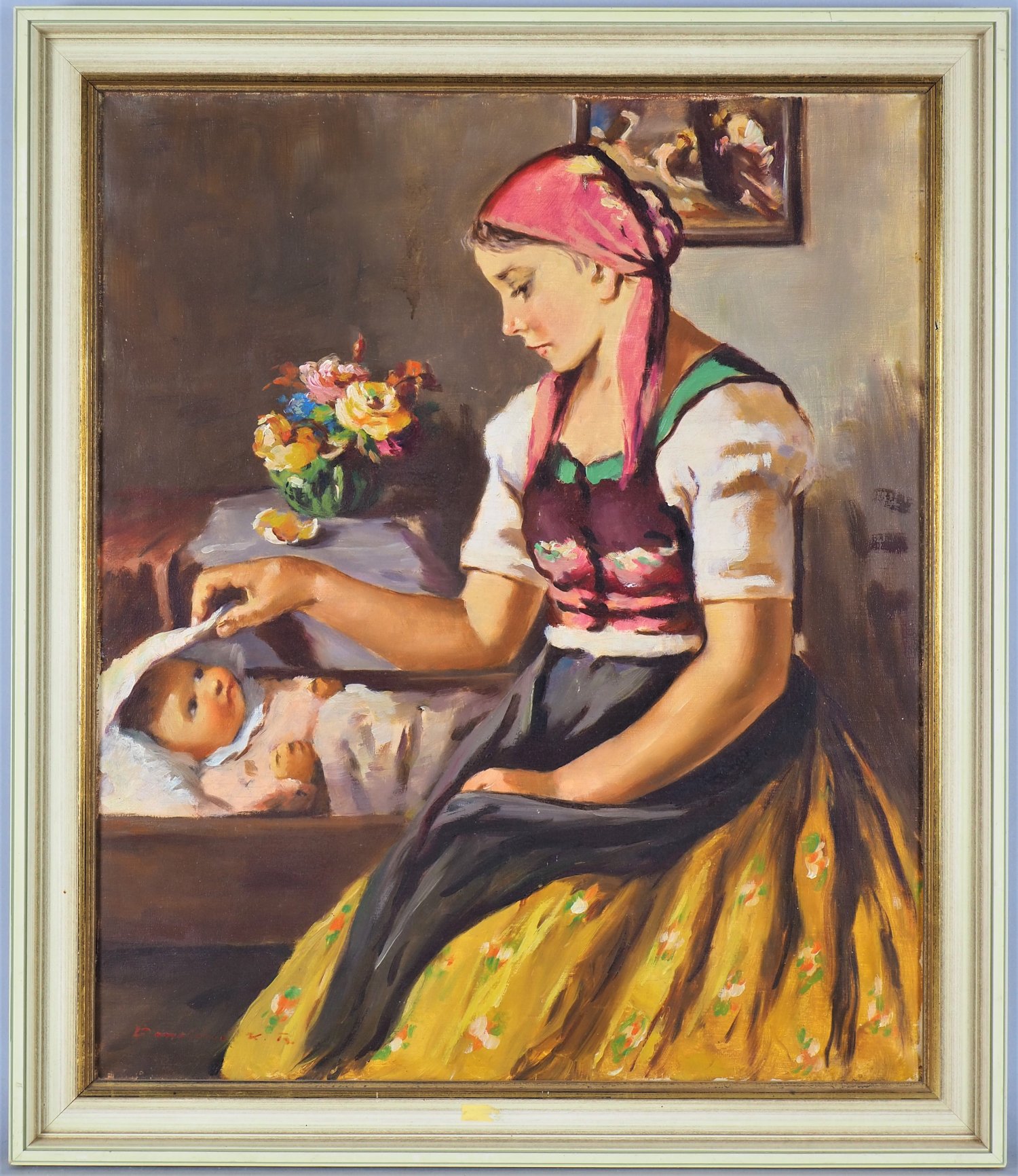 Öl auf Leinwand. Farbenfrohes Porträt einer Mutter in ungarischer Kleidung, ihr Kind in der Wiege zudeckend. Unten links unleserlich signiert. 20. Jh. Gerahmt. Gesamtmaße H. 70cm, B. 60cm.