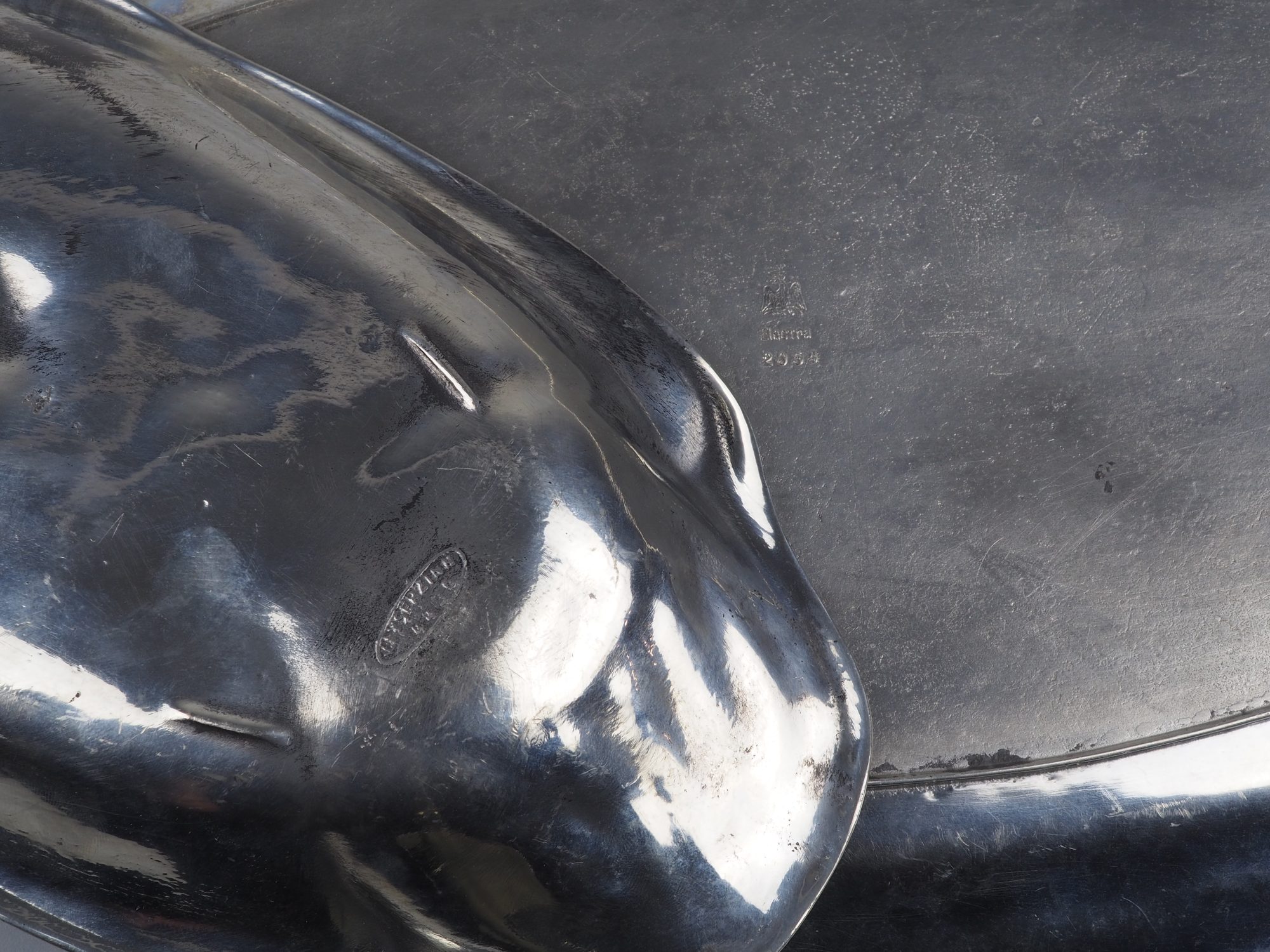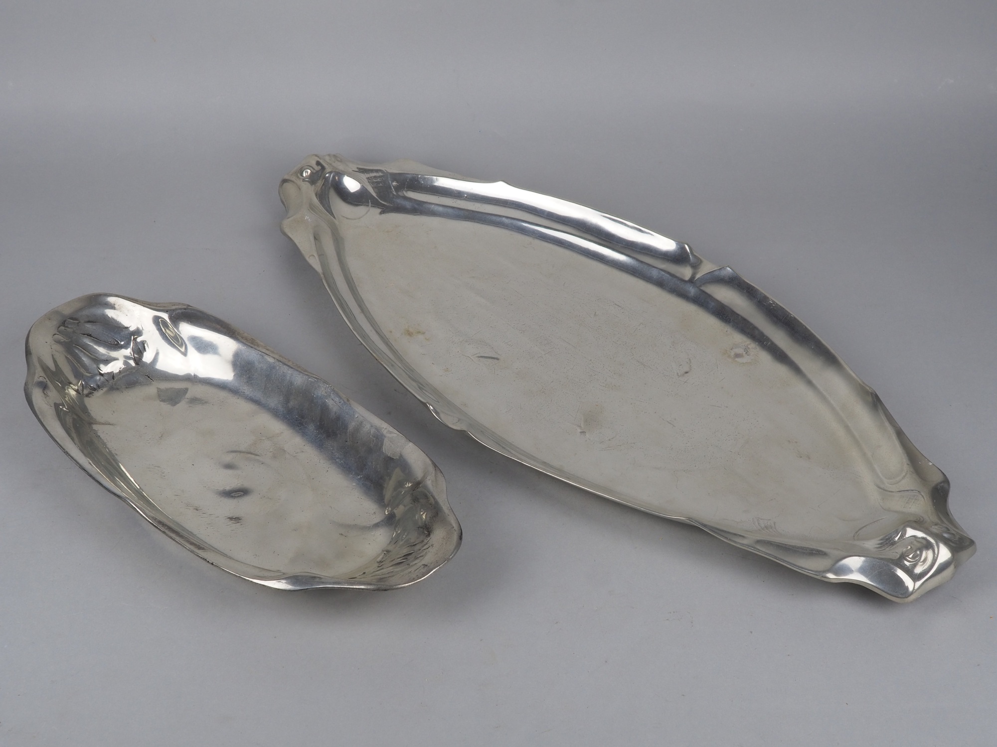 Beide aus Metall versilbert, großes Tablett am Boden mit leicht sichtbaren Fischmotiven, ovale Form, Handhaben in Form von einem Gesicht mit offenem Mund und langen Haaren, zum Servieren von Fisch, guter Zustand, am Boden Herstellermarke „Elektra mit Adler“ Modell Nr. 2054. L. 58cm, T. 25cm, dazu eine ovale Schale für Meeresfrüchte, auch mit Art Déco Muster, guter Zustand, am Boden gemarktet „Kaiserzinn“, um 1920. L. 35cm