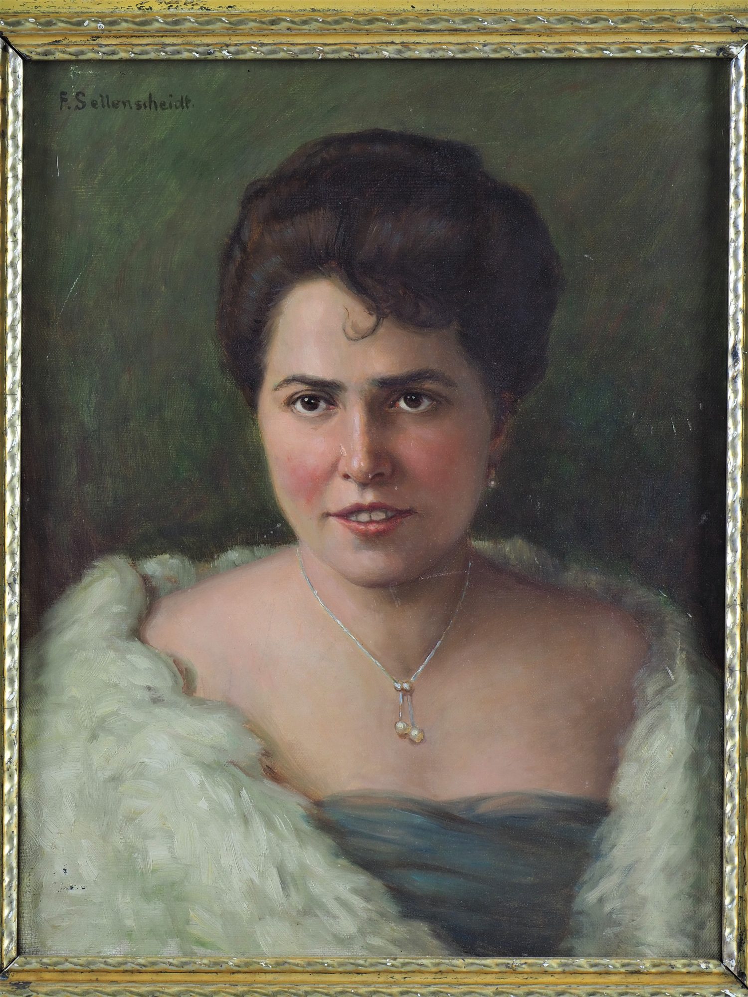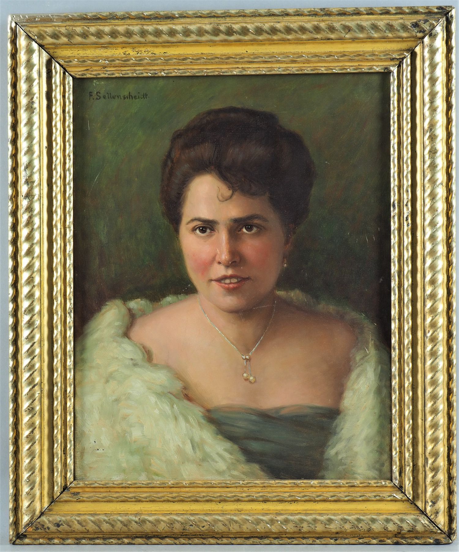Öl auf Leinwand, sehr fein gemaltes Brustportrait einer jungen Frau im Pelzumhang und hochgestecktem Haar, auf dunklem Hintergrund. Oben links signiert, wenig Altersspuren, gerahmt. H. 58,5cm, B. 49cm