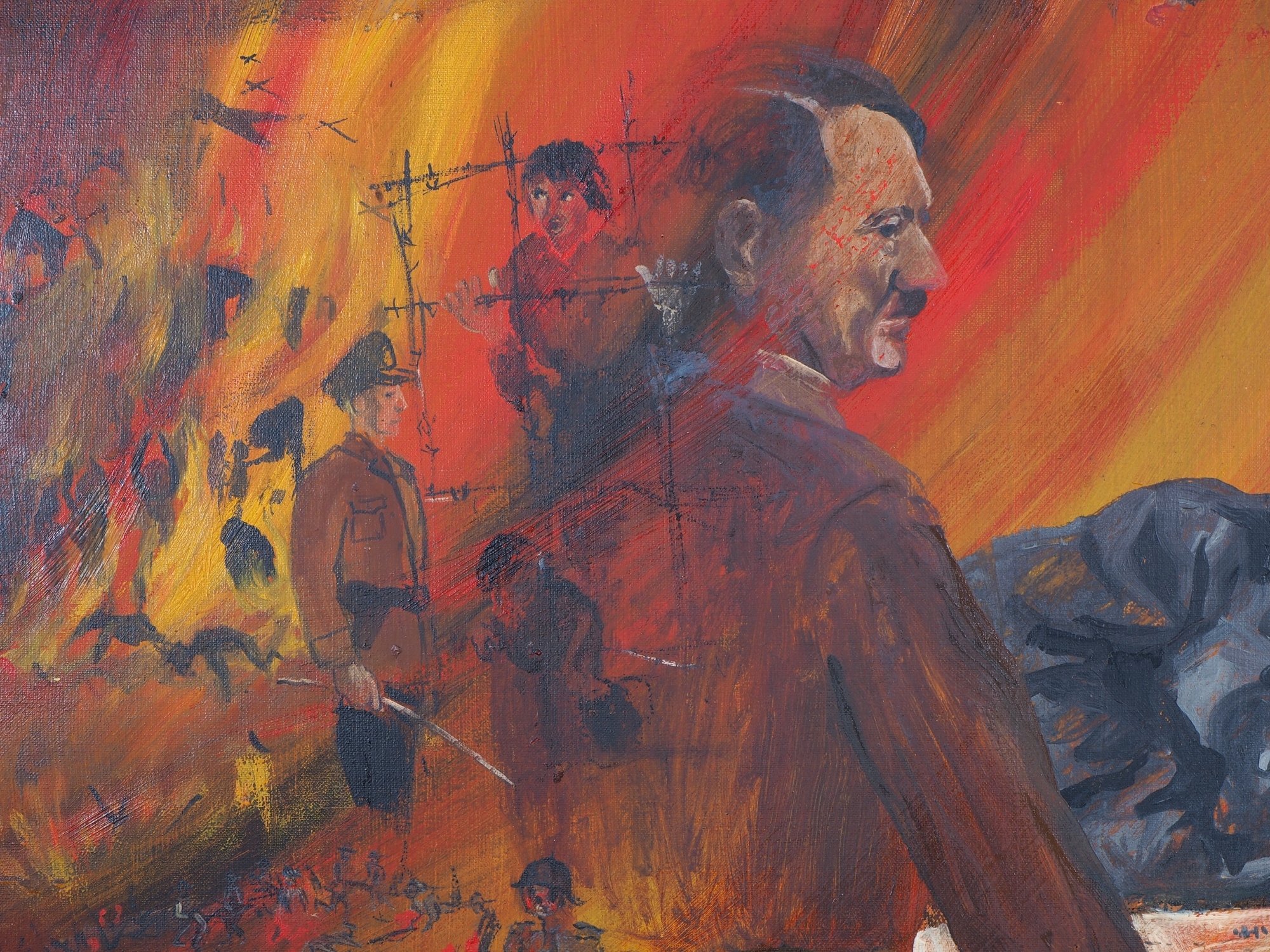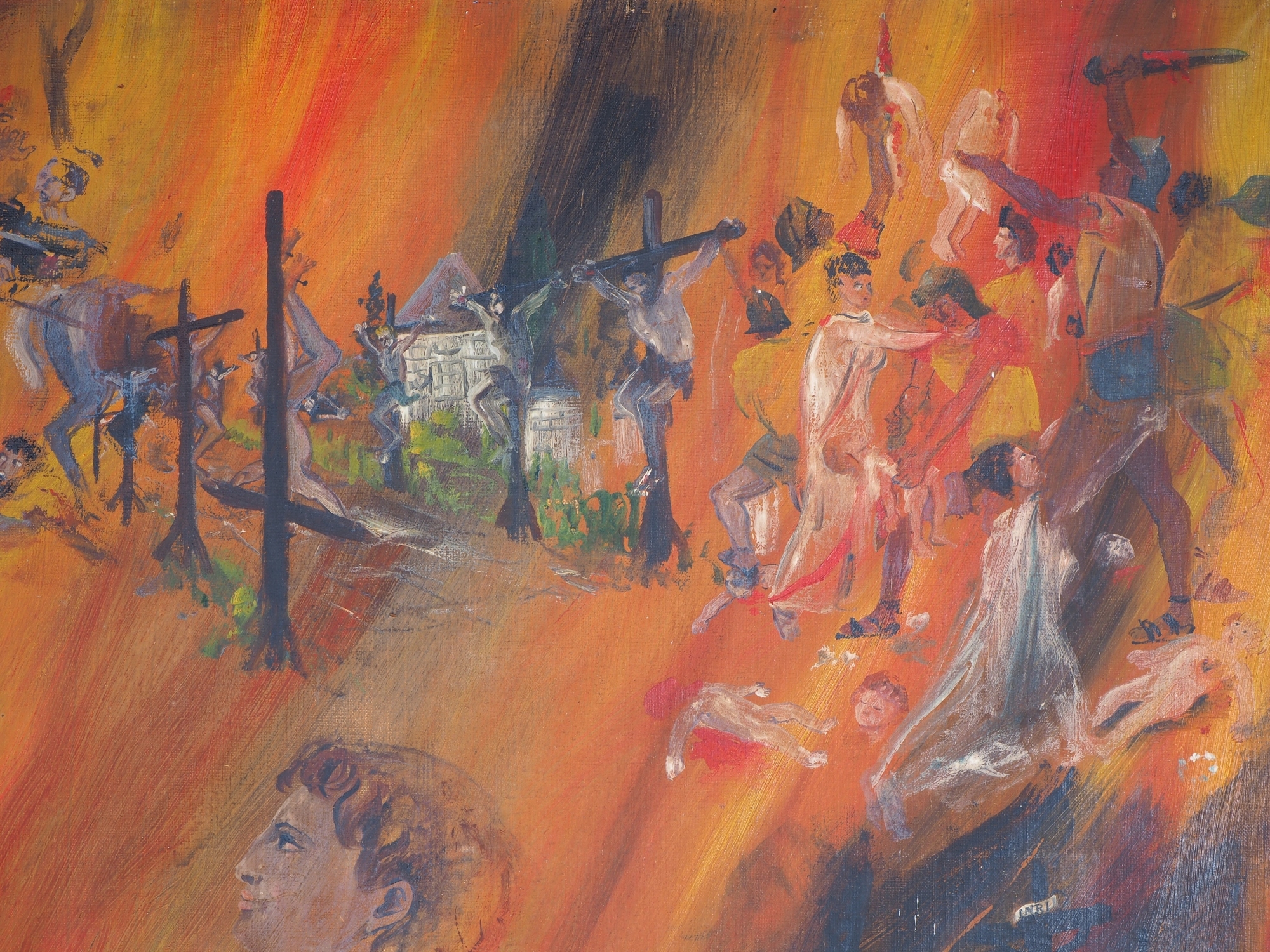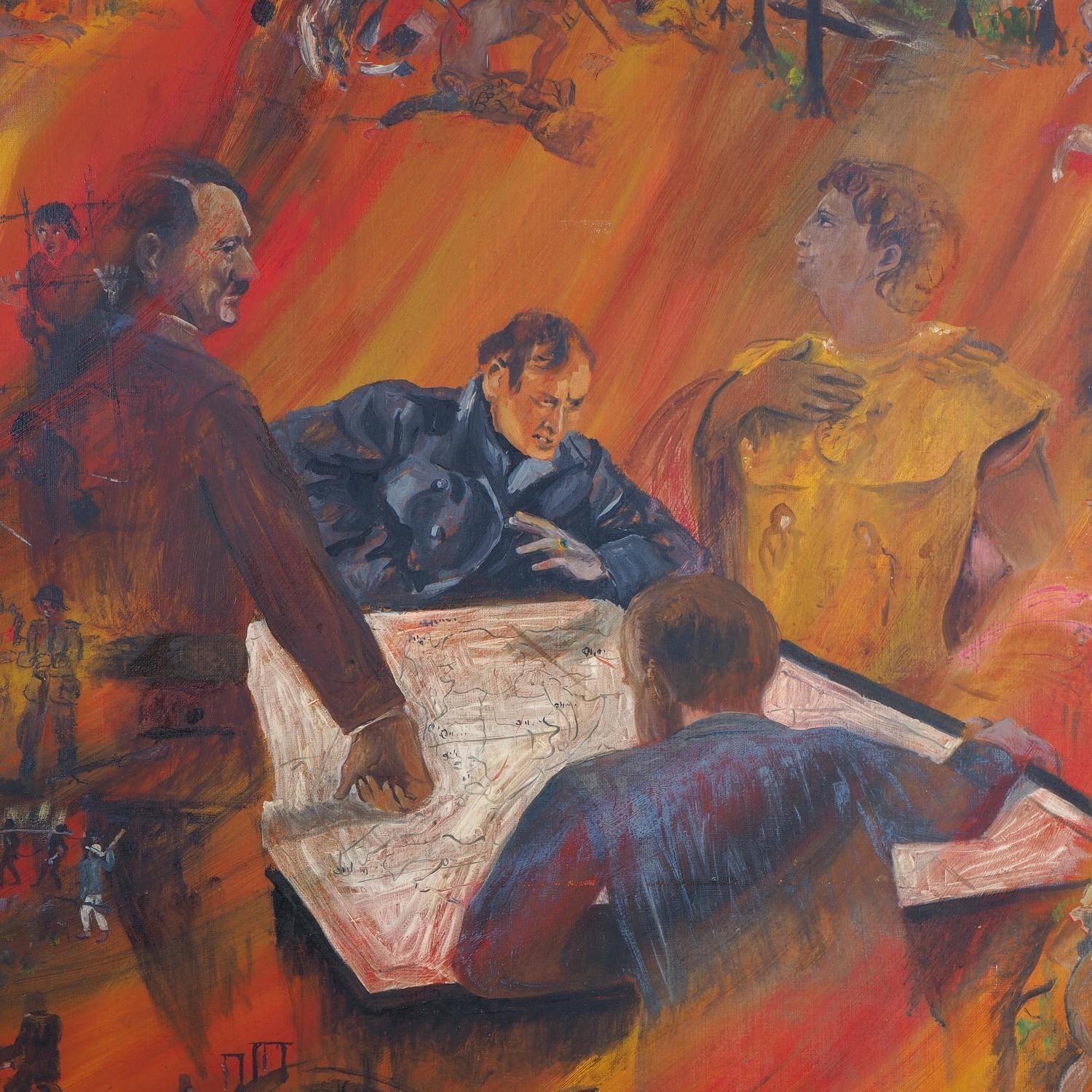 Das großformatige Gemälde aus dem Jahr 1954 zeigt ein dramatisch inszeniertes Tableau von Gewalt, Macht und Zerstörung. Im Zentrum des Bildes stehen historische Figuren wie Adolf Hitler und der röm. Kaiser Augustus mit Napoleon und einer weiteren Personen an einem Kartentisch, was auf militärische Planung und Machtanspruch verweist. Das Bild ist durchzogen von expressiven Rot- und Orangetönen die an Feuer und Vernichtung erinnern, um das Zentrum entfalten sich verschiedene Szenen von Krieg, Leid und Zerstörung. U.a. Steinigungen, Kreuzigungen, Massakern, Eroberungskriege, Folter, Sklaverei, Genozid usw.