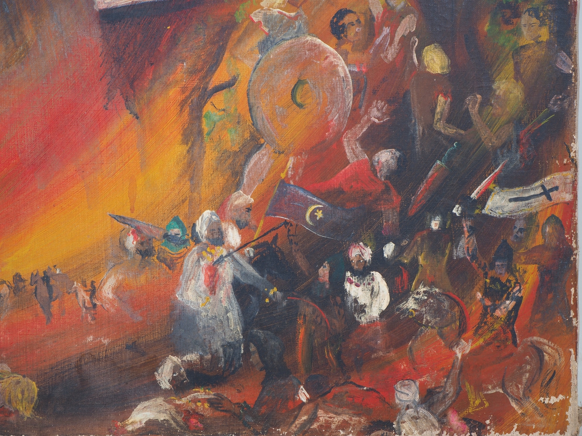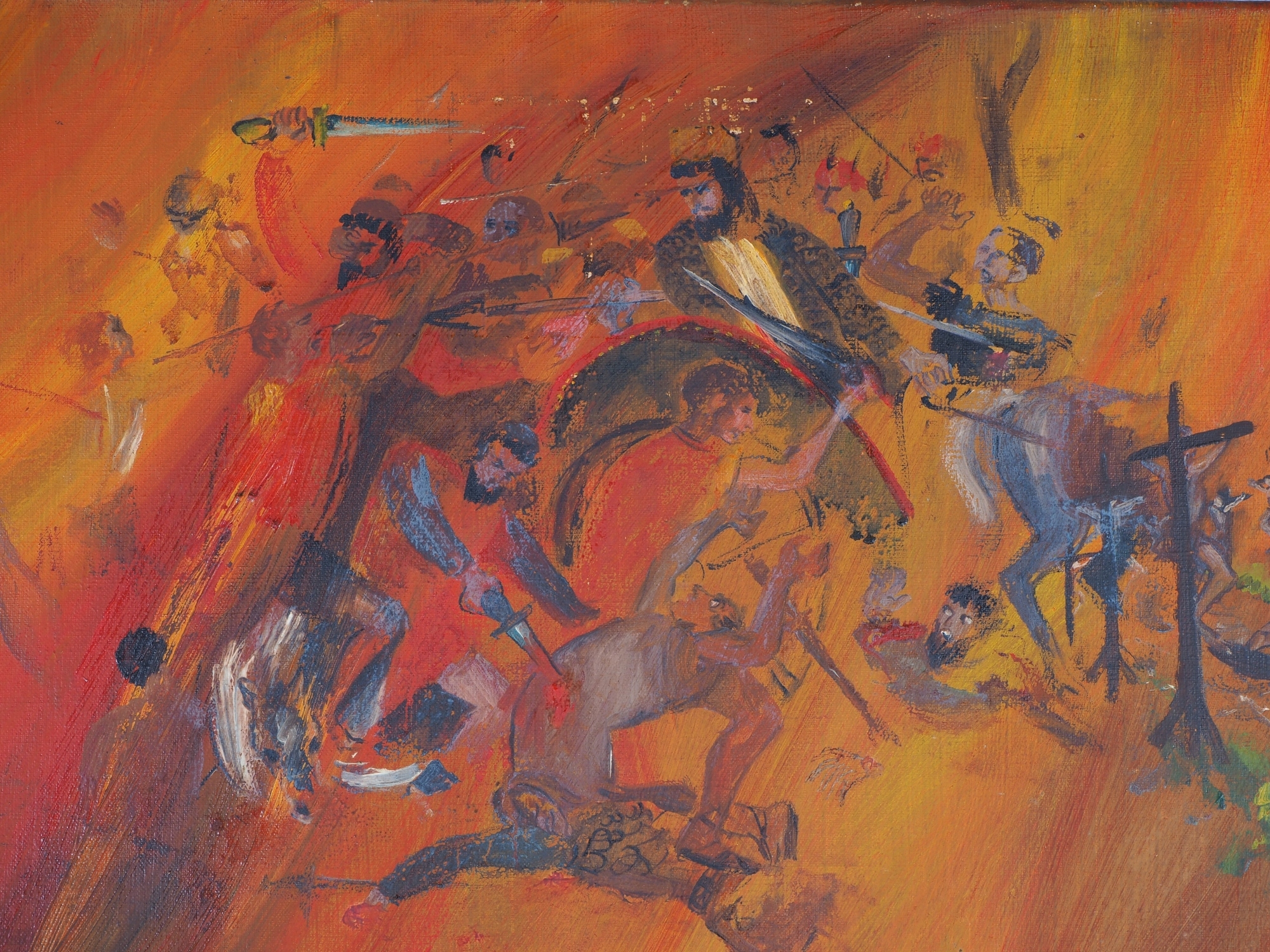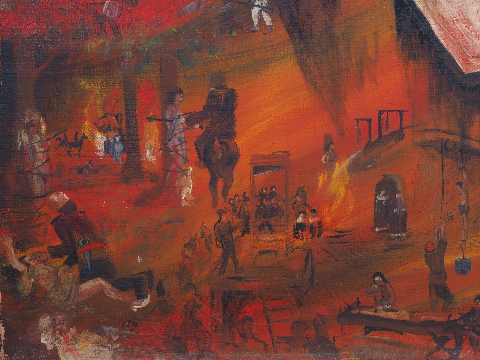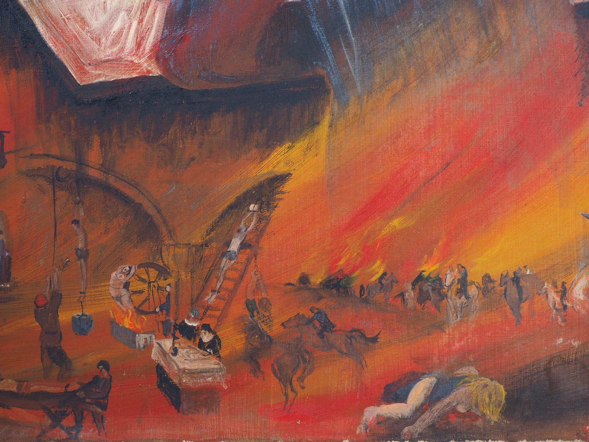 Das großformatige Gemälde aus dem Jahr 1954 zeigt ein dramatisch inszeniertes Tableau von Gewalt, Macht und Zerstörung. Im Zentrum des Bildes stehen historische Figuren wie Adolf Hitler und der röm. Kaiser Augustus mit Napoleon und einer weiteren Personen an einem Kartentisch, was auf militärische Planung und Machtanspruch verweist. Das Bild ist durchzogen von expressiven Rot- und Orangetönen die an Feuer und Vernichtung erinnern, um das Zentrum entfalten sich verschiedene Szenen von Krieg, Leid und Zerstörung. U.a. Steinigungen, Kreuzigungen, Massakern, Eroberungskriege, Folter, Sklaverei, Genozid usw.