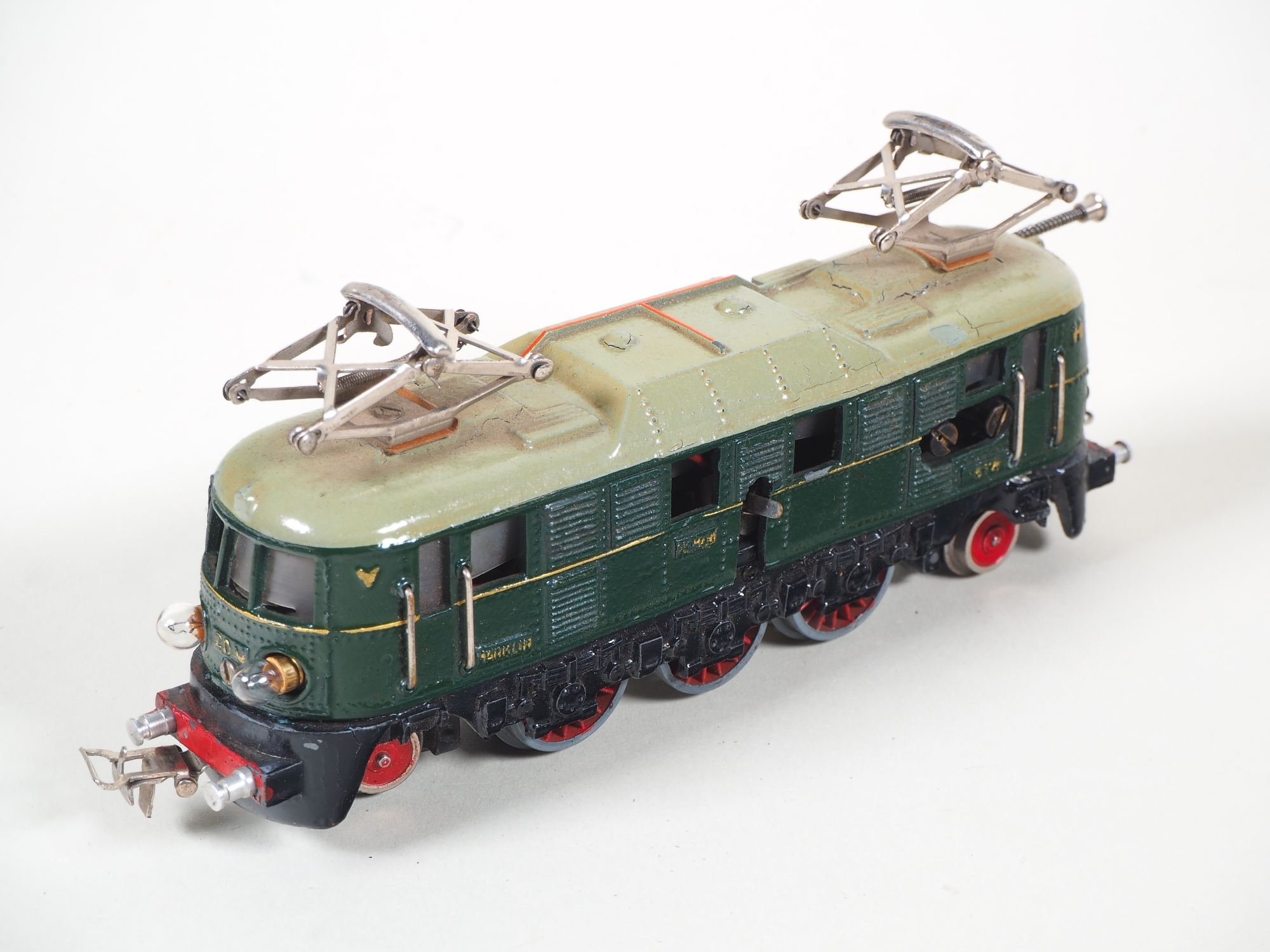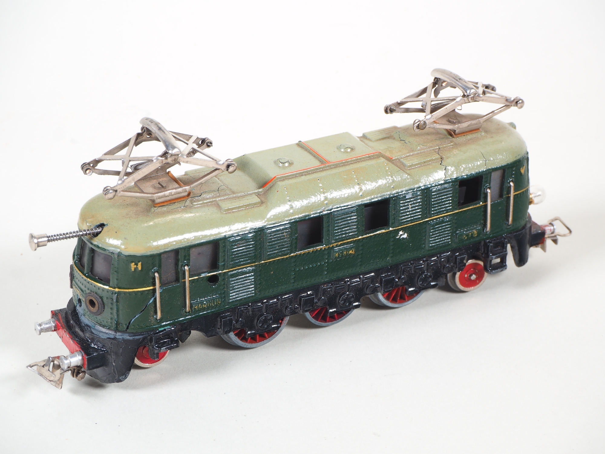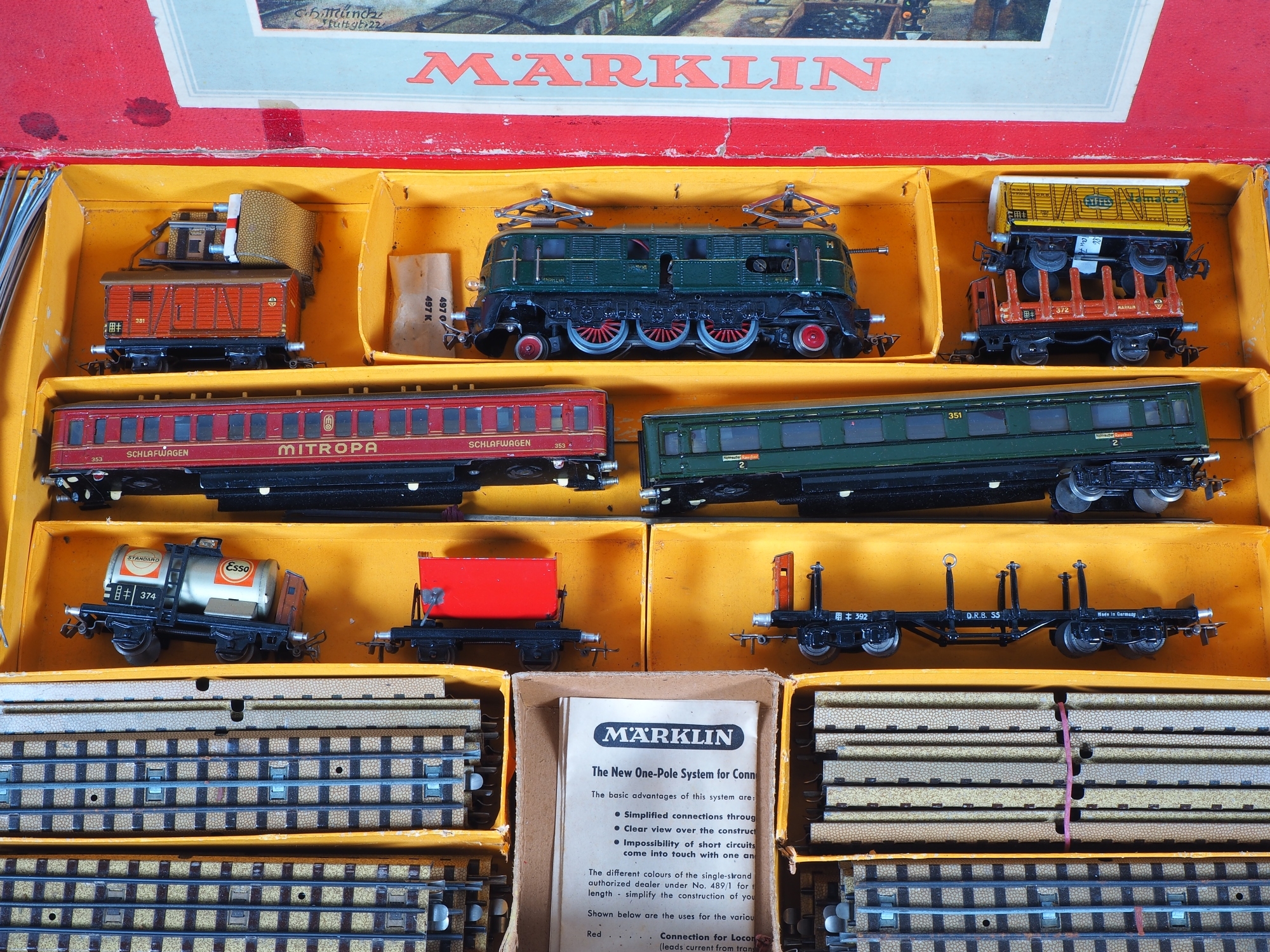 Set beinhaltet: frühe elektrische Lokomotive, Guss-Gehäuse, offene Bürstenkammer, Handumschalter hinten am Dach, Aufschrift HS 800, dunkelgrüner Firnislack, Vorne geschraubte Zweilicht-Spitzensignal Glühbirnen. 1 Kesselwagen 374 ESSO (Version 1939), 1 Mulden-Kippwagen, 1x 392 Langer Rungenwagen mit Bremserhaus (D.R.B. SS, von 1937), 1x 372 Kurzer Rungenwagen mit Bremserhaus (Version 1941), 1x 382 Bananenwagen Jamaica (Version: 1946), 1x 381 Gedeckter Güterwagen (Version 1940), 1x Mitropa Schlafwagen 353 ohne Achse, 1x Personenwagen 351 ohne Achse. Mit Schienensatz und Prellbock. Märklin Originalverpackung mit Anleitung auf Englisch (ON 1047 / 474/4-100/2). Set nicht auf Vollständigkeit oder Zusammengehörigkeit geprüft.