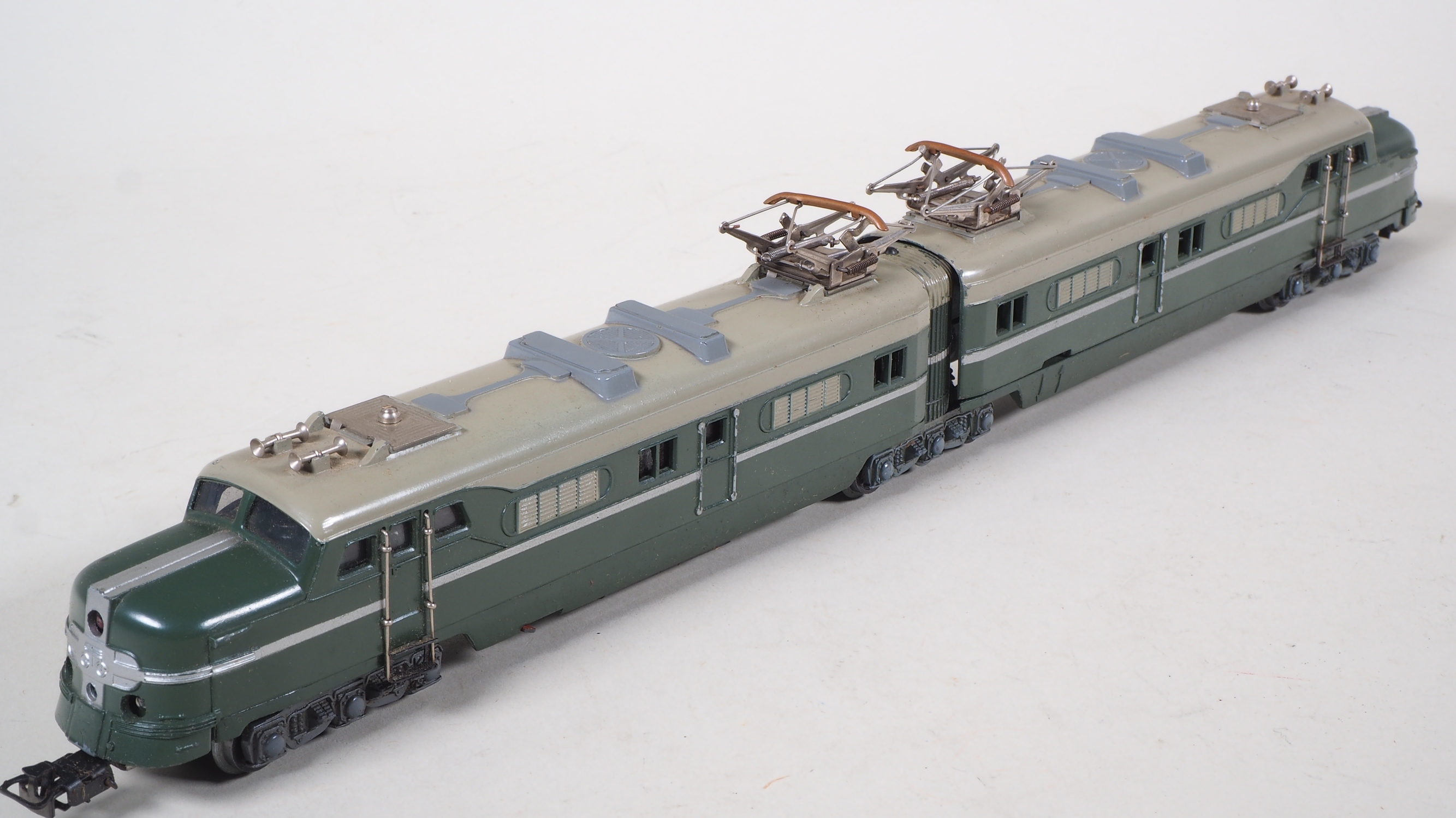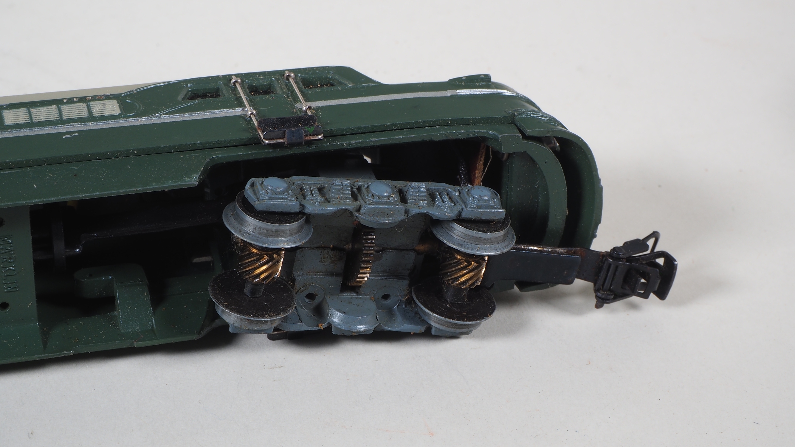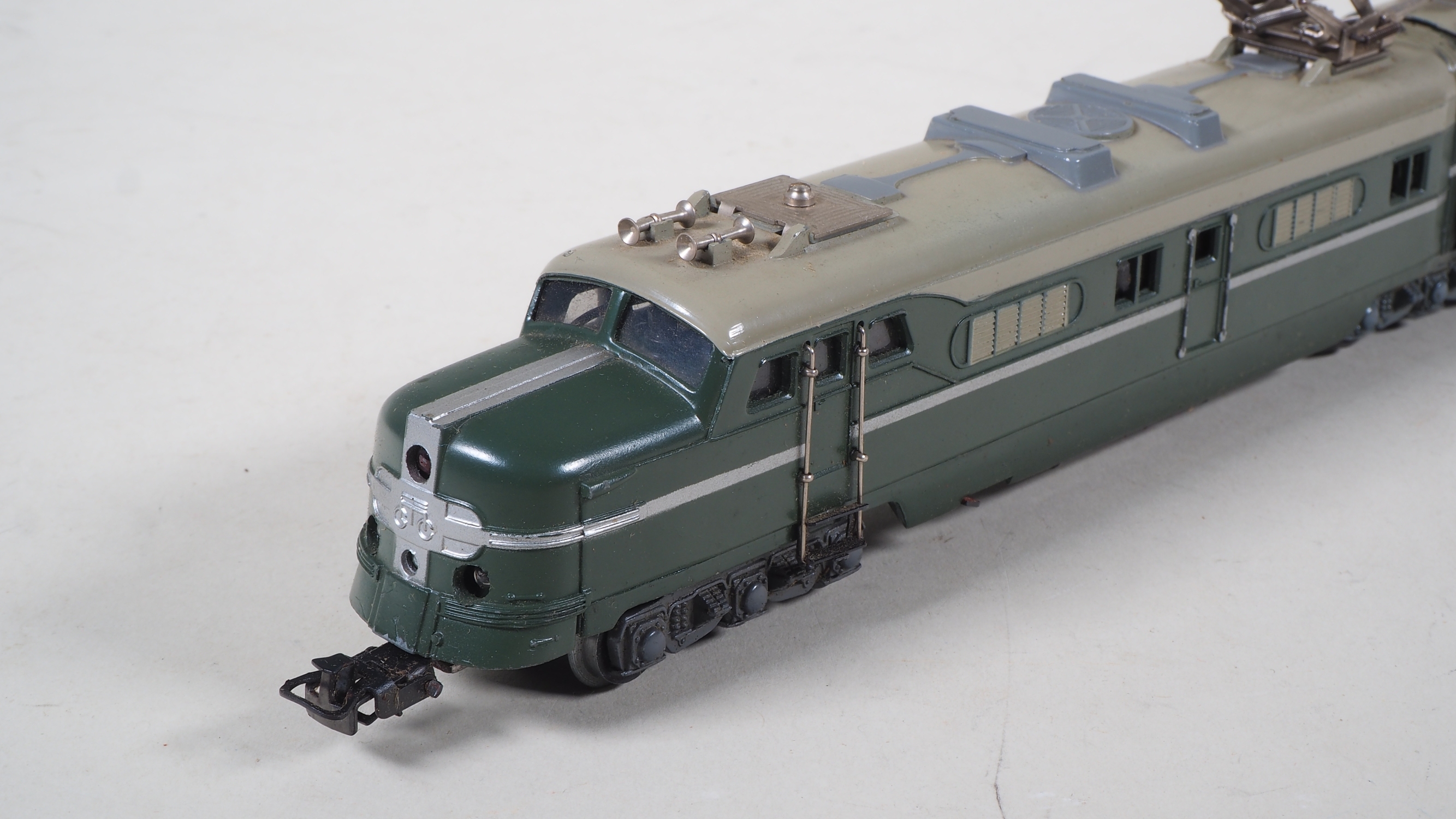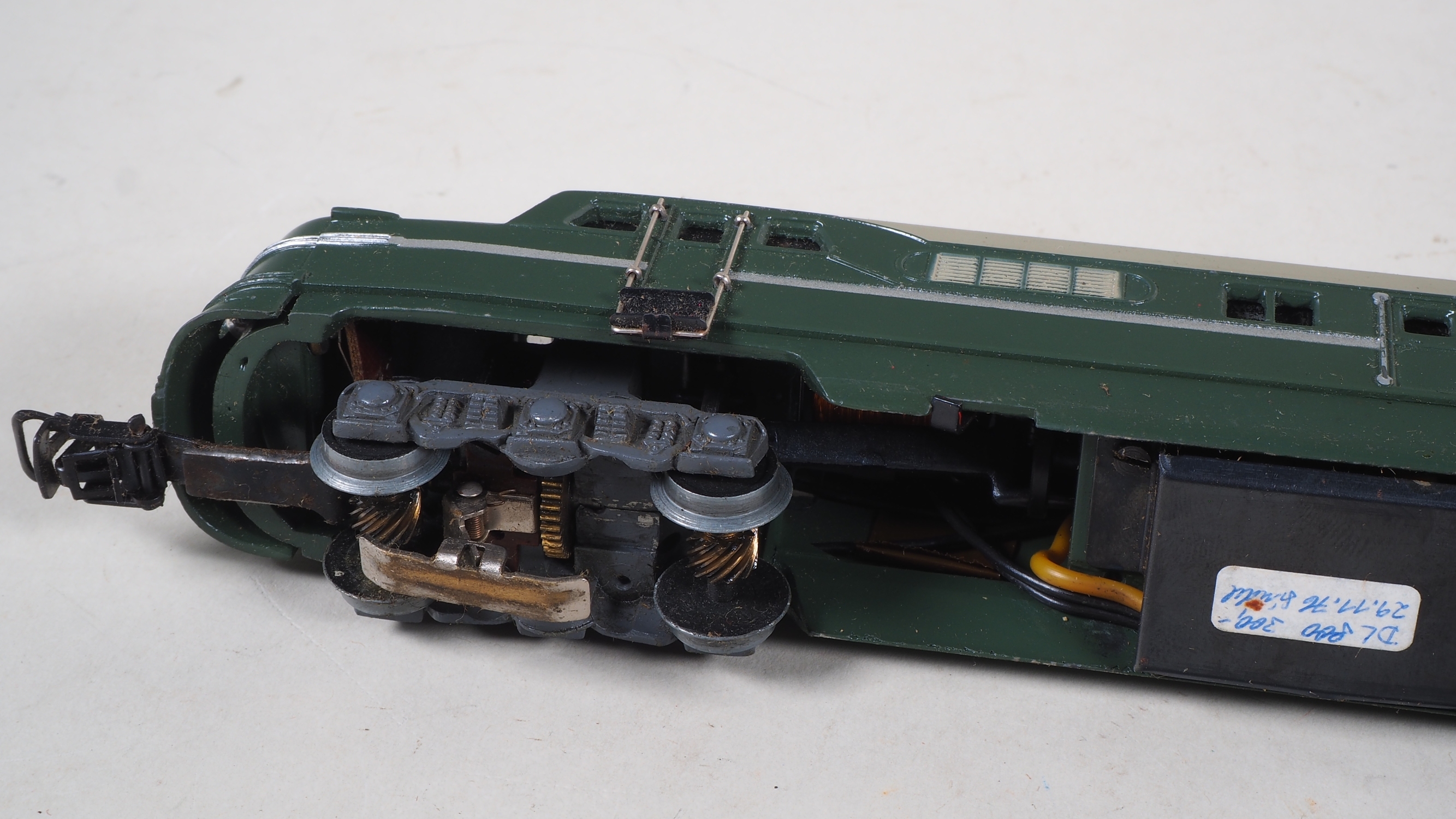 Olivgrün E-Lok, Guss, Dach grau. Mit Bügelkuppelung, Achsfolge Bo’Bo’Bo, Spitzensignalwechsel drei Frontlichter, zwei Stromabnehmer. Sehr guter Zustand mit kleinen Lackschäden in rot-rautierter Originalverpackung, welche beschädigt ist (siehe Bilder). Nicht auf Vollständigkeit und Funktionstüchtigkeit geprüft. Die DL 800 wird von Sammlern auch als Zugmonster bezeichnet, welche viele Gusswagen ziehen konnte.