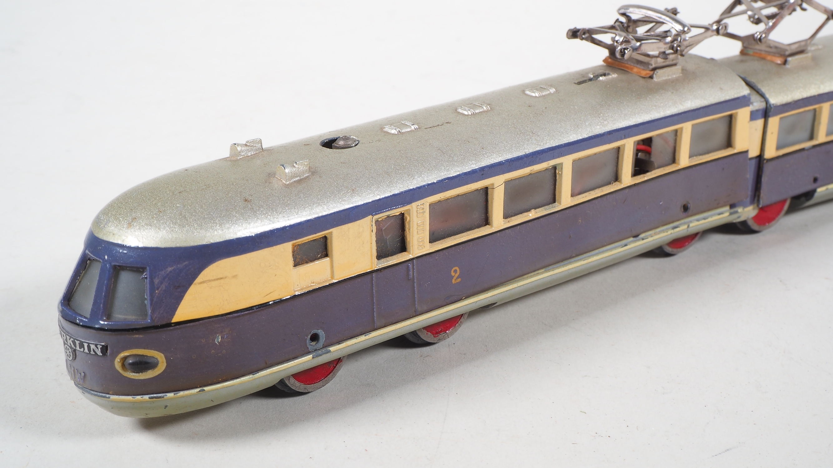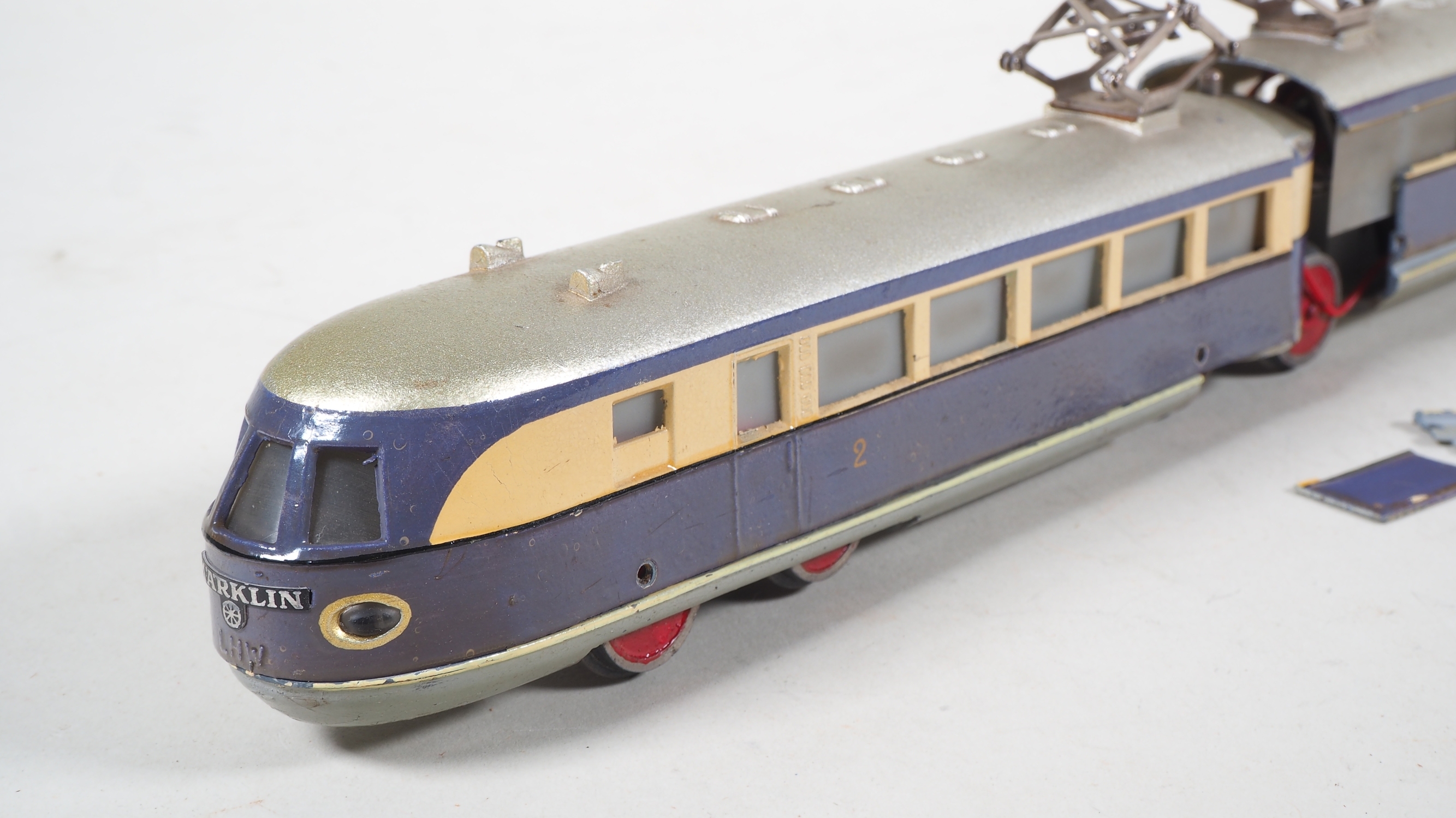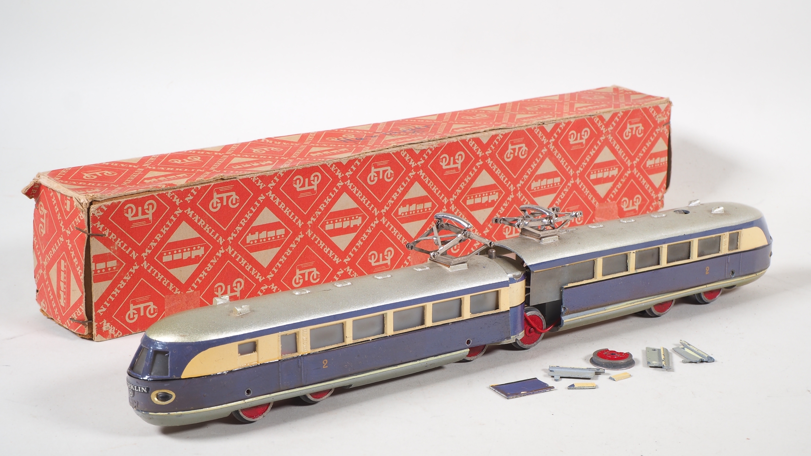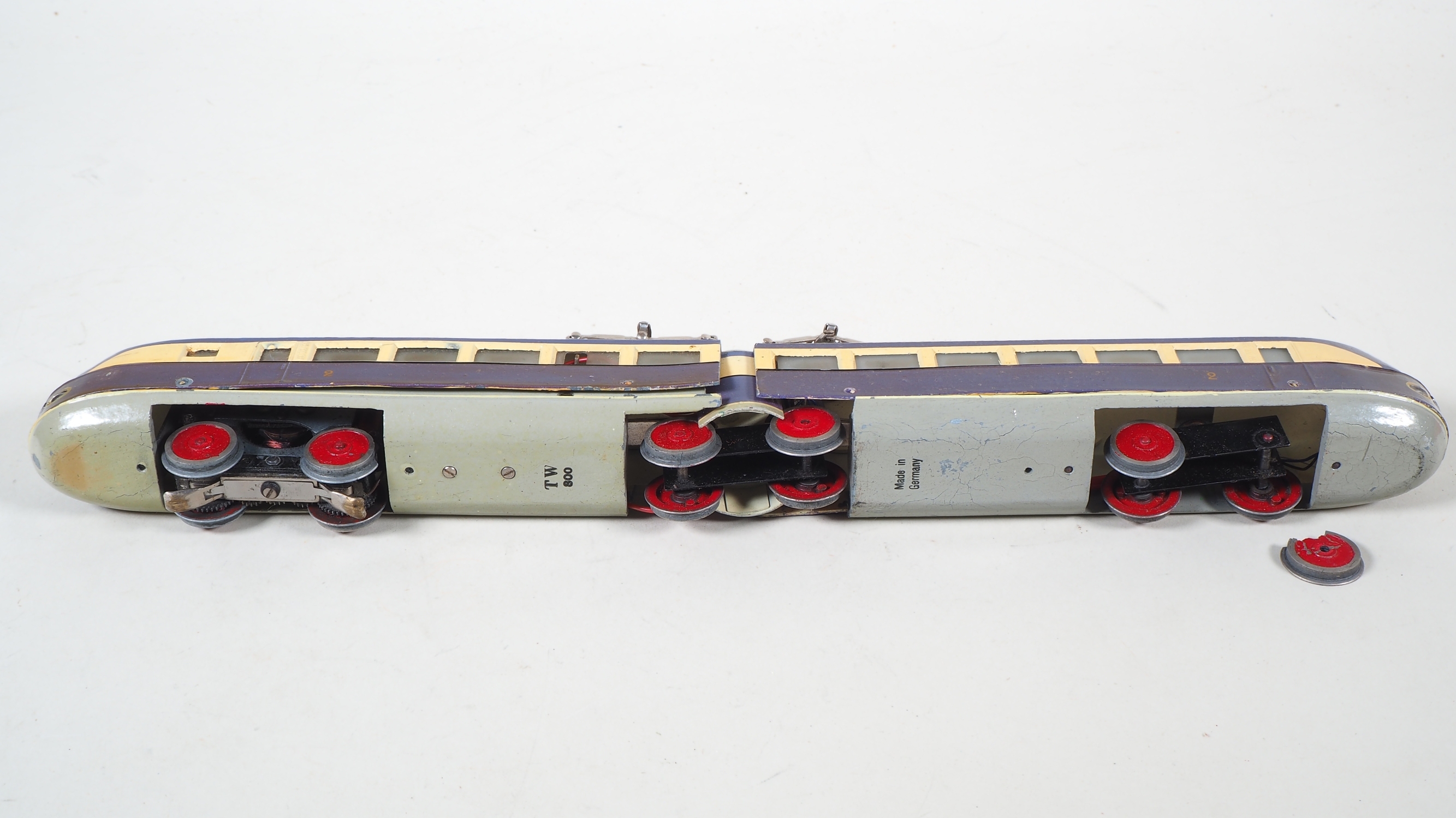 zweiteiliges Gussgehäuse mit einem Motor, mittleres Drehgestell aus Eisenblech und mit Handumschalter, violett/creme Lackierung, an den Enden mit geschwungener Märklin Plakette aus Eisenblech, Boden mit Stempelung "TW800 / Made in Germany". Zweilicht-Spitzensignal. Sehr gute Restaurationsbasis, Gehäuseteile im mittleren Teil mit Ausbrüchen, die Ausbruchteile liegen jedoch lose anbei, Räder Stellenweise mit kleineren Ausbrüchen. Gehäuse nicht verschraubt und Lose auf Fahrgestell. L. 38,5cm. In Originalverpackung mit Etikett.