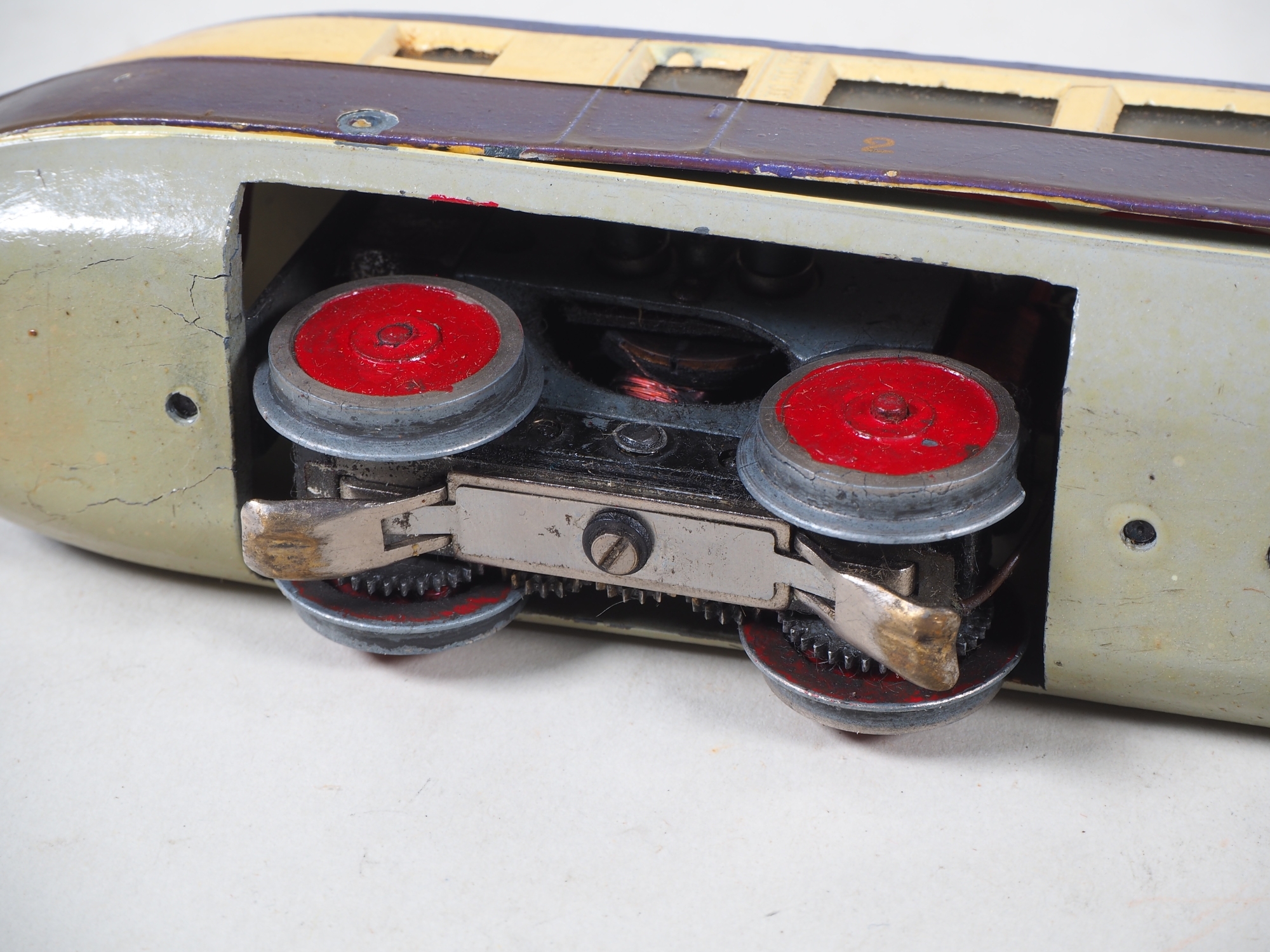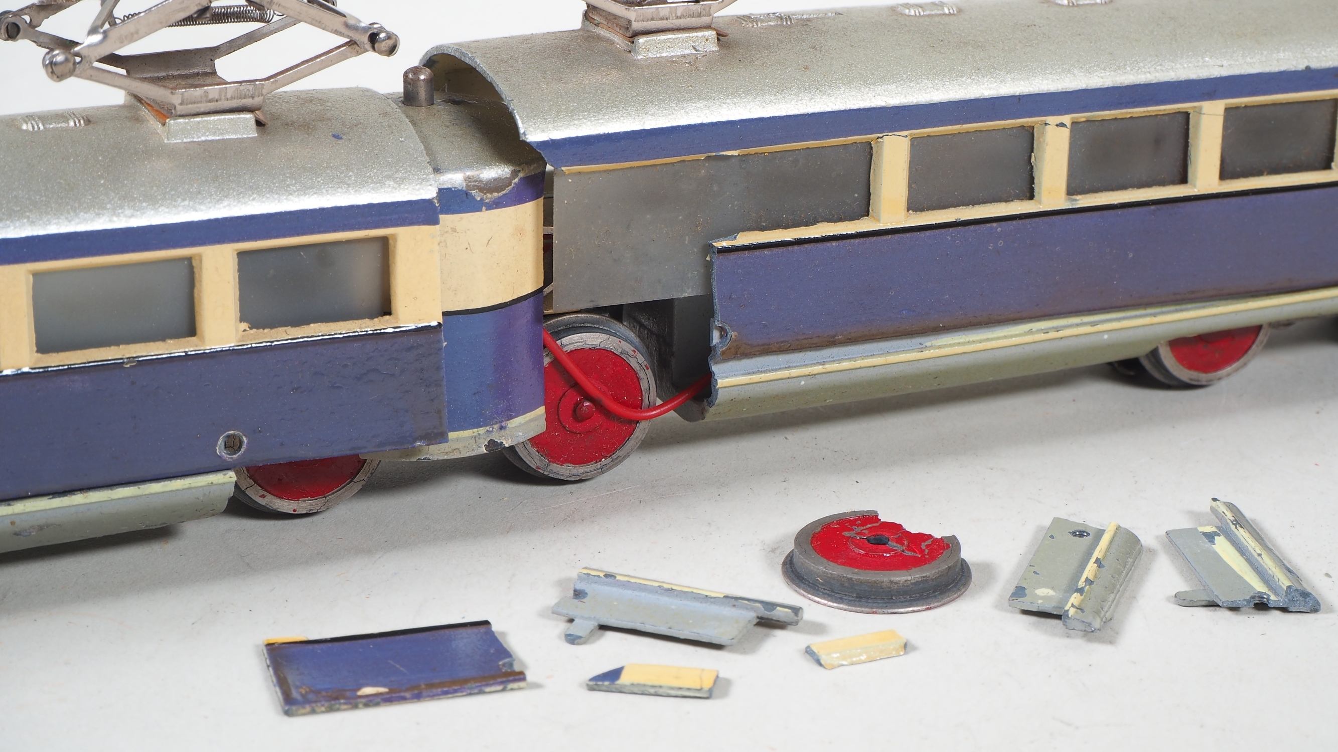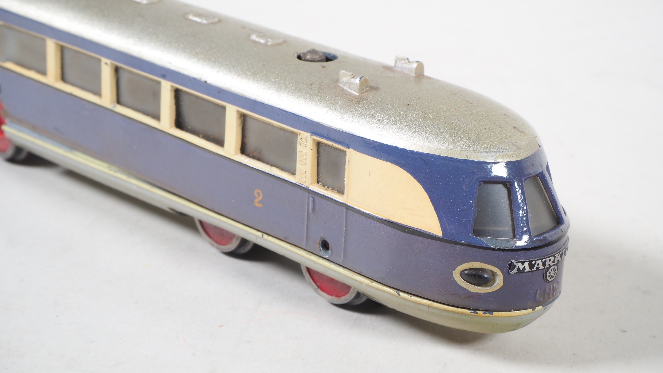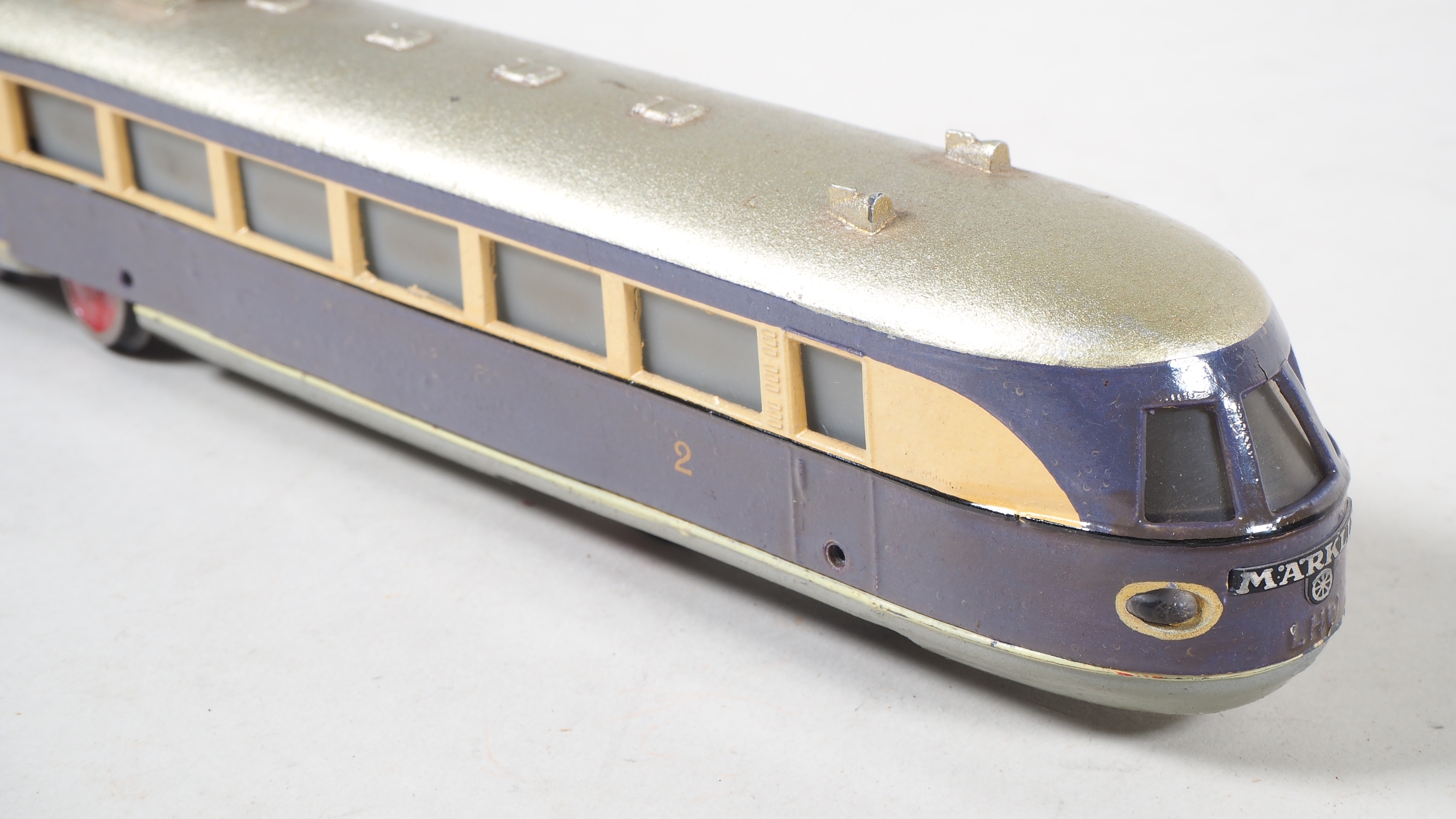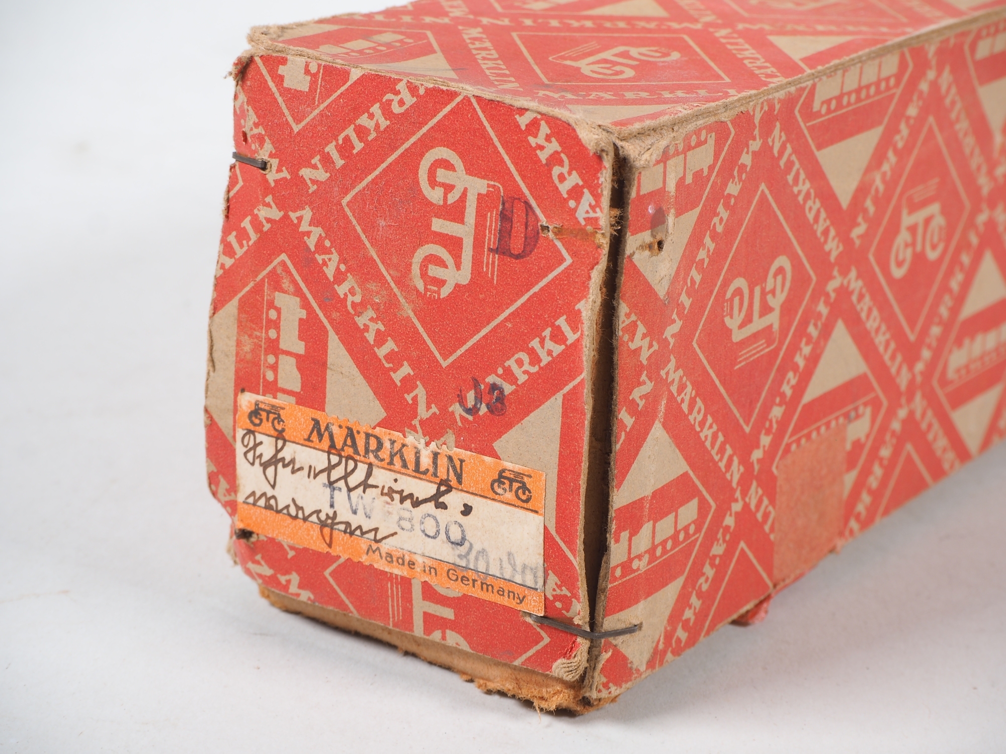 zweiteiliges Gussgehäuse mit einem Motor, mittleres Drehgestell aus Eisenblech und mit Handumschalter, violett/creme Lackierung, an den Enden mit geschwungener Märklin Plakette aus Eisenblech, Boden mit Stempelung "TW800 / Made in Germany". Zweilicht-Spitzensignal. Sehr gute Restaurationsbasis, Gehäuseteile im mittleren Teil mit Ausbrüchen, die Ausbruchteile liegen jedoch lose anbei, Räder Stellenweise mit kleineren Ausbrüchen. Gehäuse nicht verschraubt und Lose auf Fahrgestell. L. 38,5cm. In Originalverpackung mit Etikett.
