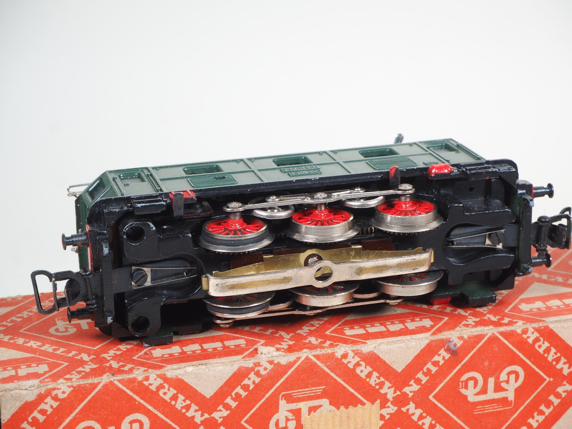 Dunkelgrünes Guss-Gehäuse mit silbergrauem Dach. Erhabene, Aufschriften "Märklin RSM800 / Germany". Gehäuse intakt, ohne Zinkfraß. Vorne Zweilicht-Spitzensignal. L. über Puffer 13cm. In Originalverpackung mit Etikett.